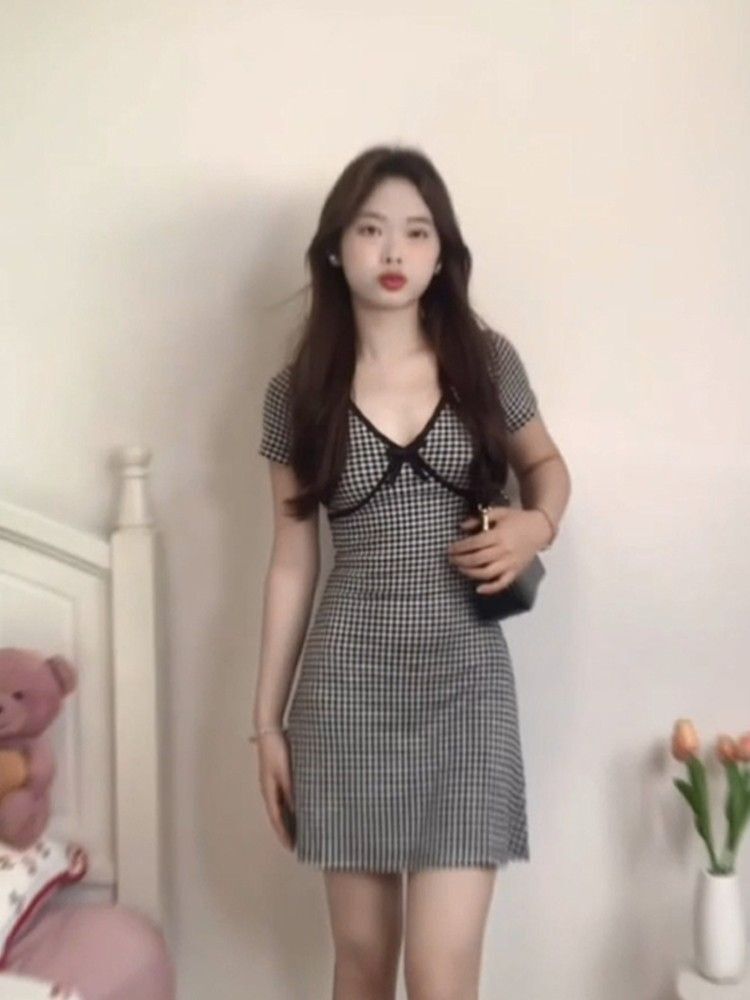 • French V-neck bow plaid dress for women, 2024 summer new style, sexy and alluring, waist-cinching and hip-hugging.