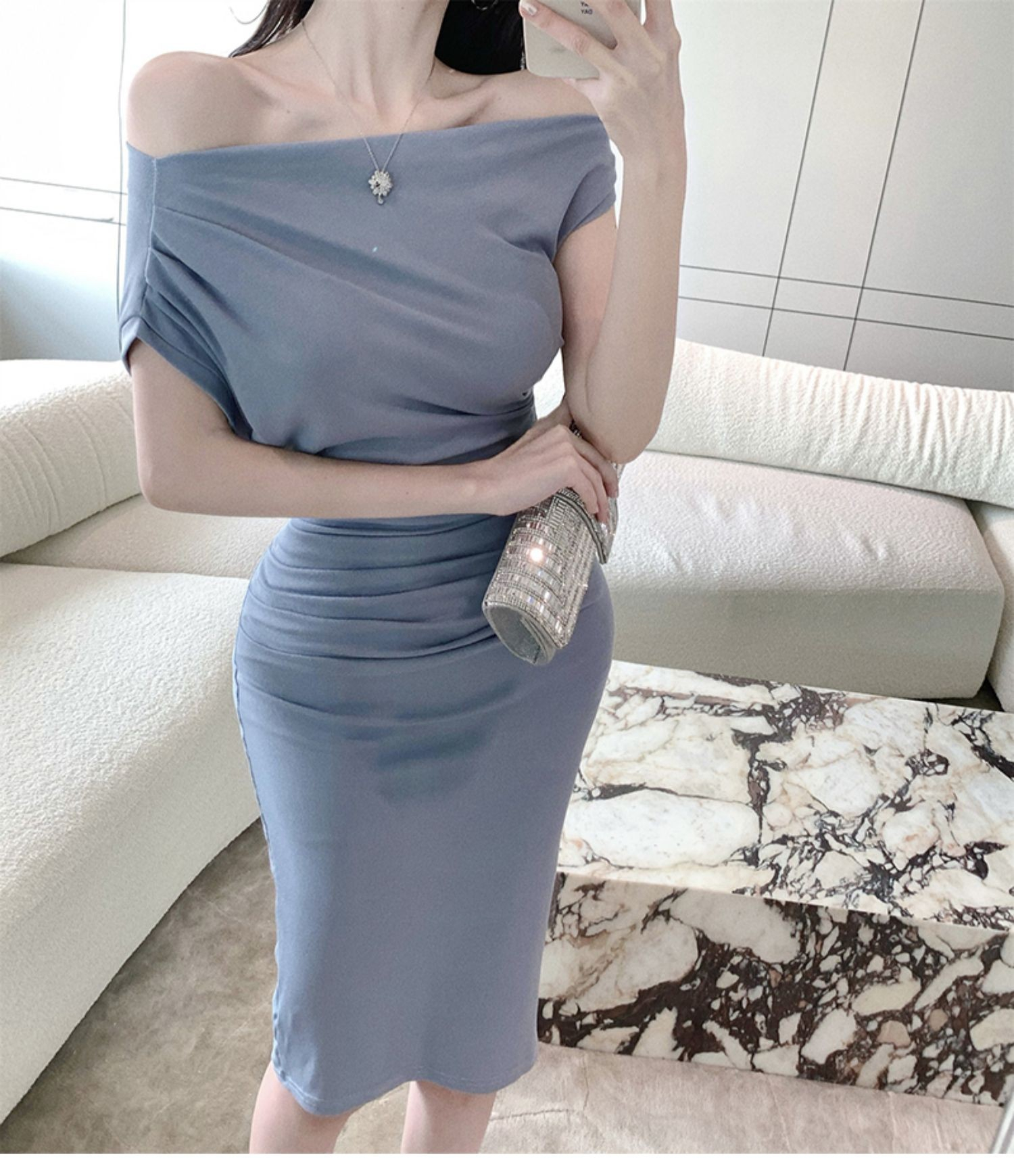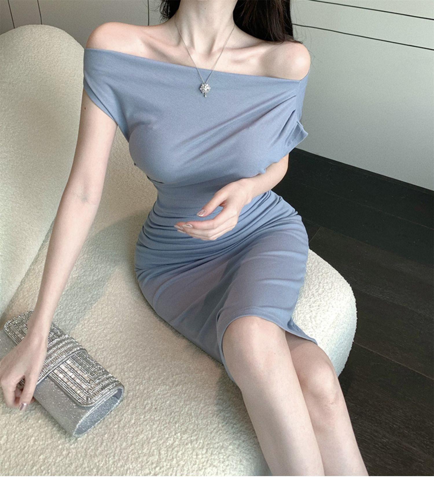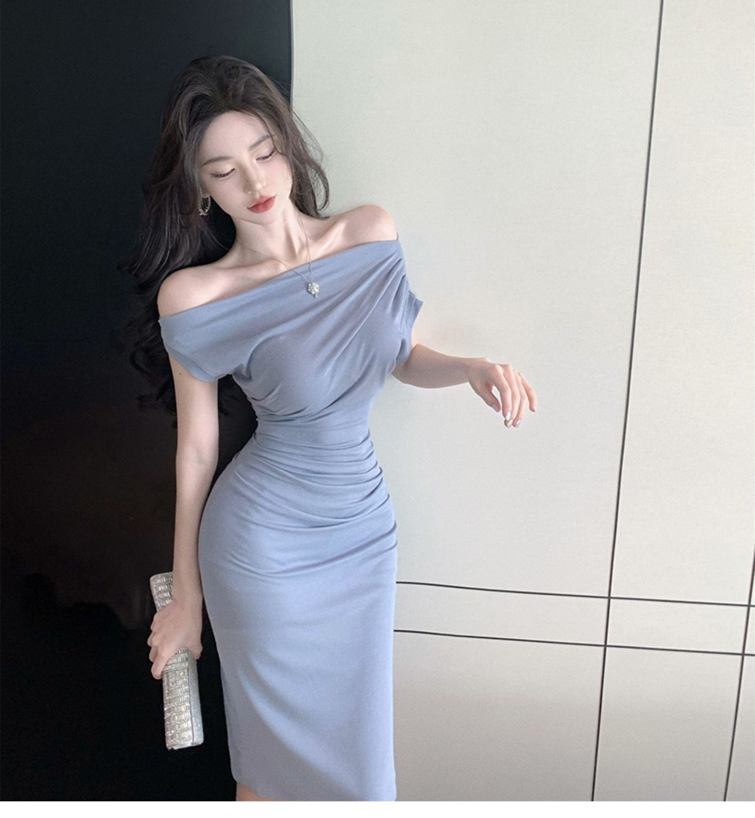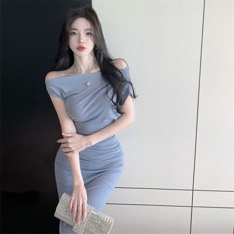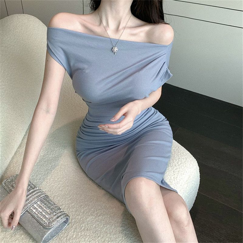• 2024 Sexy Off-Shoulder Short-Sleeve Bodycon Dress, One-Shoulder Mid-Length, Ruffled Waist, Asymmetrical Neck, Pure and Alluring Style
