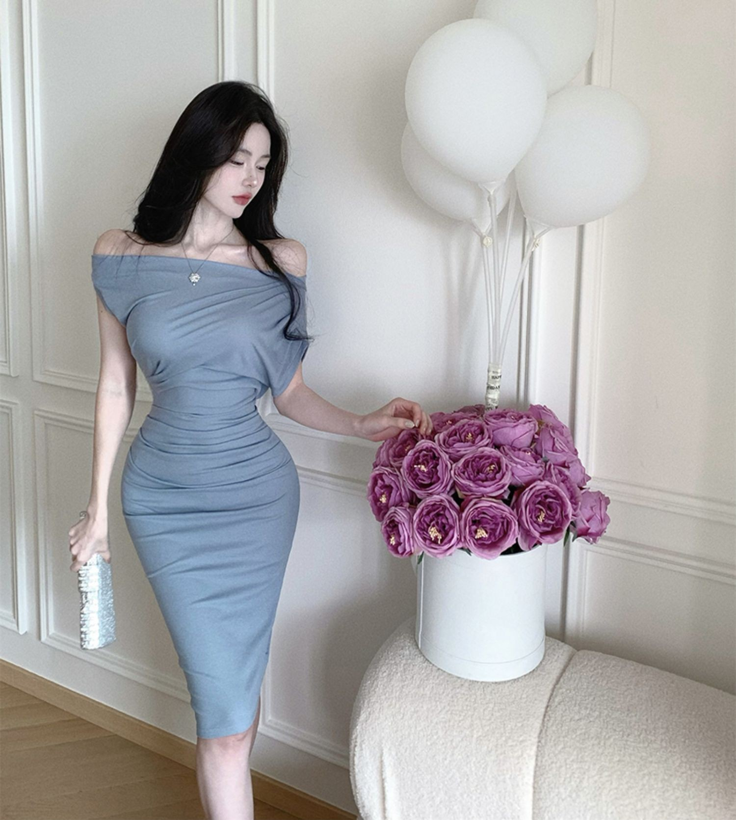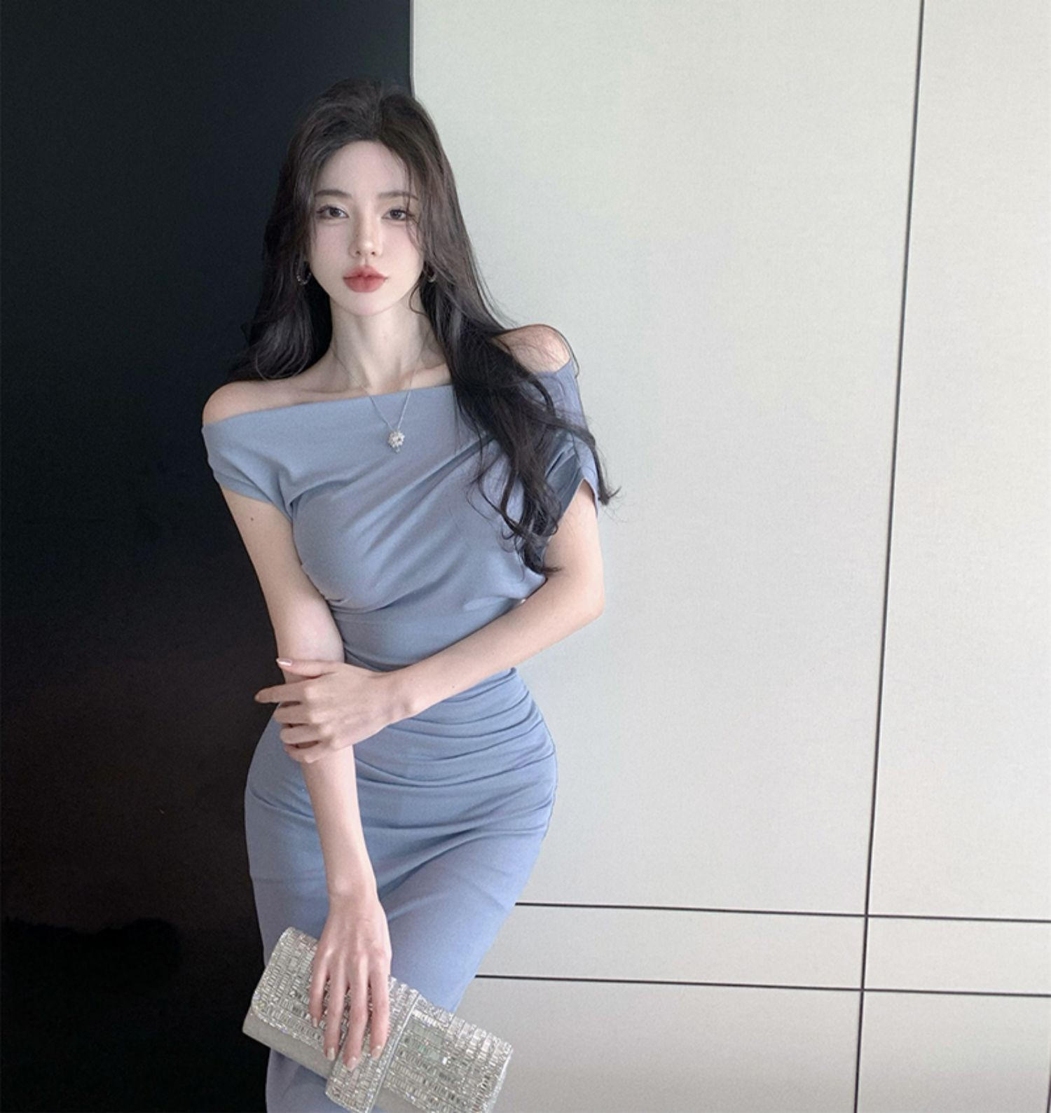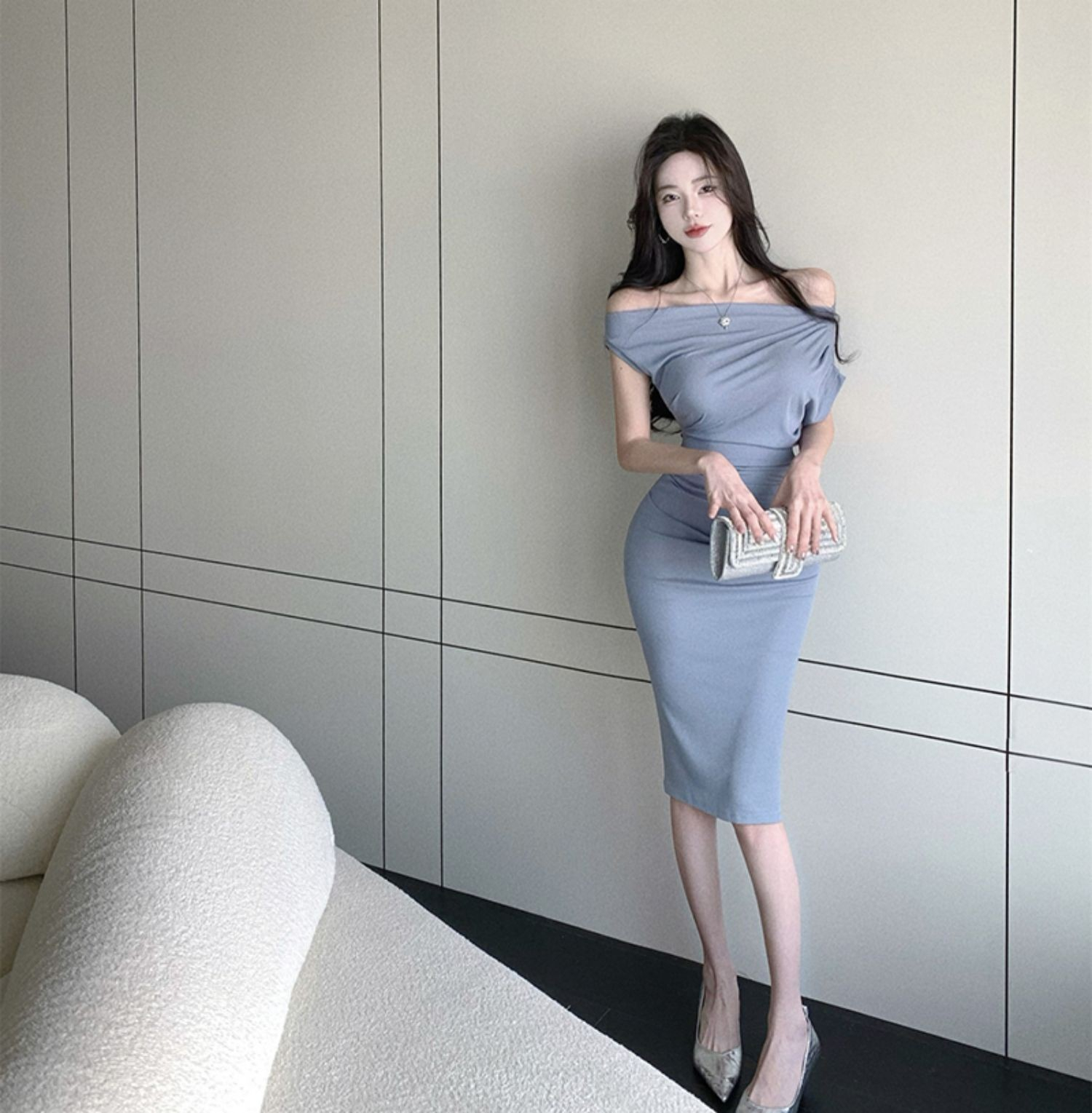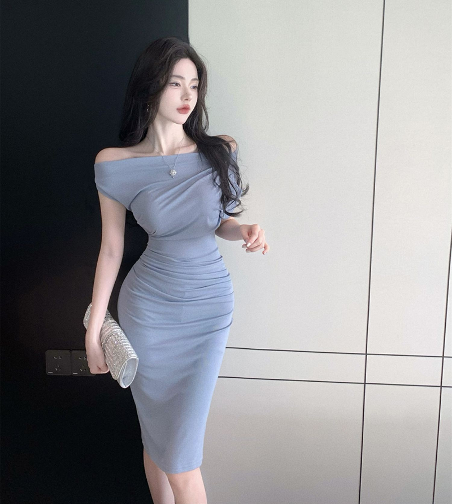 • 2024 Sexy Off-Shoulder Short-Sleeve Bodycon Dress, One-Shoulder Mid-Length, Ruffled Waist, Asymmetrical Neck, Pure and Alluring Style