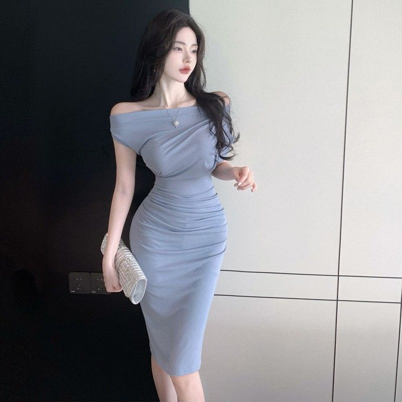 2024 Sexy Off-Shoulder Short-Sleeve Bodycon Dress, One-Shoulder Mid-Length, Ruffled Waist, Asymmetrical Neck, Pure and Alluring Style