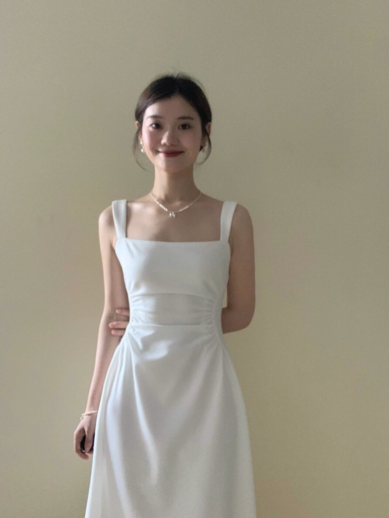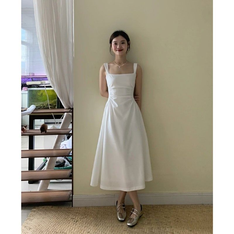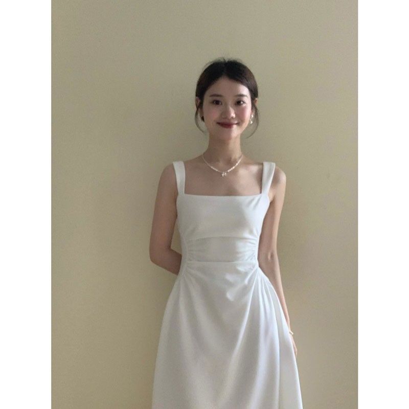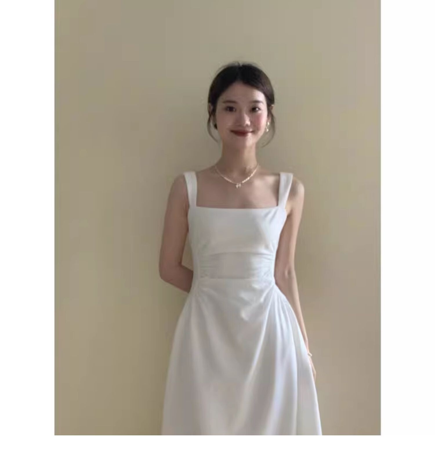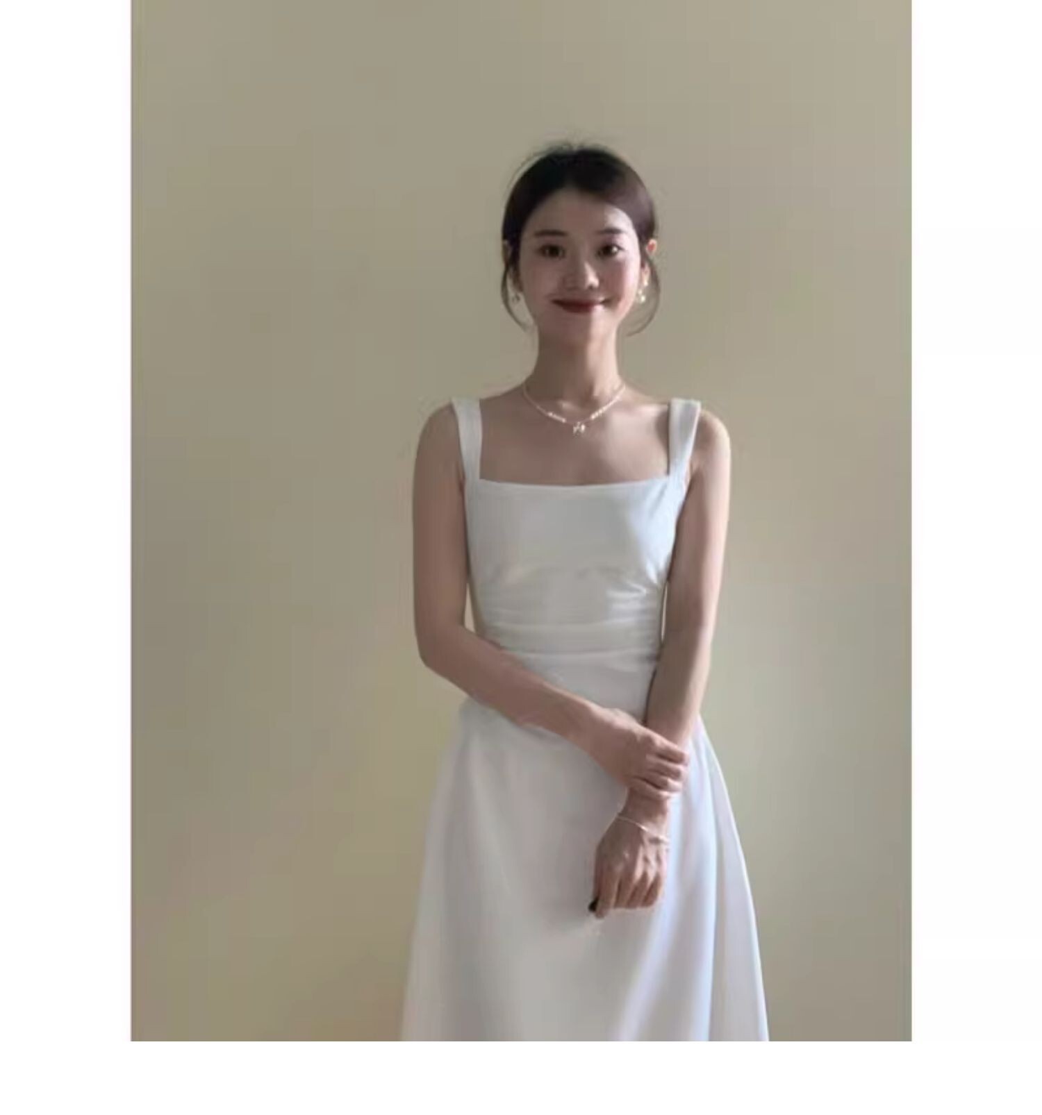 French-style elegant white slip dress with a slim waist and square neckline, perfect for a gentle and feminine look.