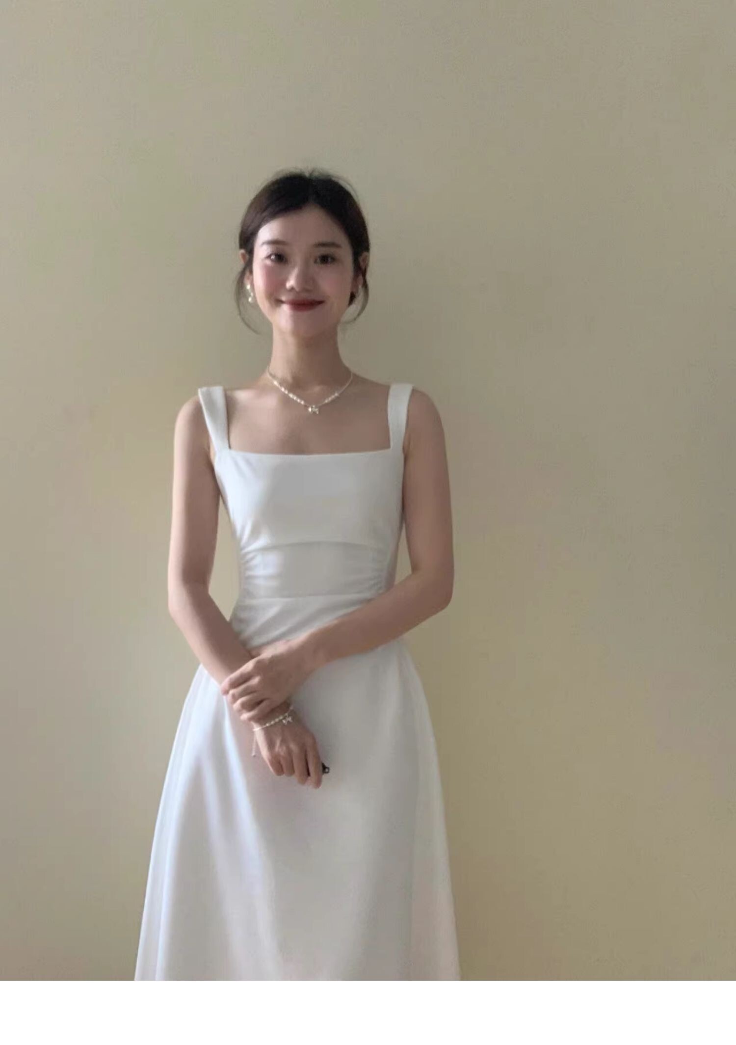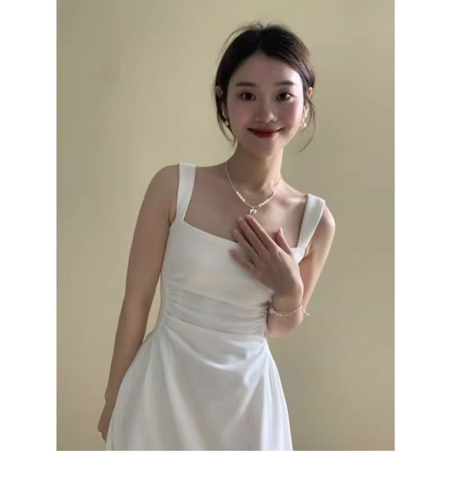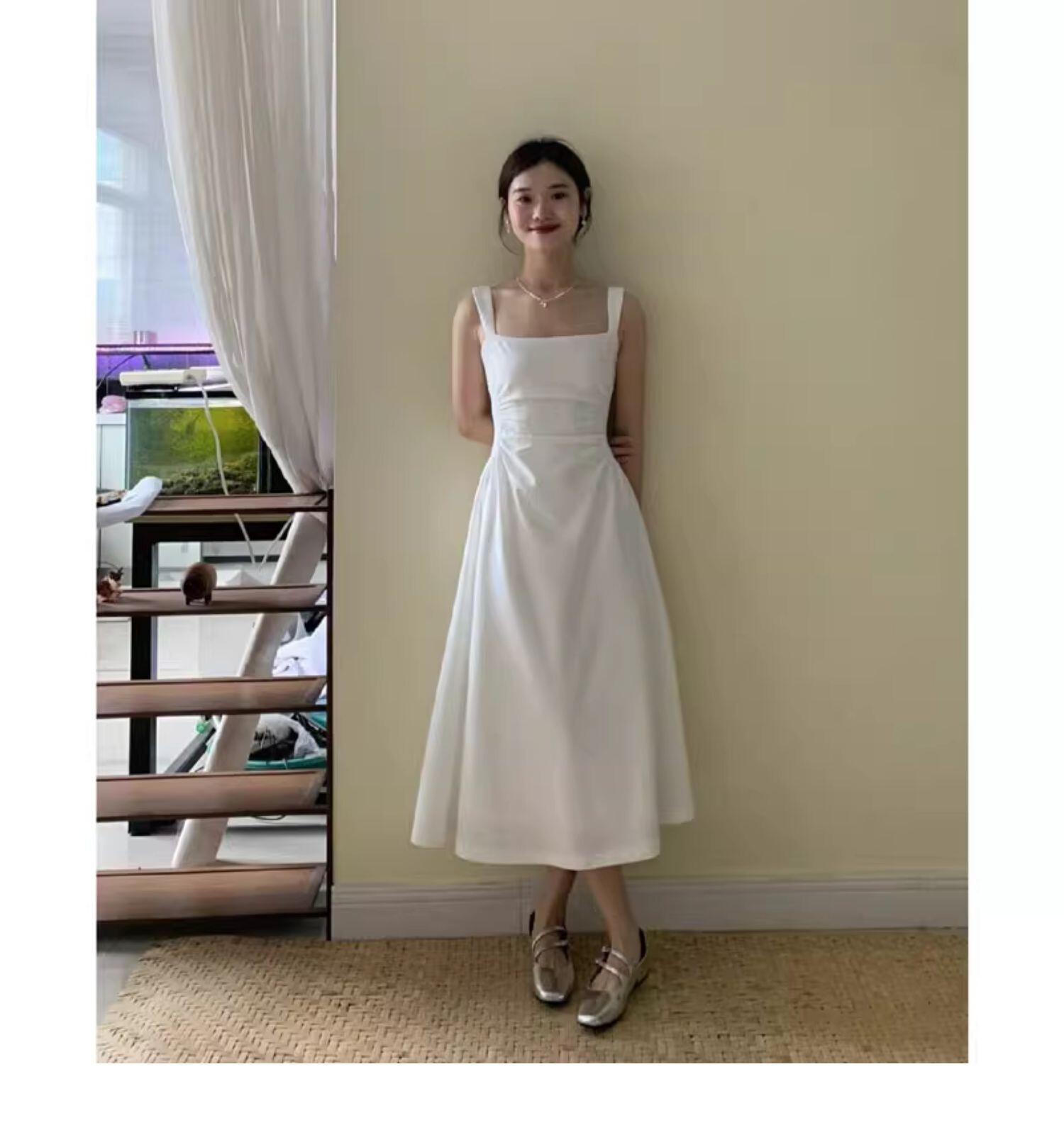• French-style elegant white slip dress with a slim waist and square neckline, perfect for a gentle and feminine look.