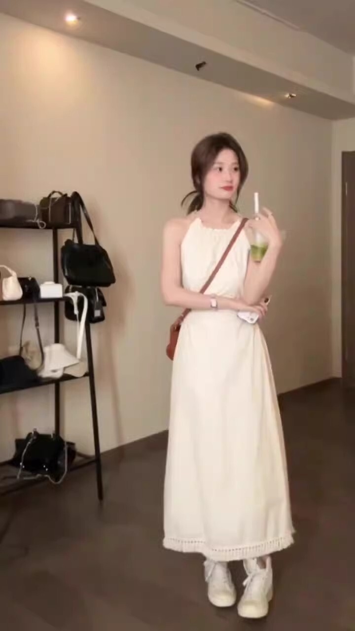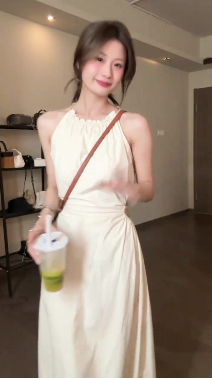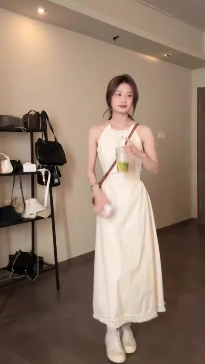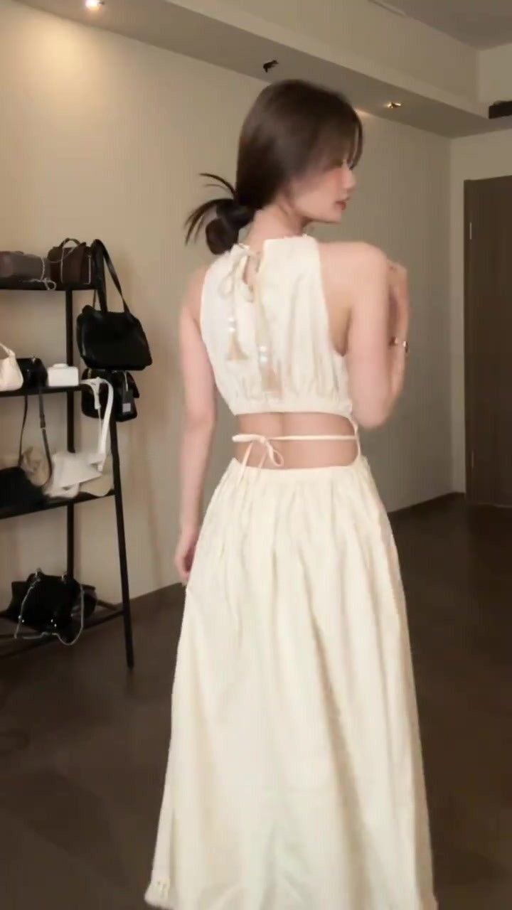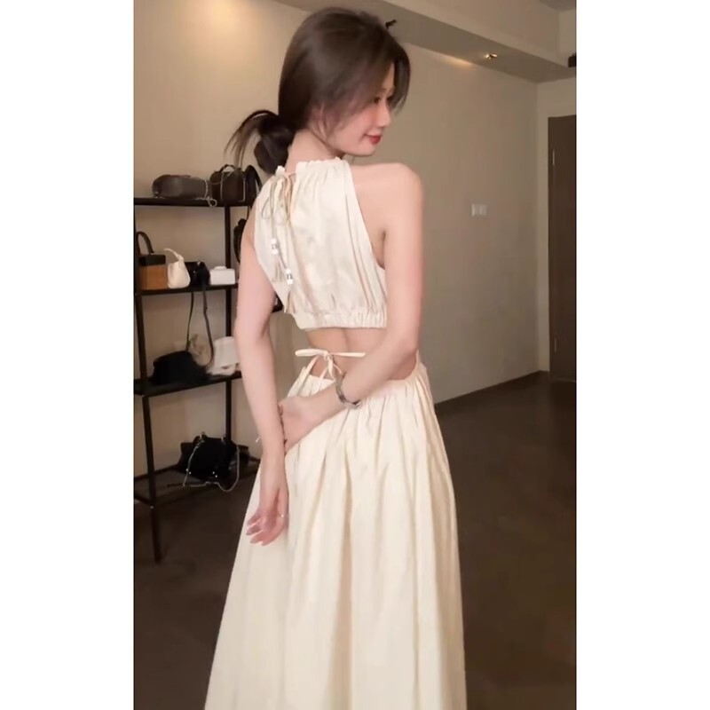 • A chic, French-inspired sleeveless halter-neck dress with a backless design and tie detailing, exuding a gentle and elegant charm.