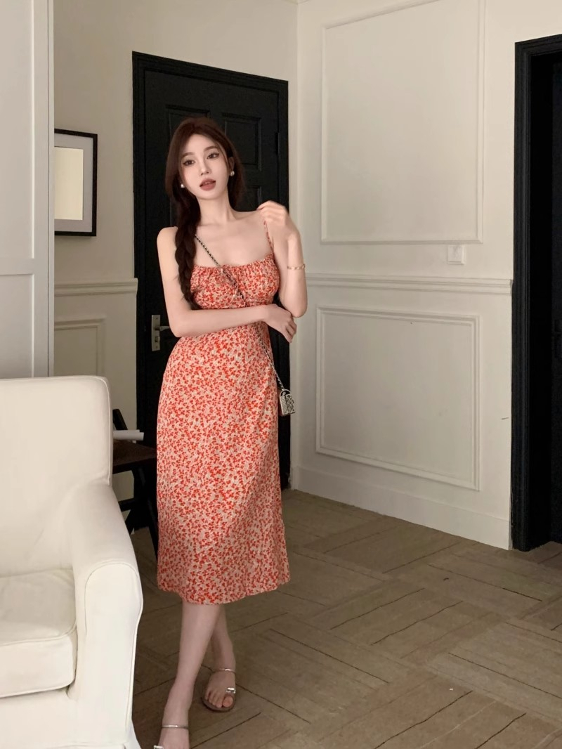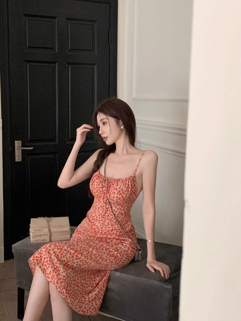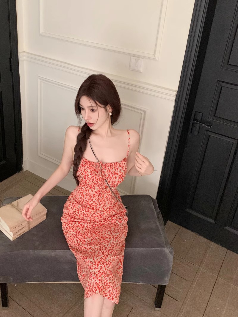 French-style floral print tie-up sundress, new summer style, slimming midi dress, red resort style dress.