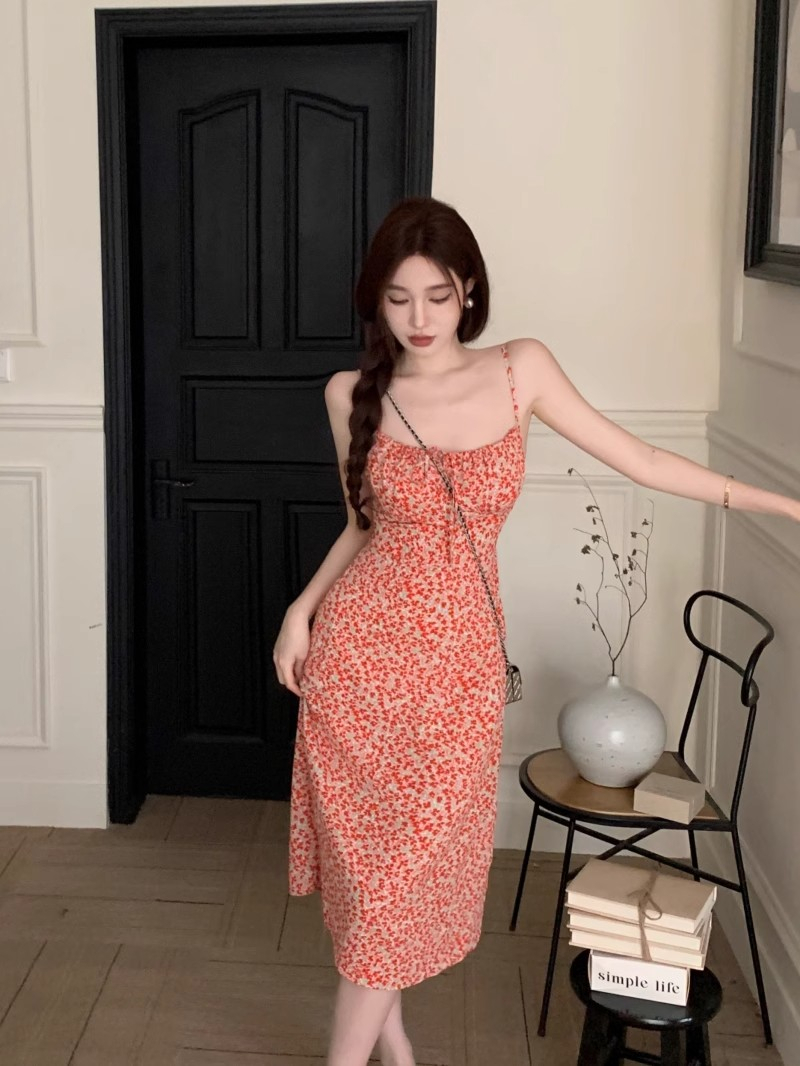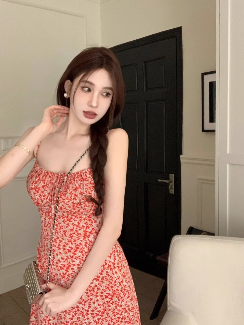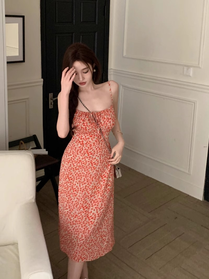 • French-style floral print tie-up sundress, new summer style, slimming midi dress, red resort style dress.