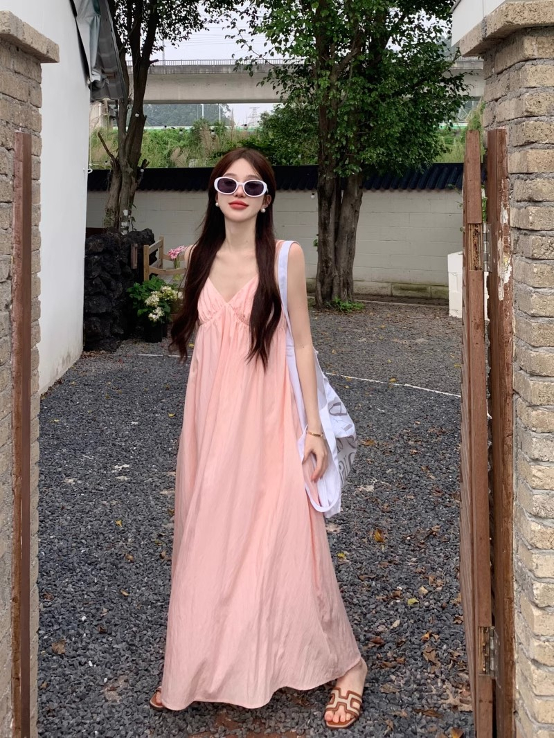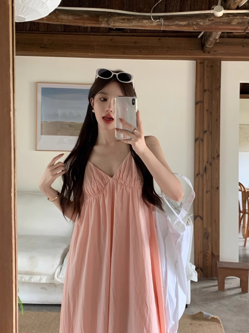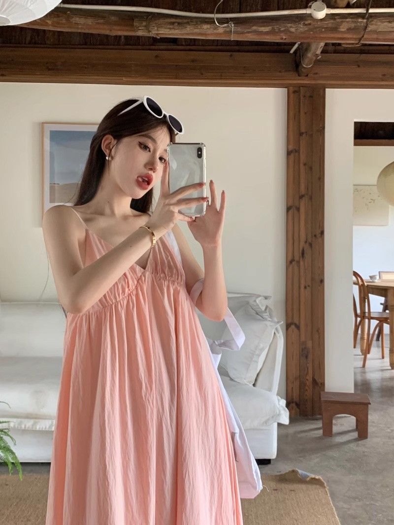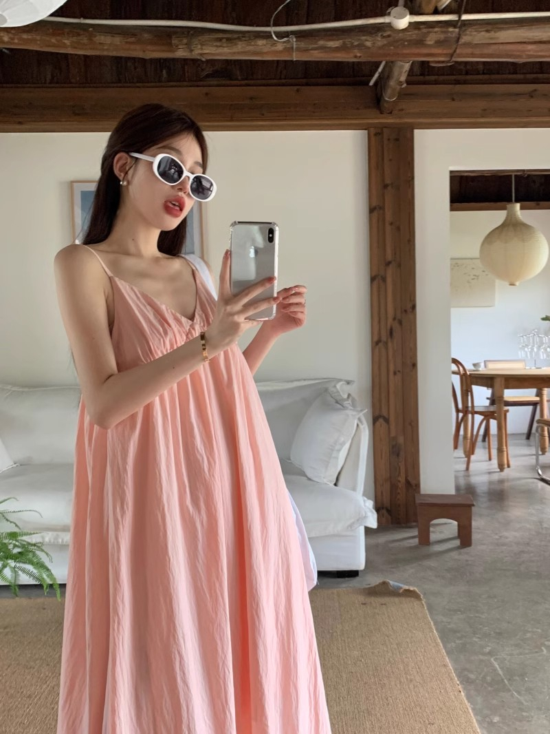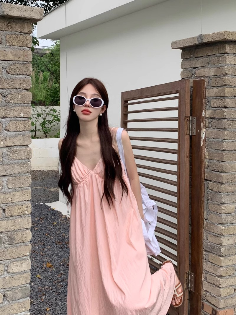• Pink sundress with French V-neck, loose fit, slimming, sleeveless, beach dress for summer, perfect for a beach vacation.