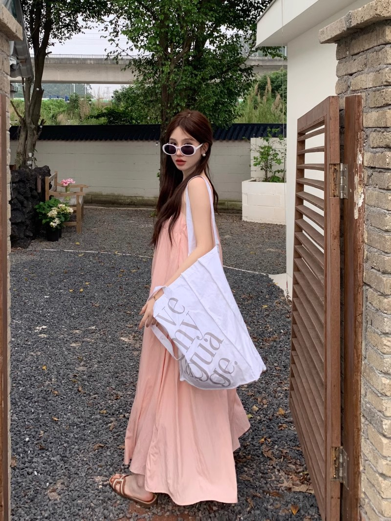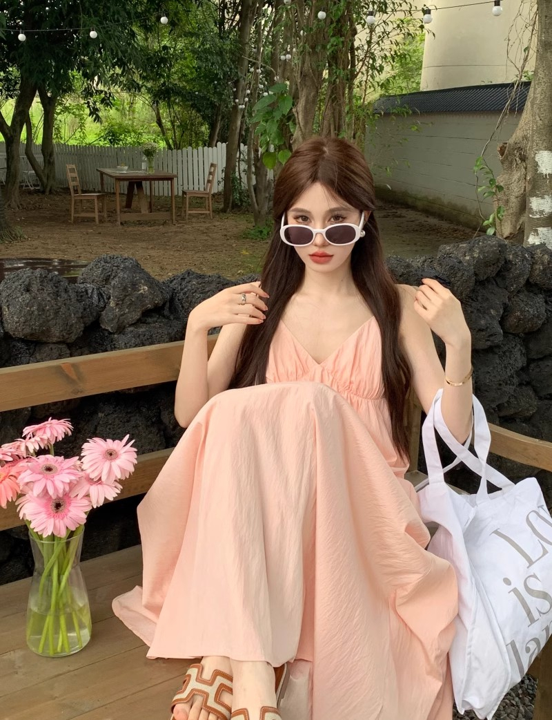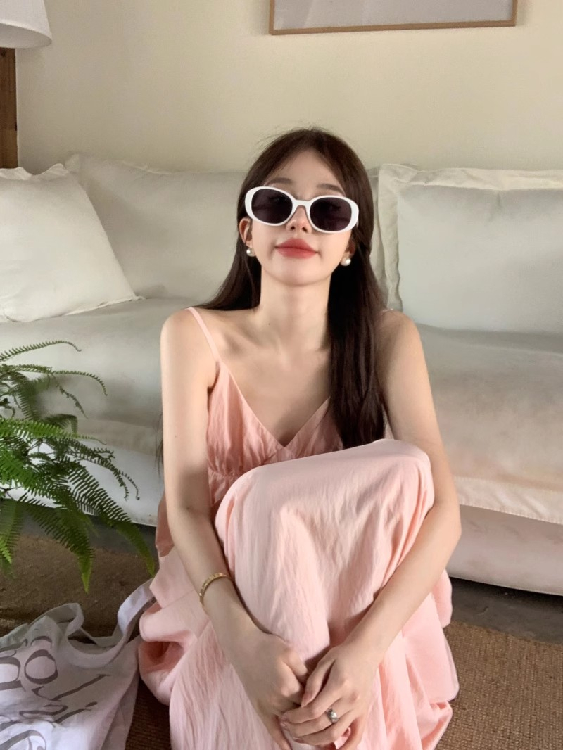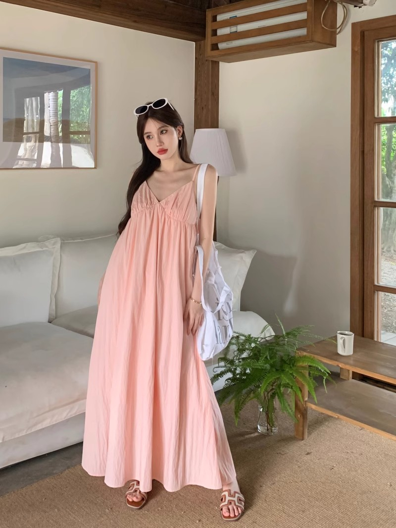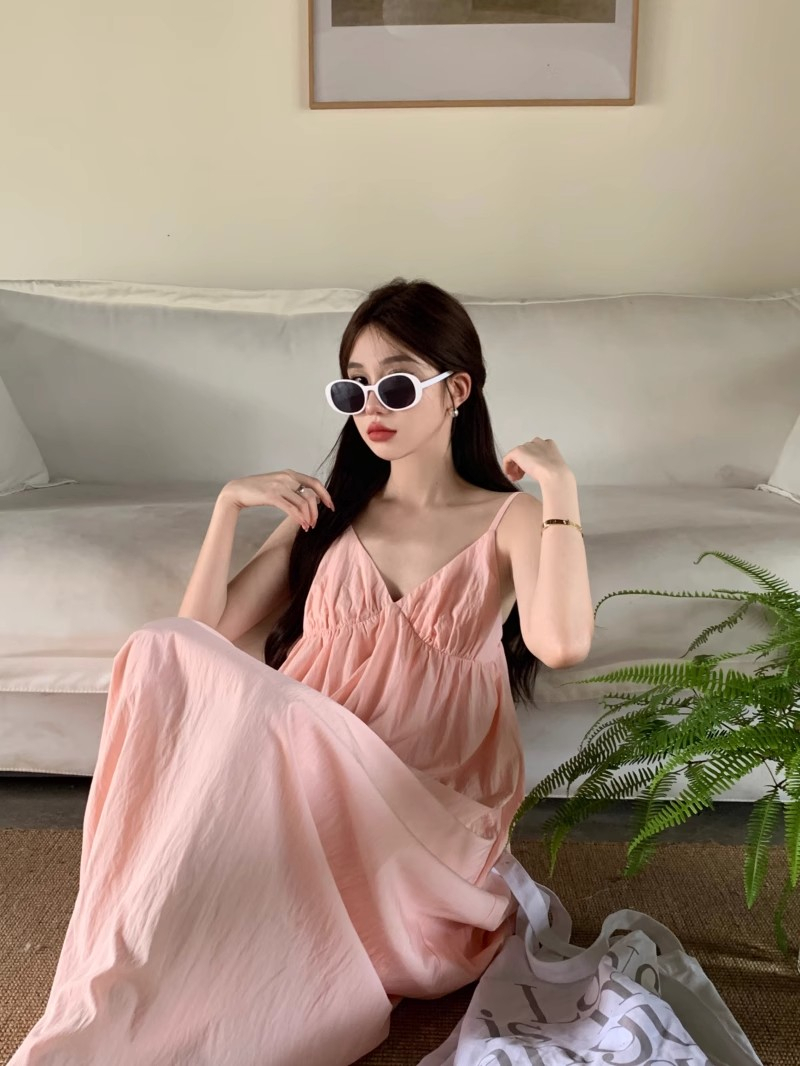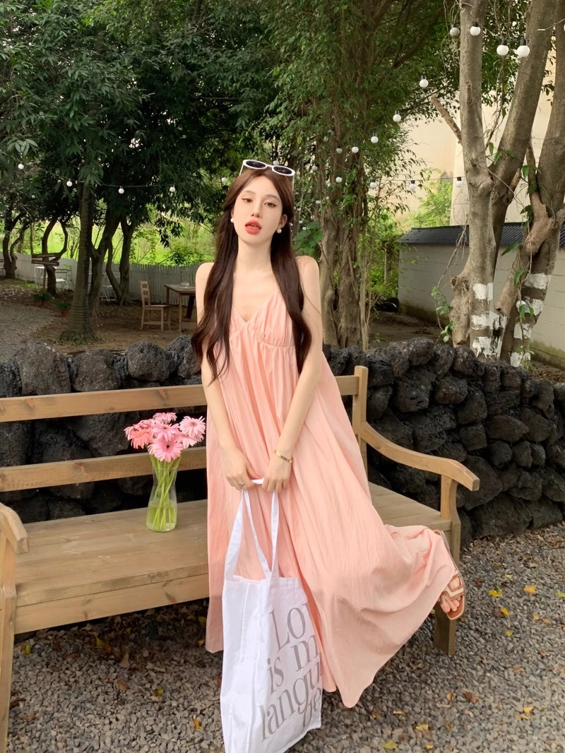 • Pink sundress with French V-neck, loose fit, slimming, sleeveless, beach dress for summer, perfect for a beach vacation.