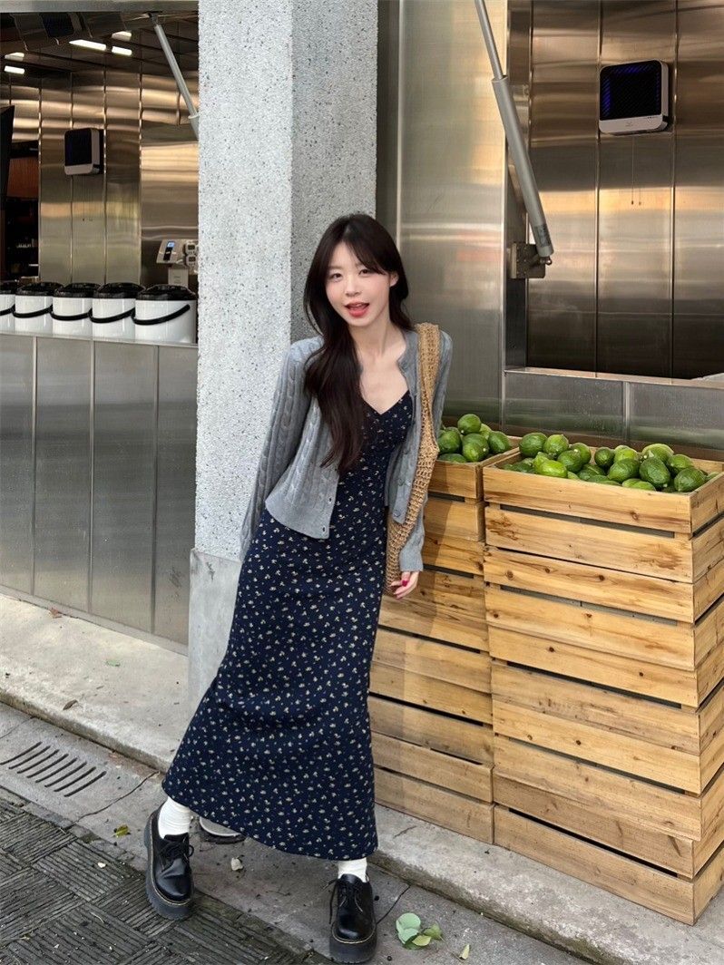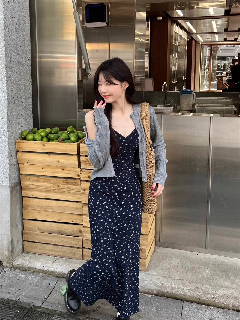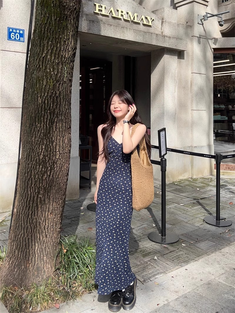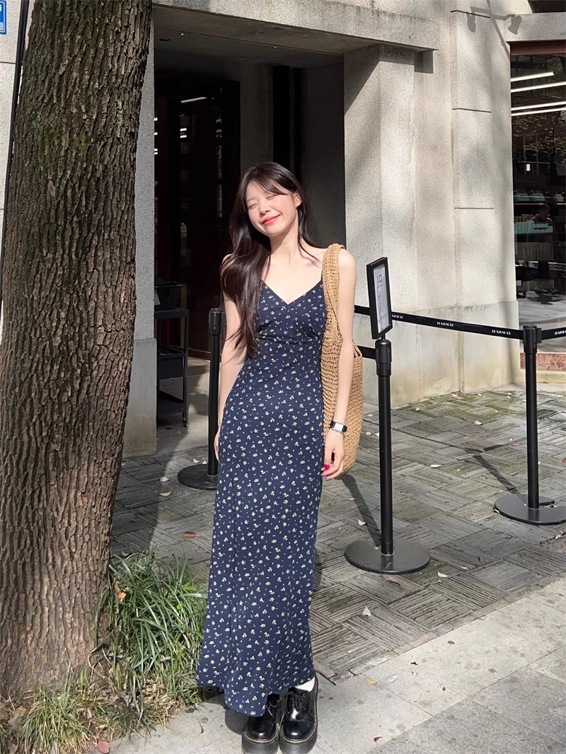 • Tea break French style blue floral print sundress for women, summer 2024 new style, petite and elegant, waist-cinching.