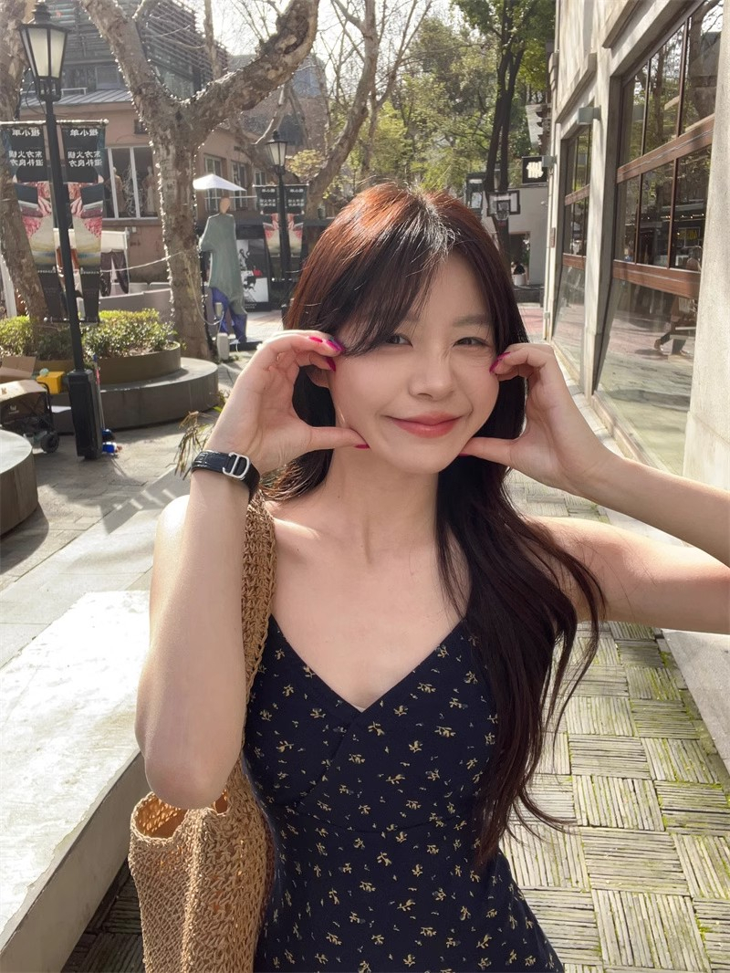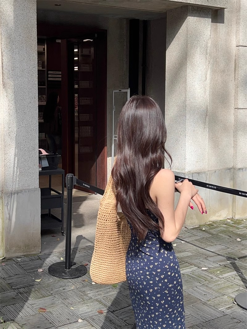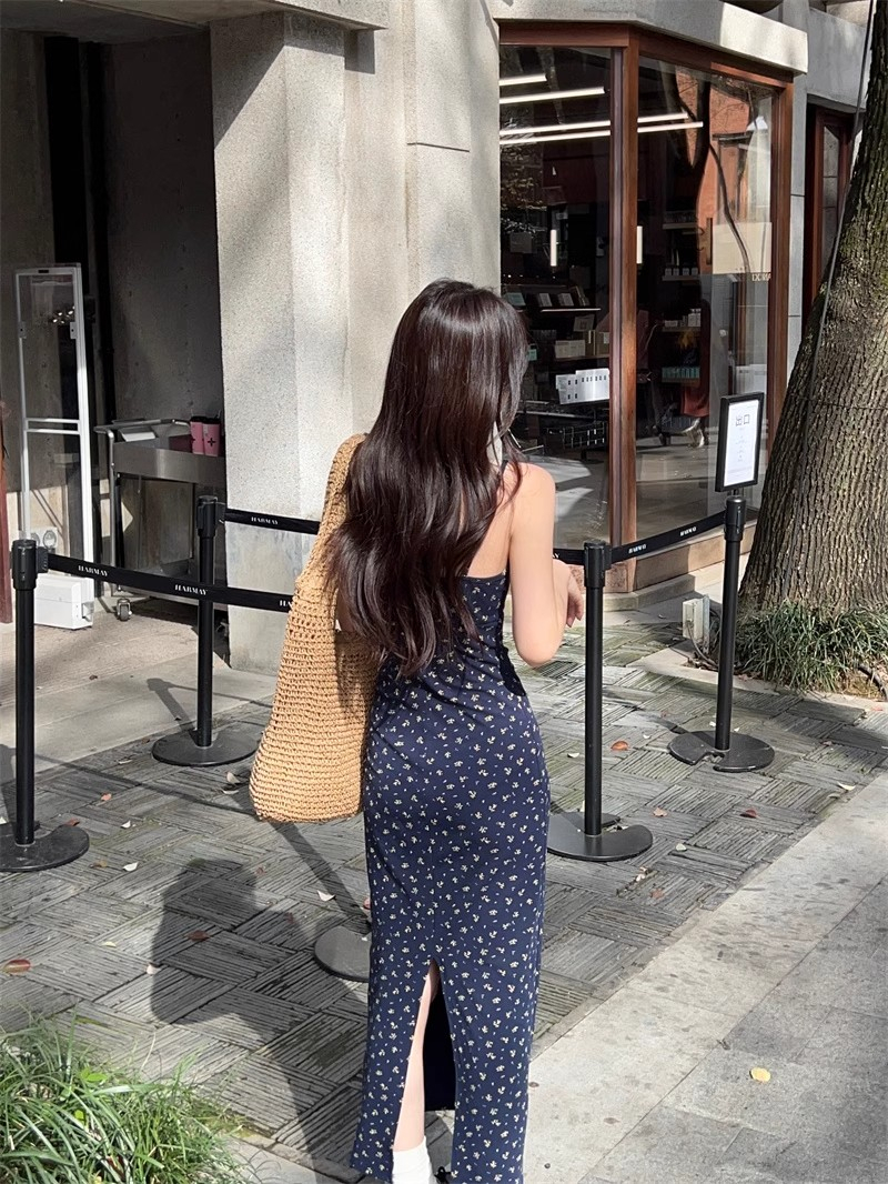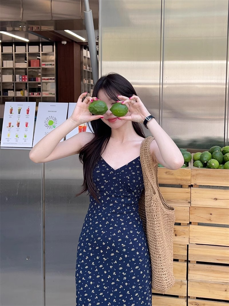 Tea break French style blue floral print sundress for women, summer 2024 new style, petite and elegant, waist-cinching.