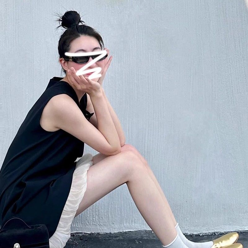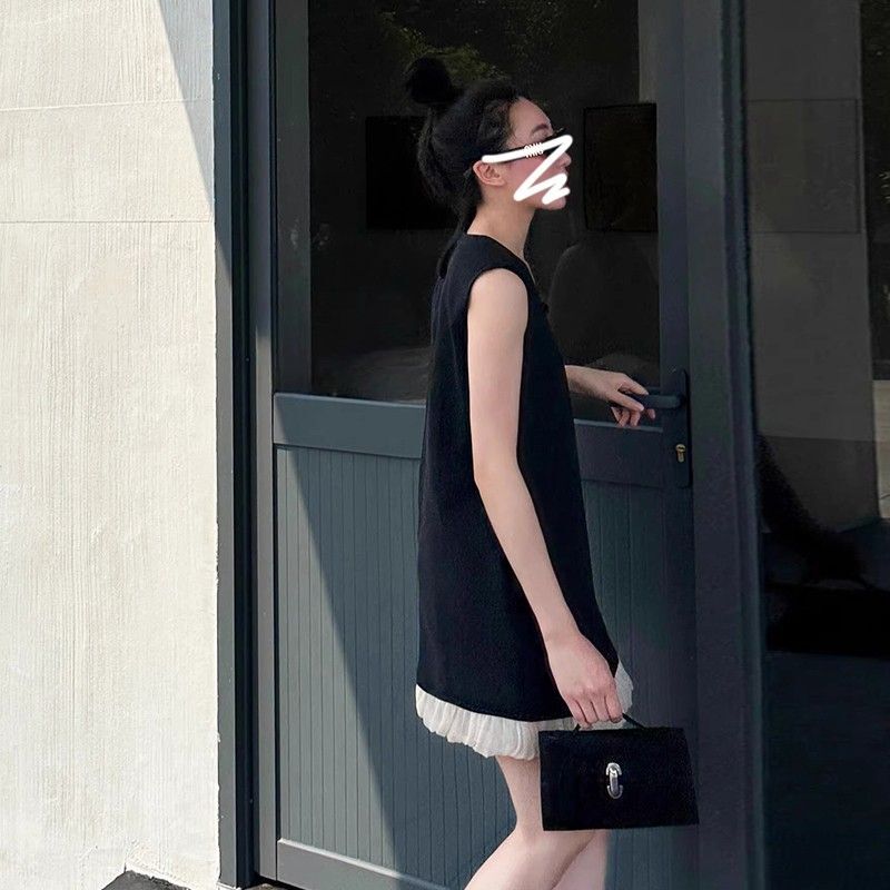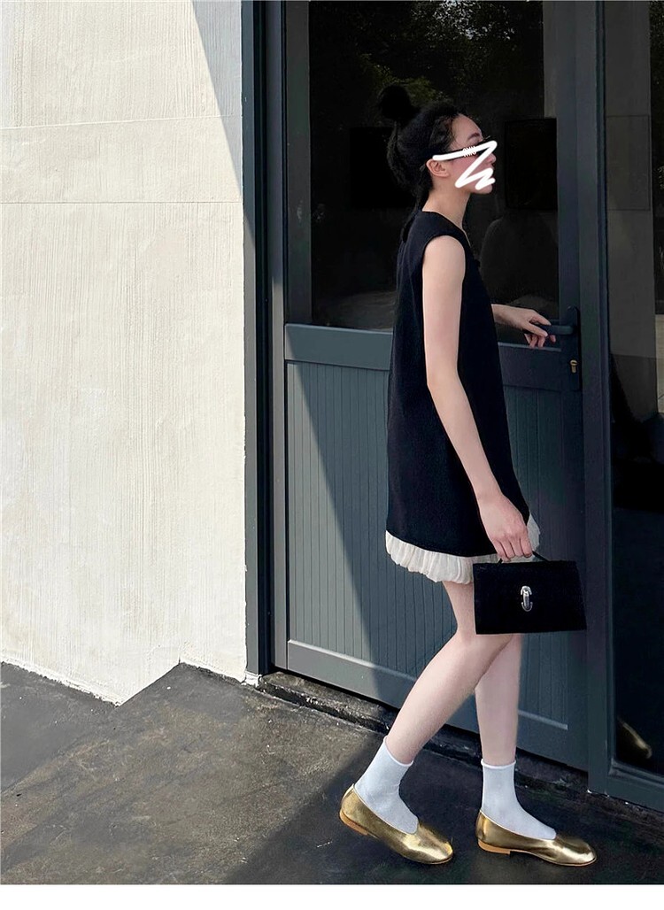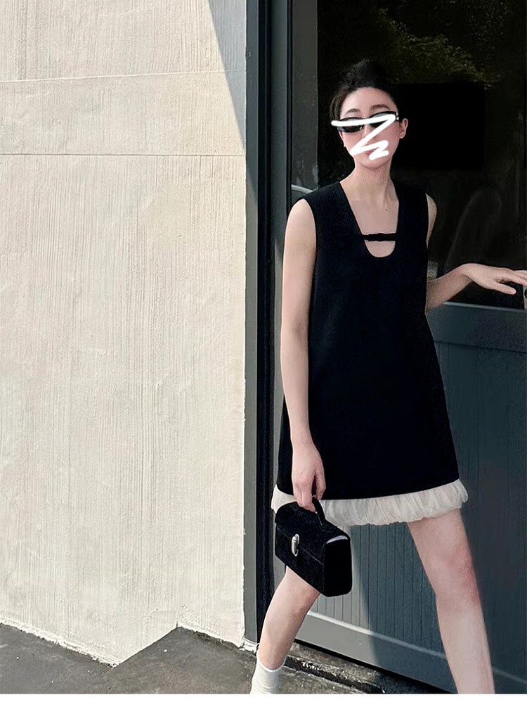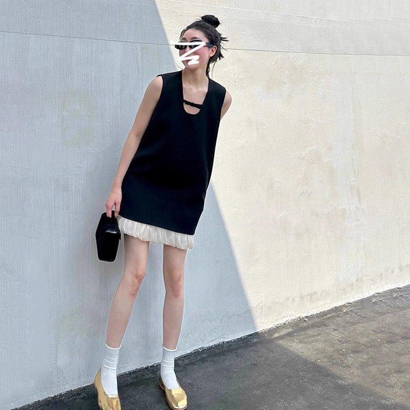 French-style sleeveless dress with cutouts, new summer style for 2025, elegant and loose fit, A-line silhouette.