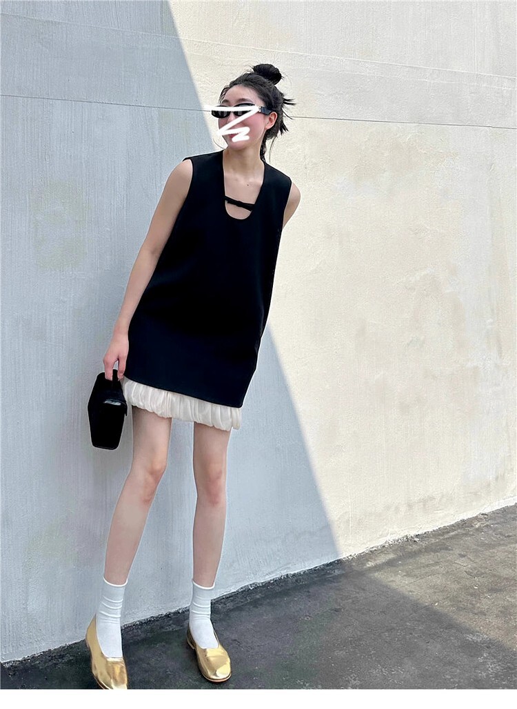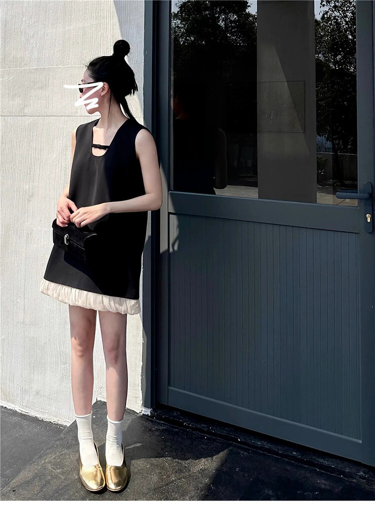• French-style sleeveless dress with cutouts, new summer style for 2025, elegant and loose fit, A-line silhouette.
