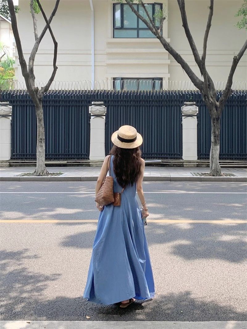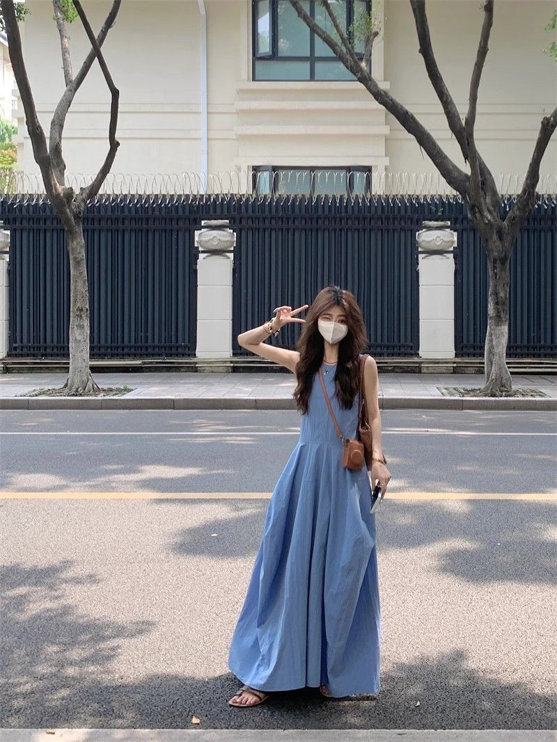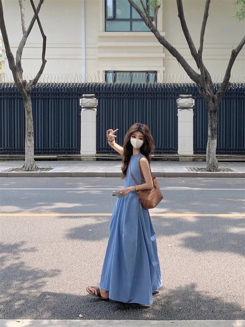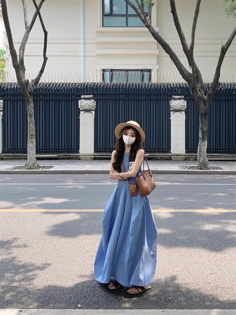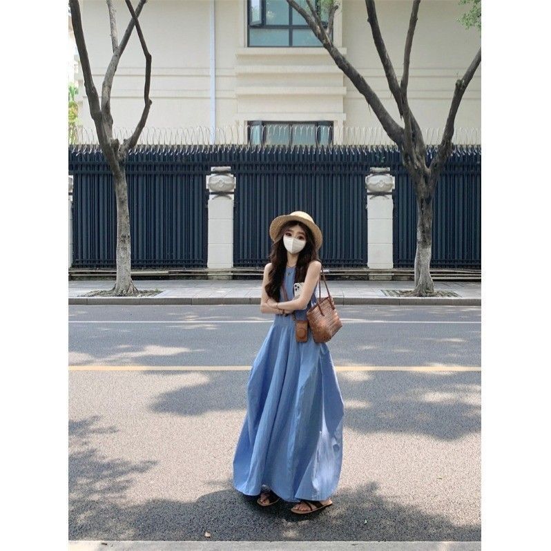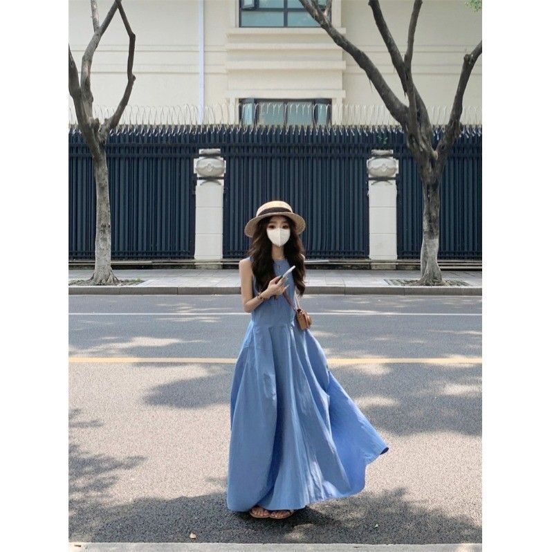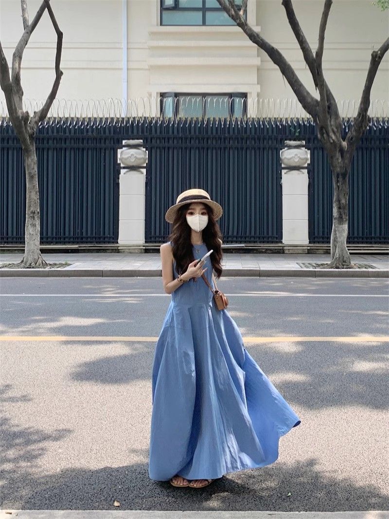 • French-style resort-inspired elegant blue vest dress, new summer design, slimming A-line long skirt.