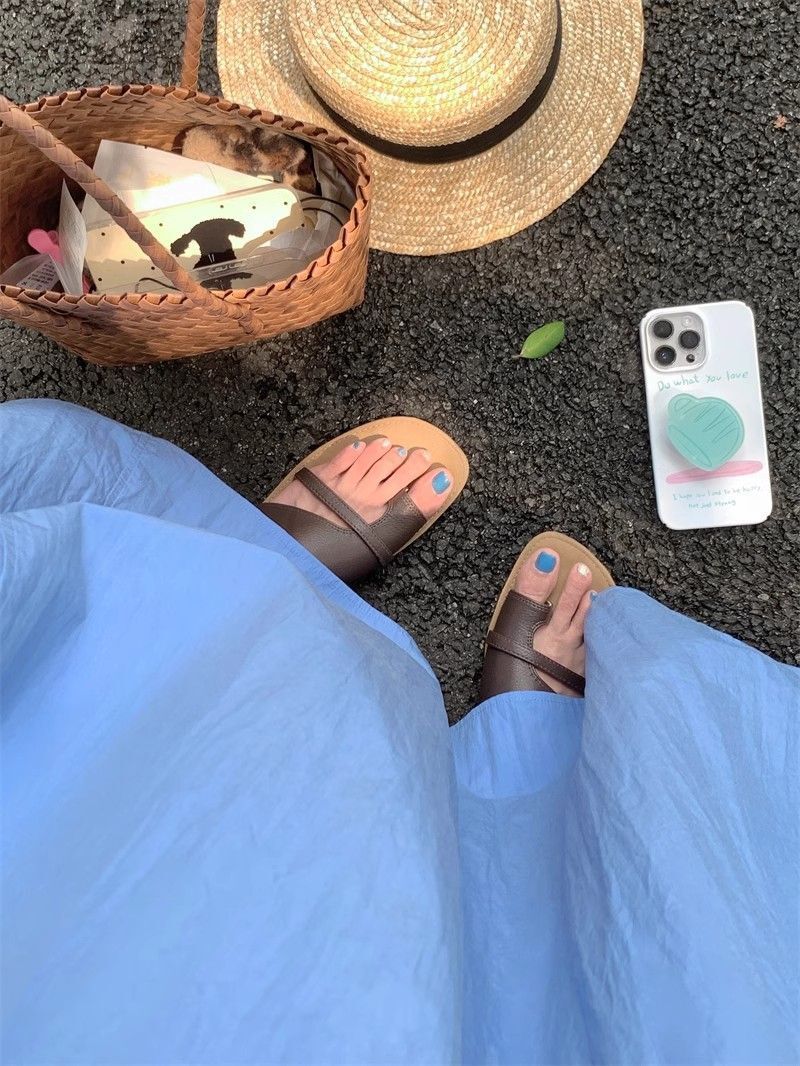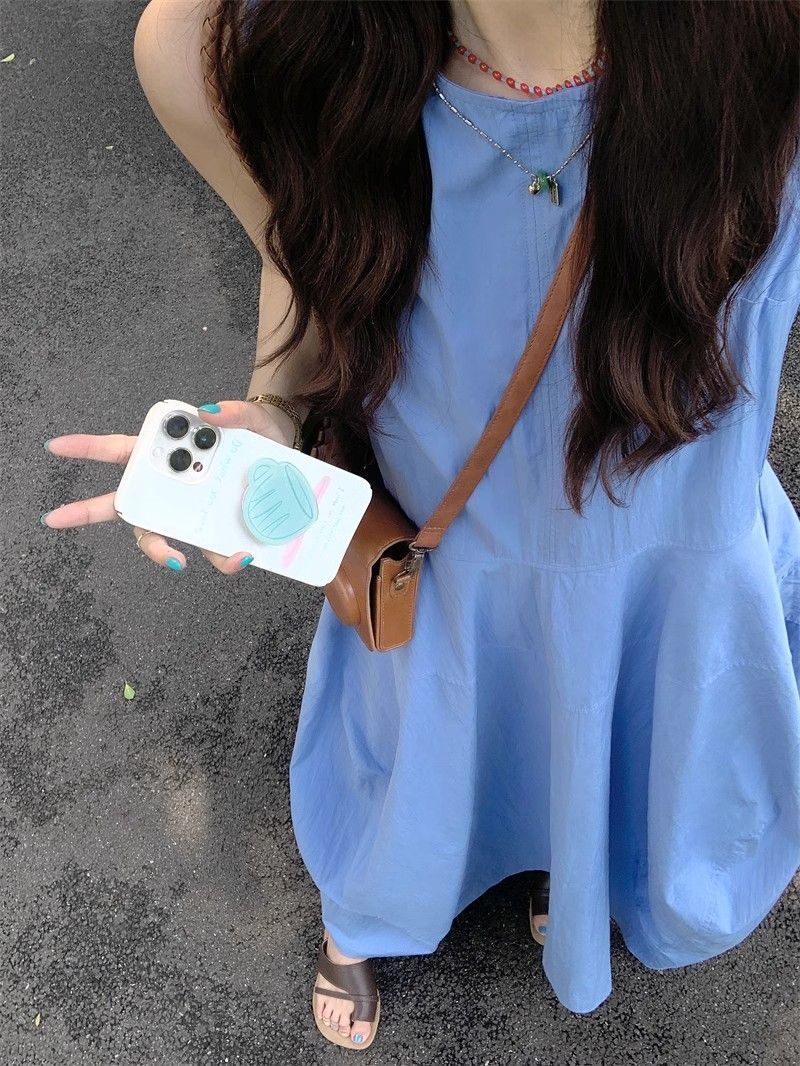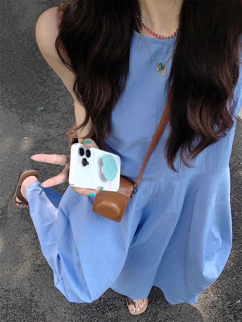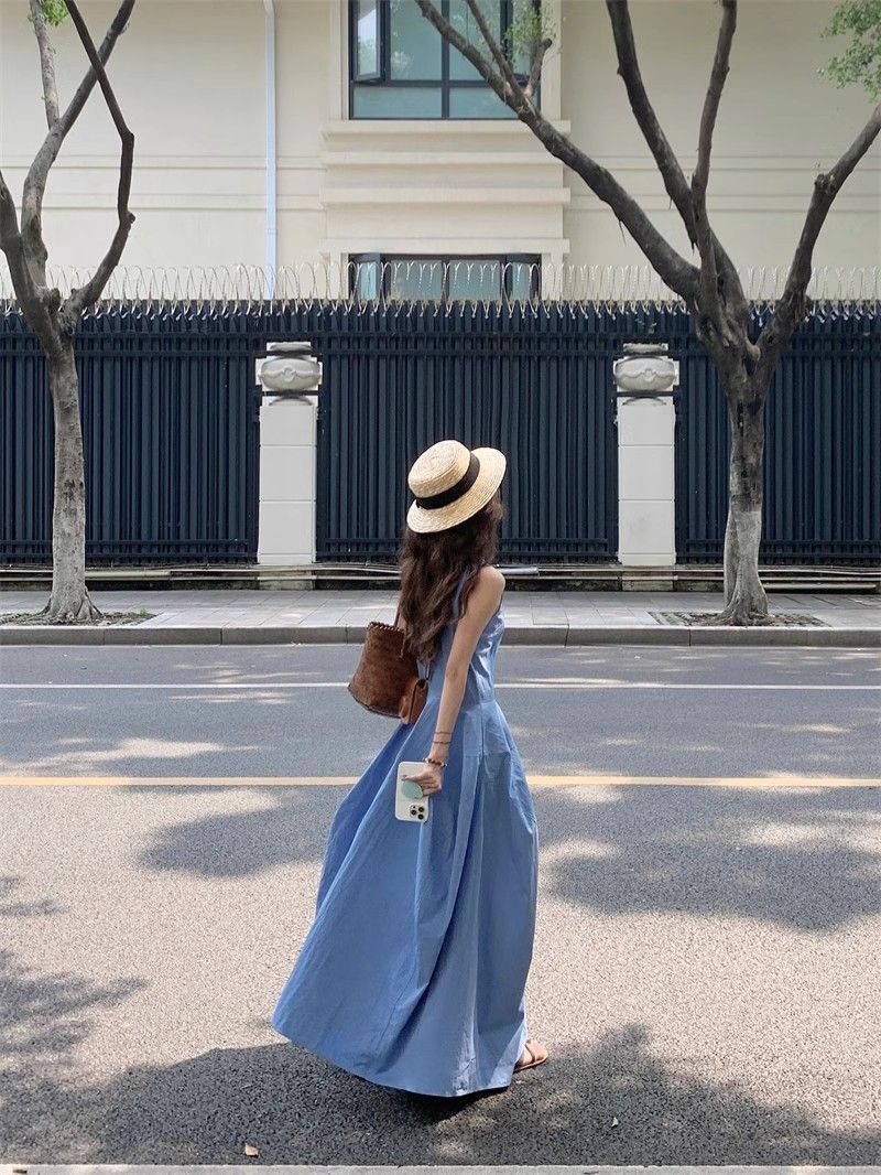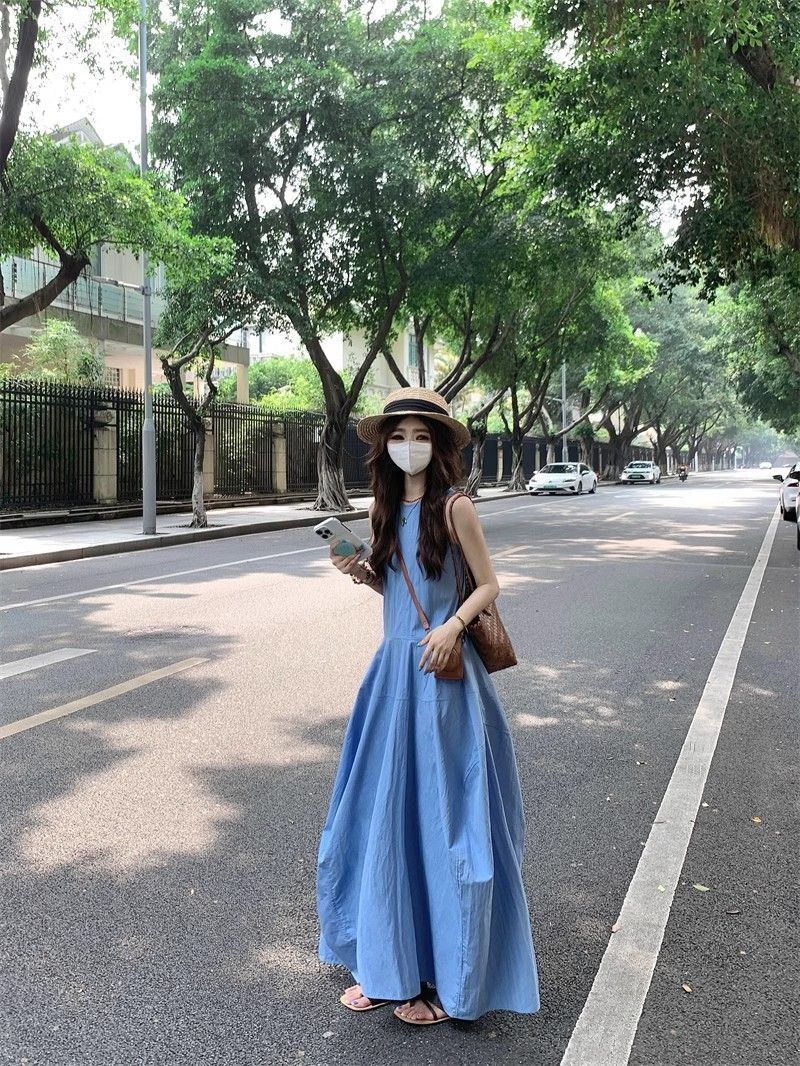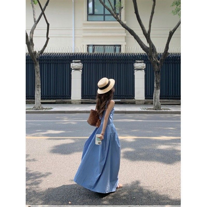 • French-style resort-inspired elegant blue vest dress, new summer design, slimming A-line long skirt.