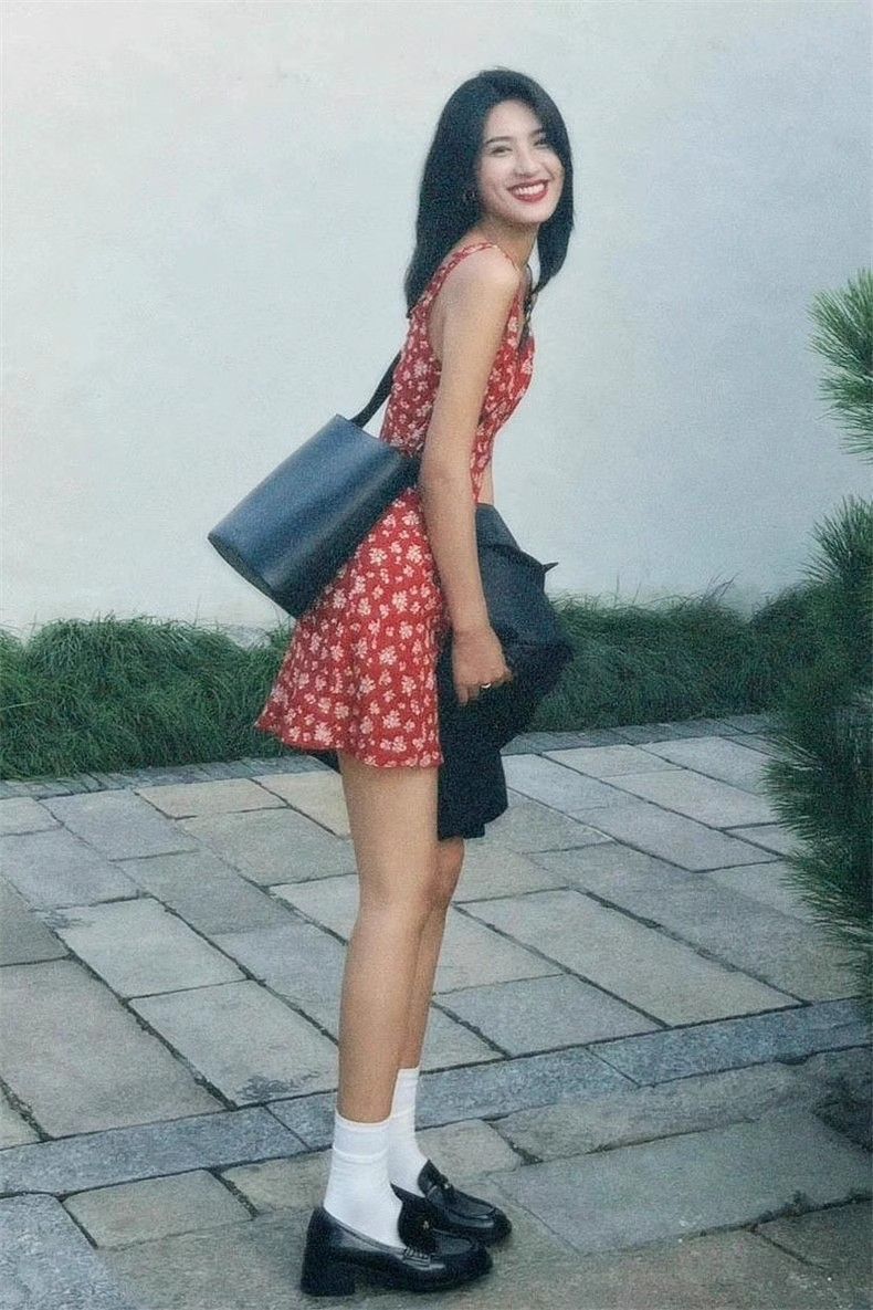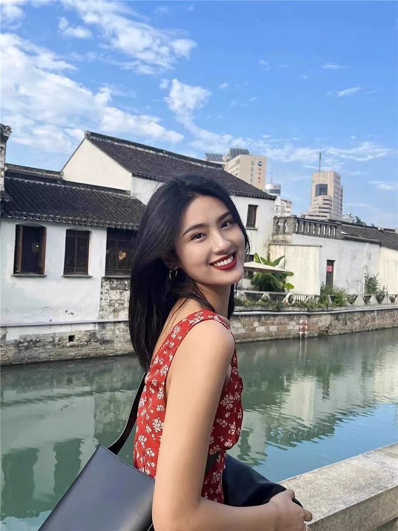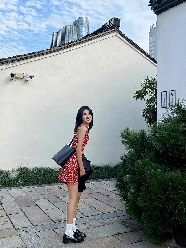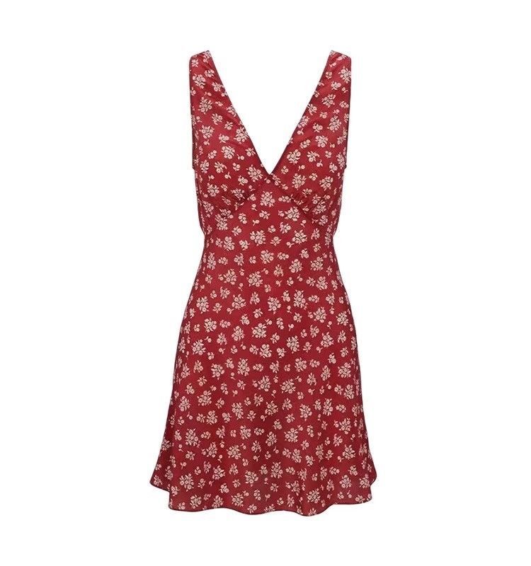 • Red retro floral print sundress for women, new summer style, tea-colored, pure and alluring French temperament, V-neck, Hong Kong style short skirt.