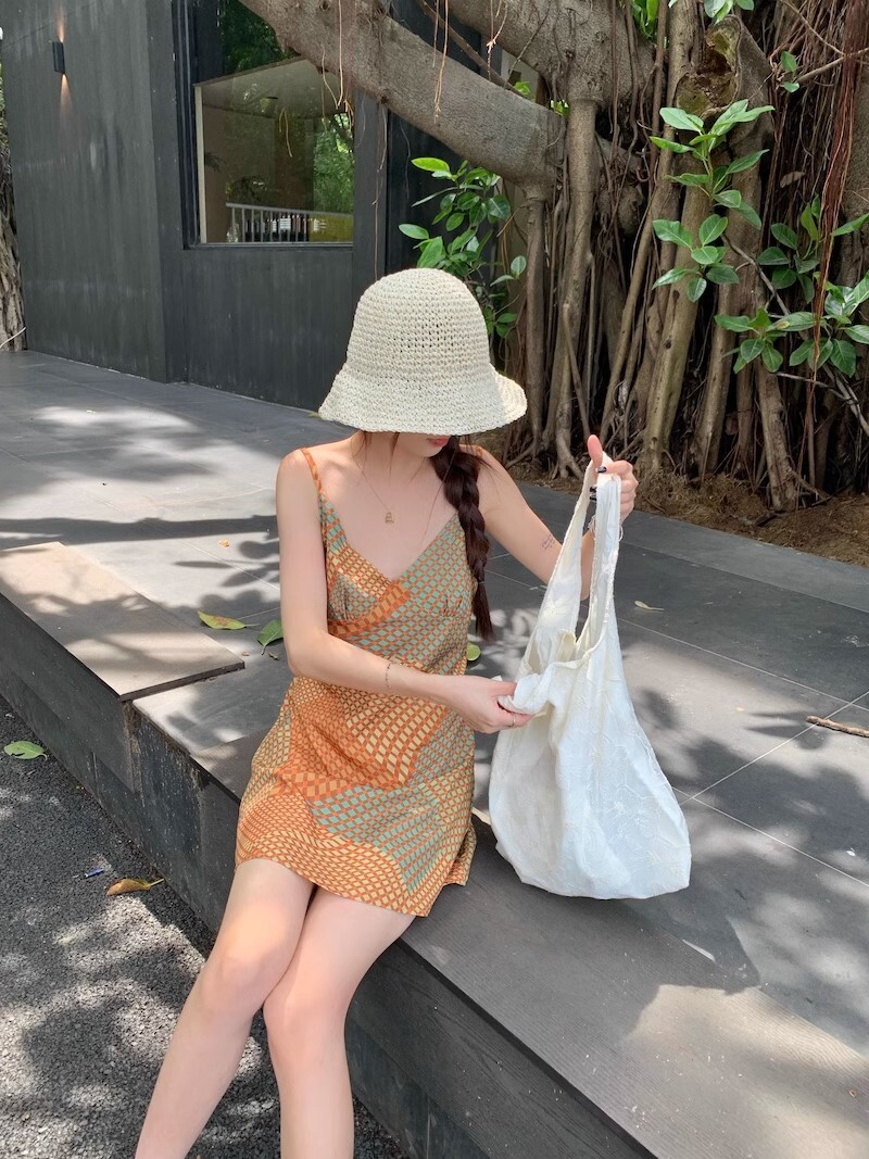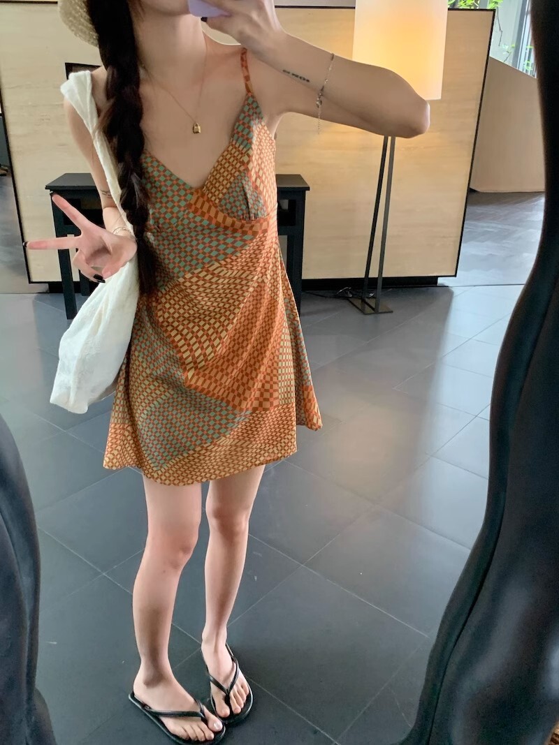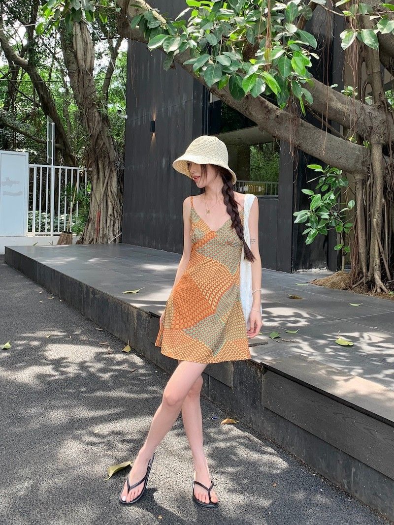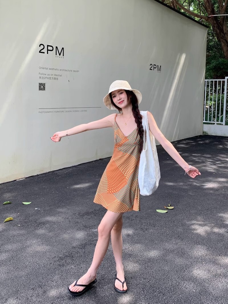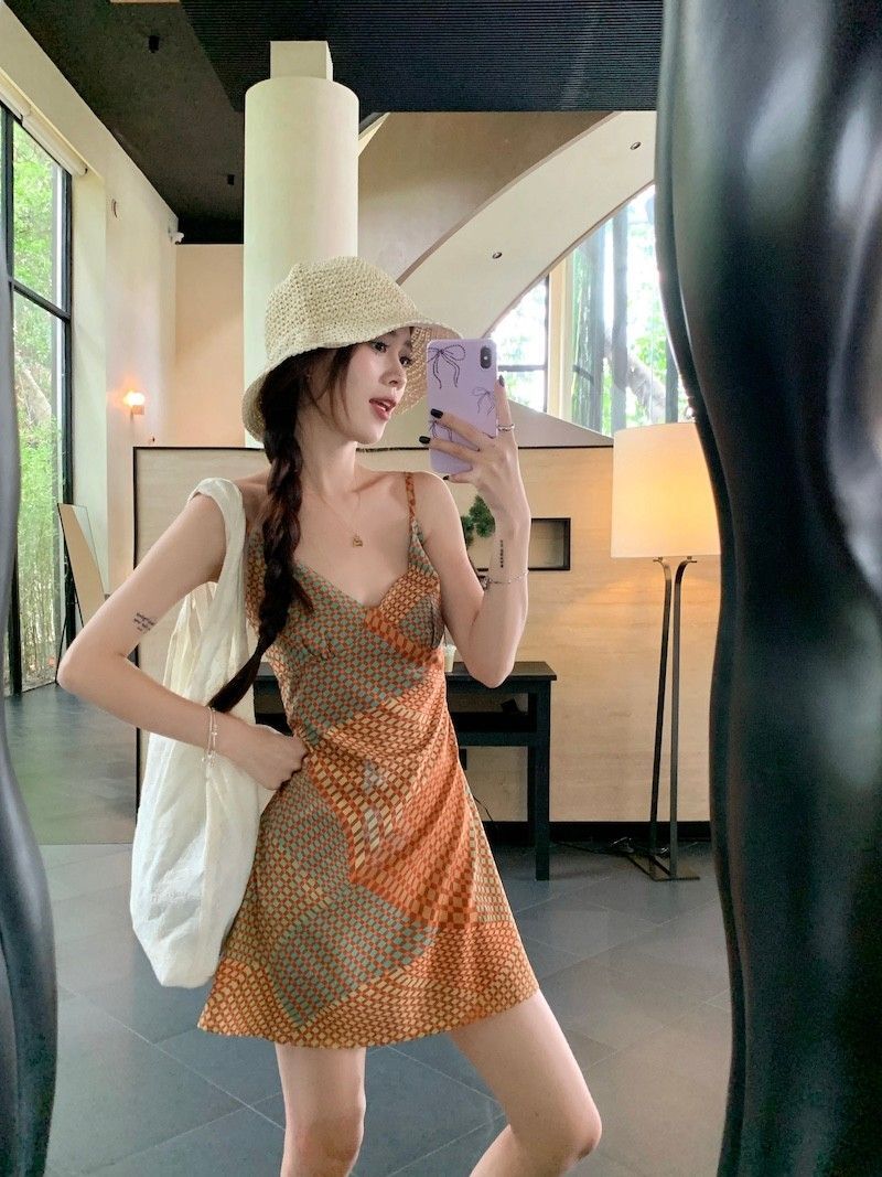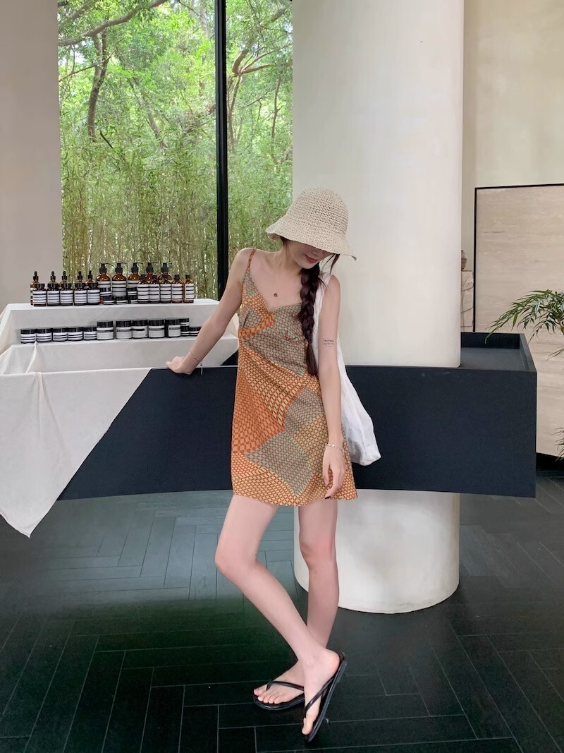 • Retro-style vacation-inspired slip dress for women, new arrival, irregular repeating color-blocked print, bias cut, slimming dress.
