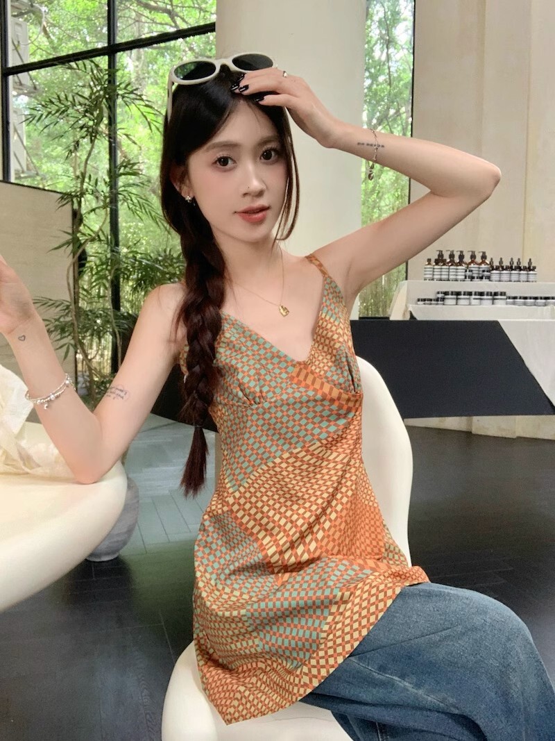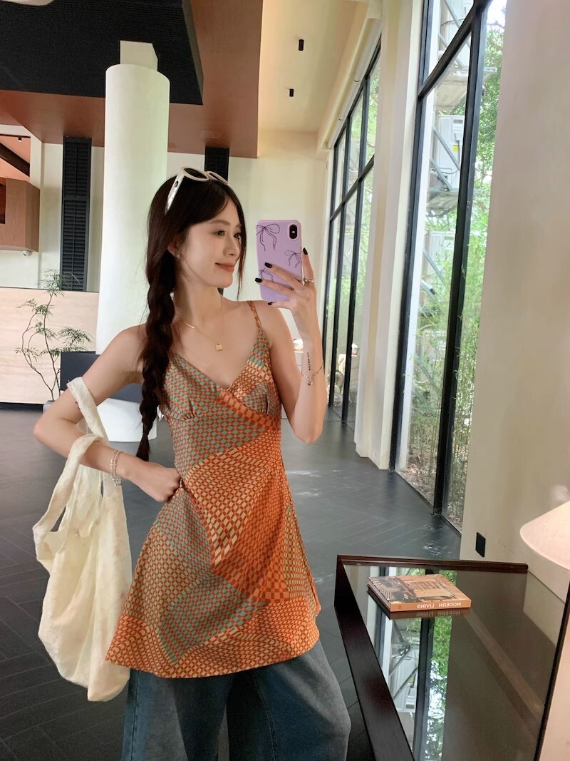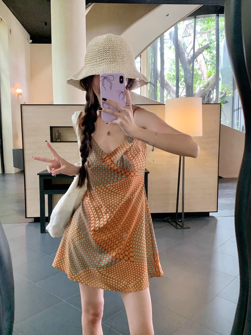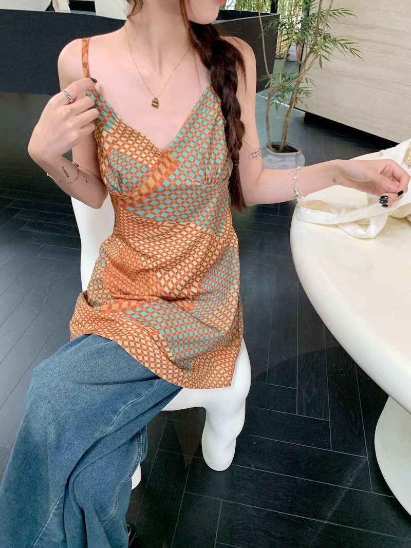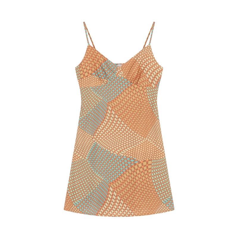 • Retro-style vacation-inspired slip dress for women, new arrival, irregular repeating color-blocked print, bias cut, slimming dress.