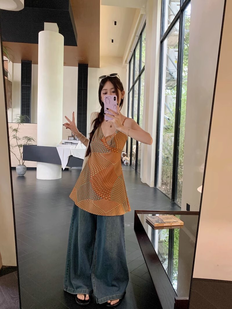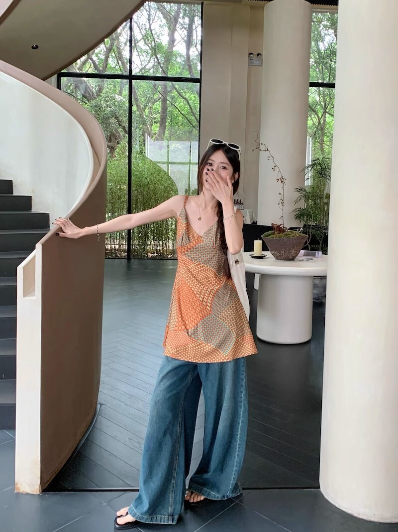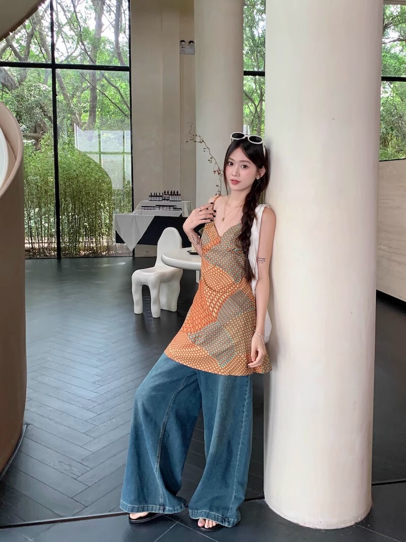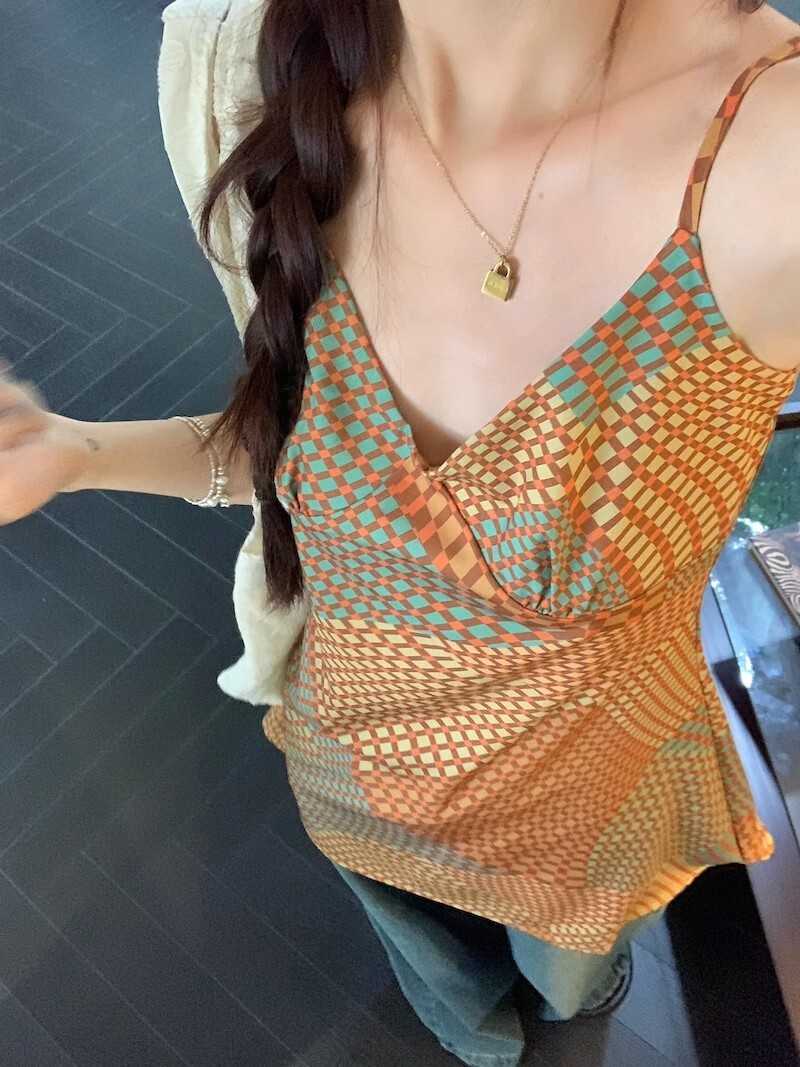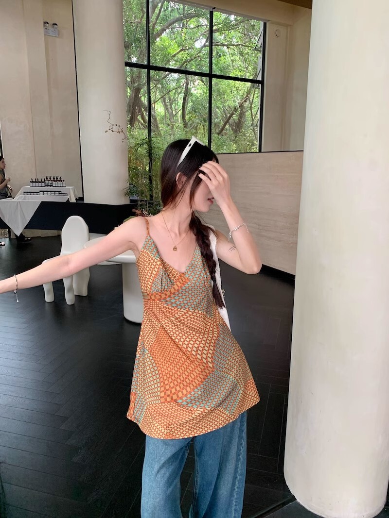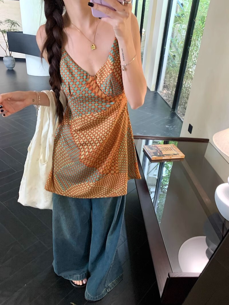 • Retro-style vacation-inspired slip dress for women, new arrival, irregular repeating color-blocked print, bias cut, slimming dress.