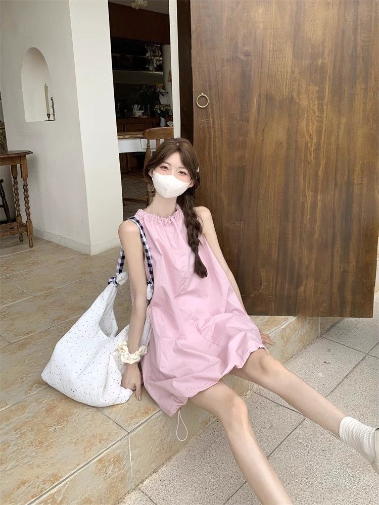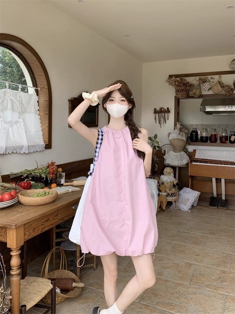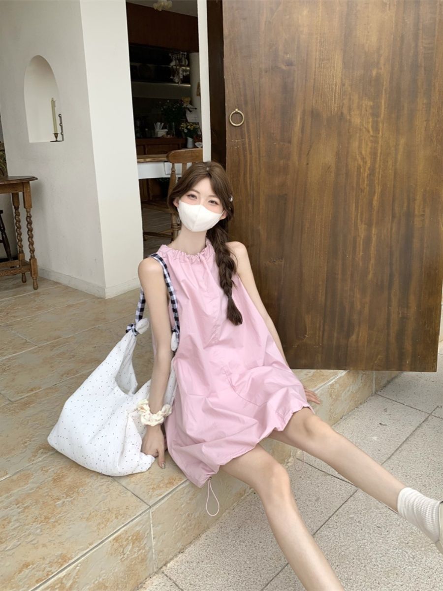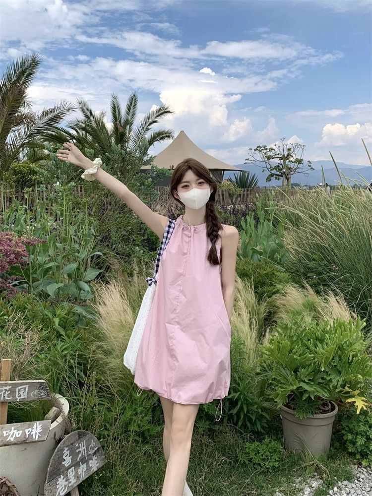 • Gentle and youthful design, pink tie-waist dress, women's summer 2025 new style, solid color tulip skirt.