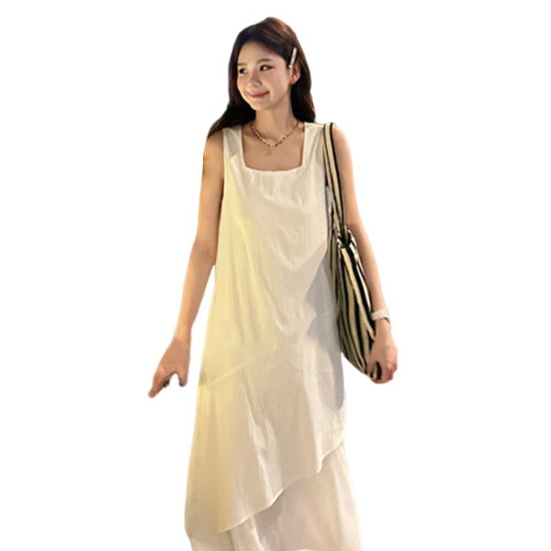 White vest dress for women, summer 2025 new style, French loose design, mid-length, irregular straps.