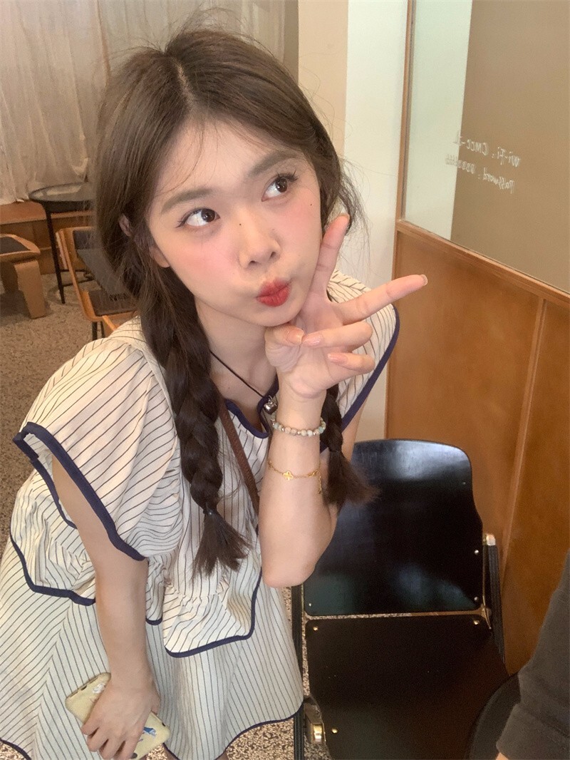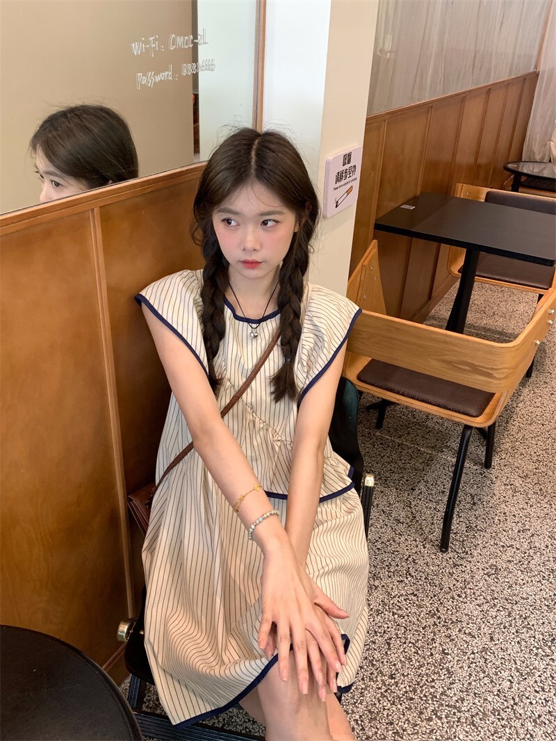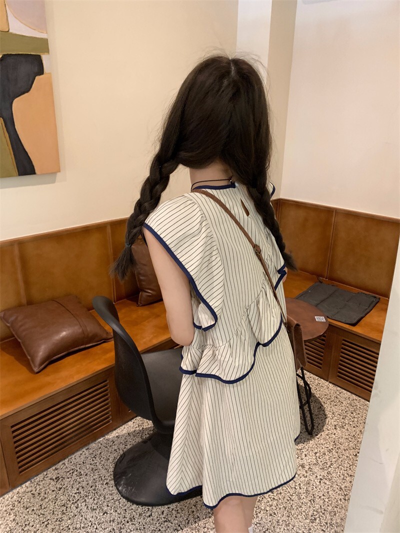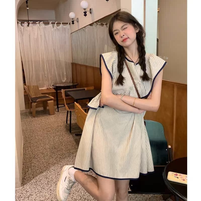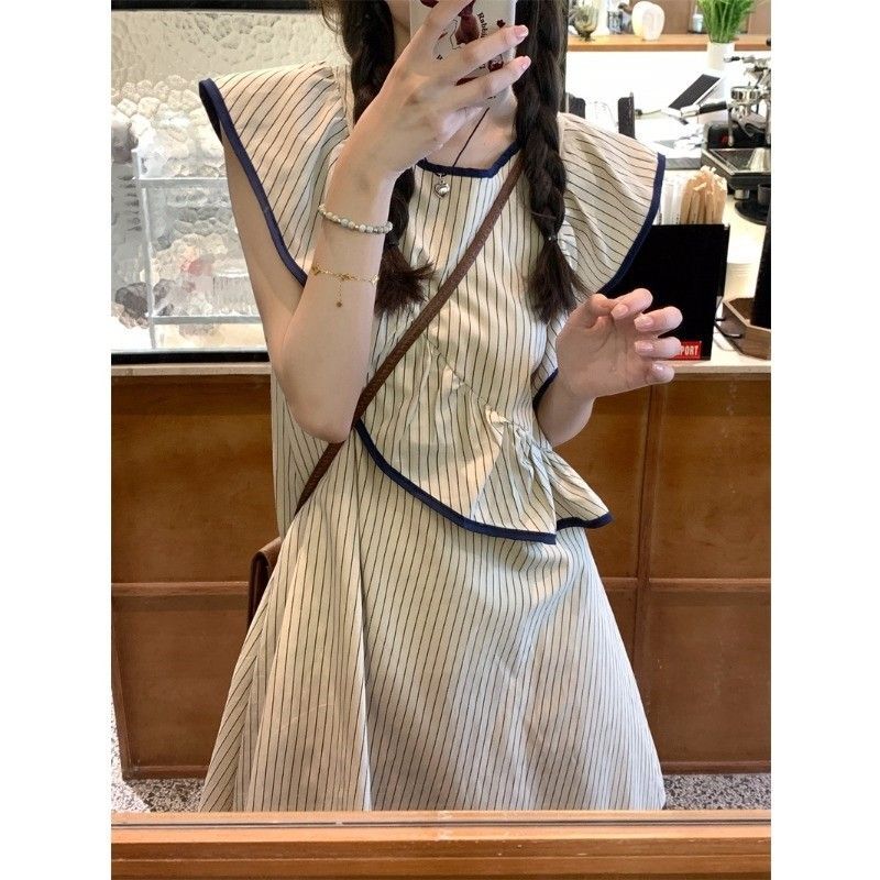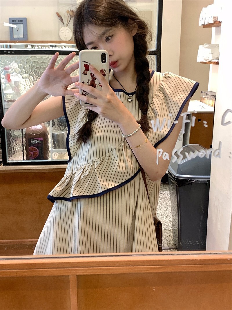 • Korean chic striped flutter sleeve asymmetrical sleeveless dress, new summer 2025 style, short style.
