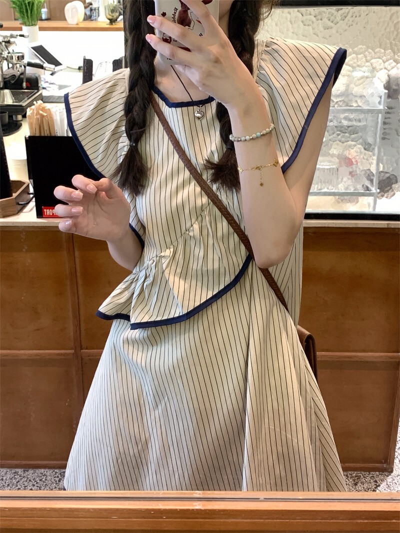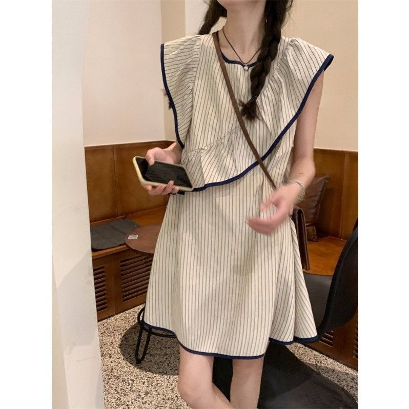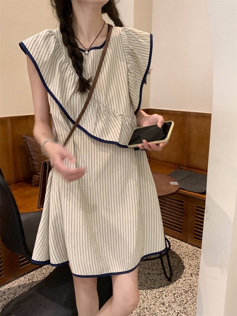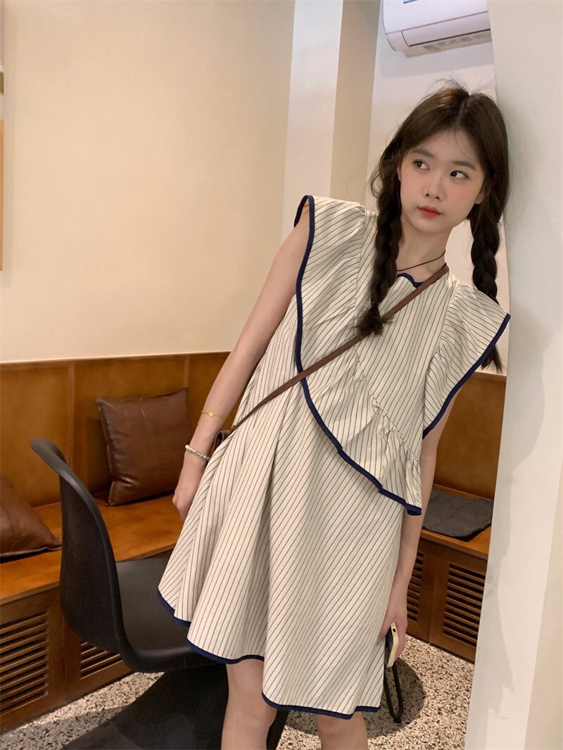Korean chic striped flutter sleeve asymmetrical sleeveless dress, new summer 2025 style, short style.