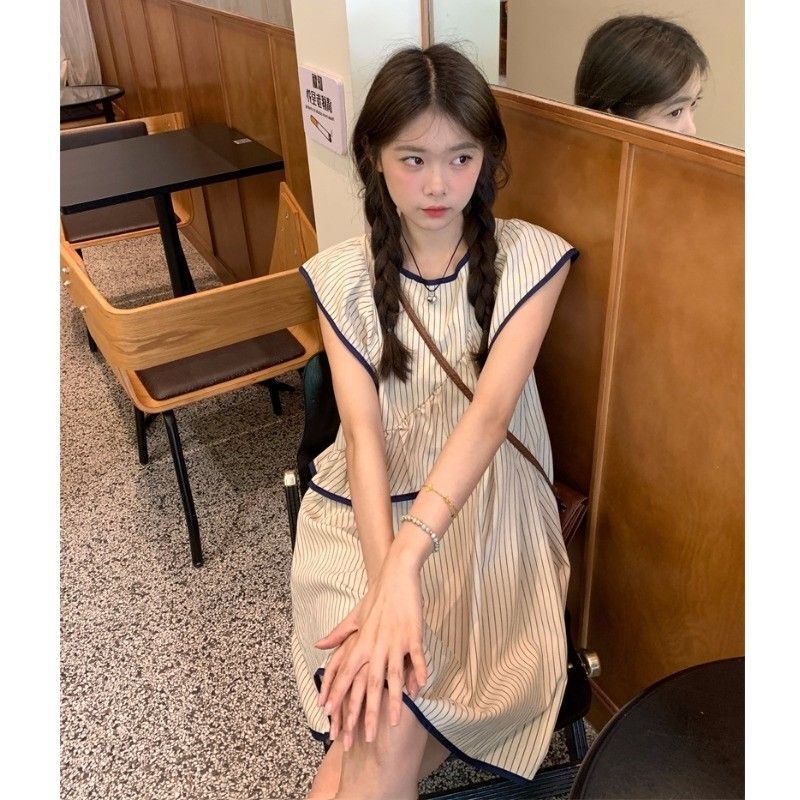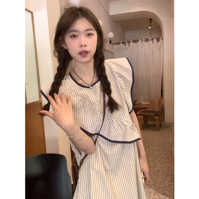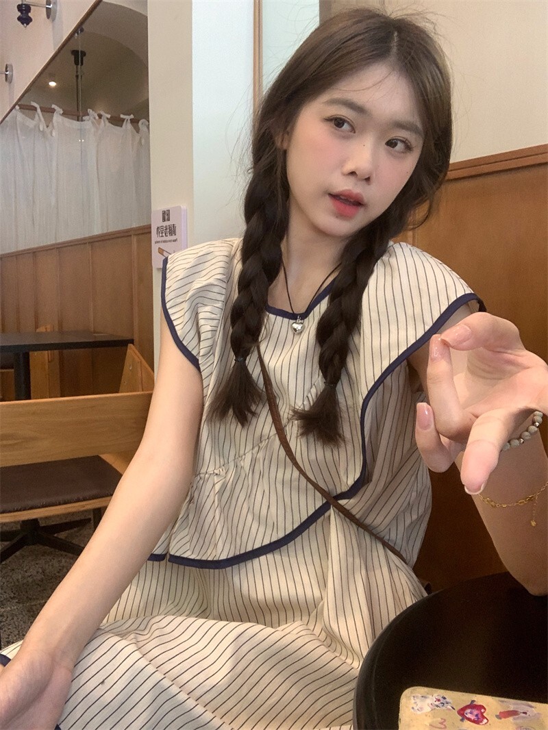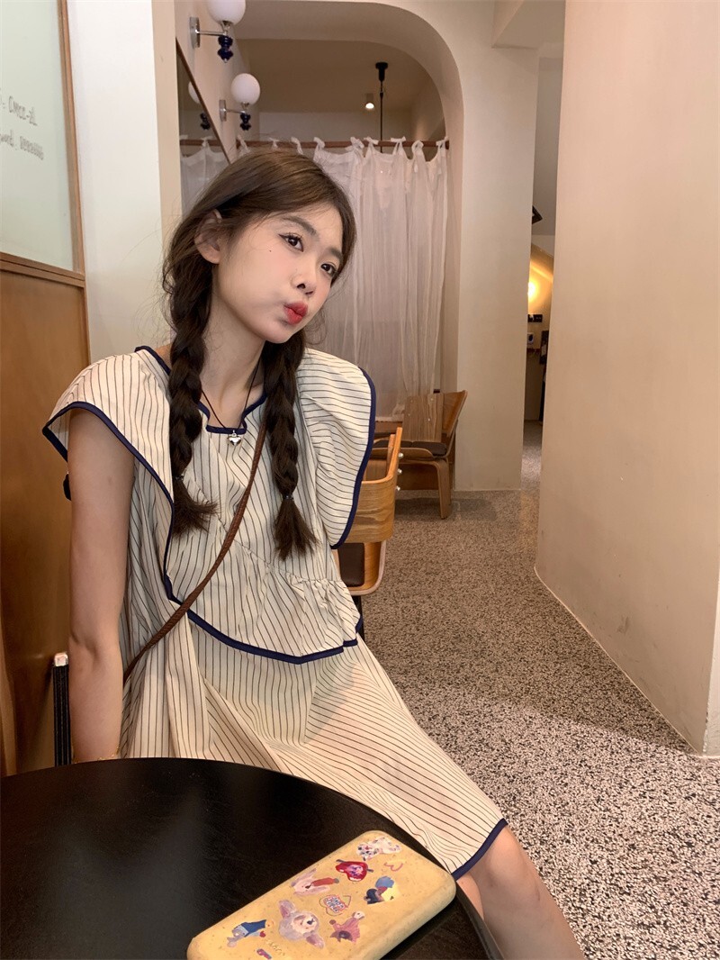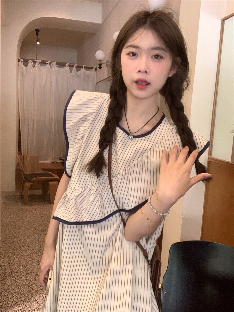 Korean chic striped flutter sleeve asymmetrical sleeveless dress, new summer 2025 style, short style.