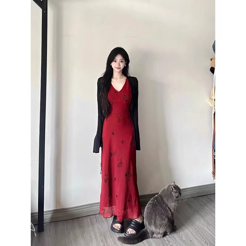 French-style pure and alluring red floral print slip dress, feminine waist-cinching, elegant drape, vacation-style vest maxi dress, summer.