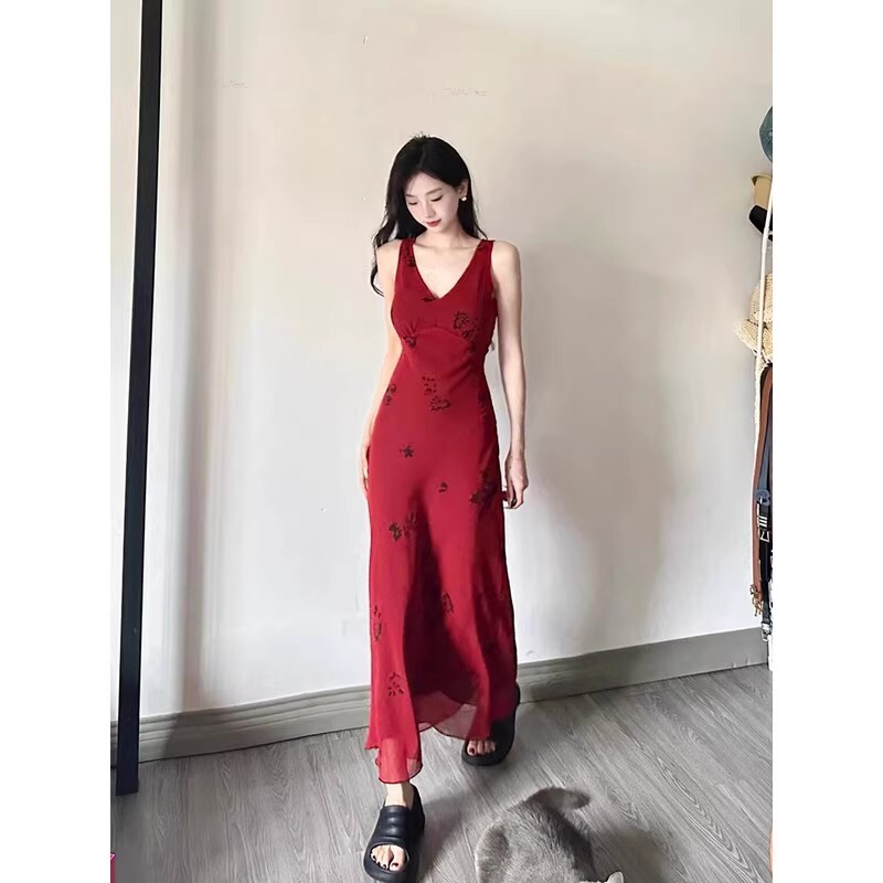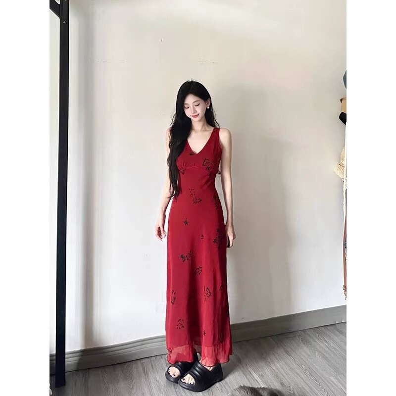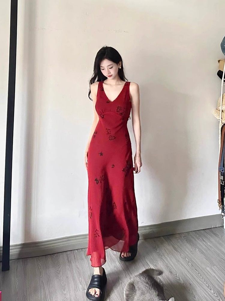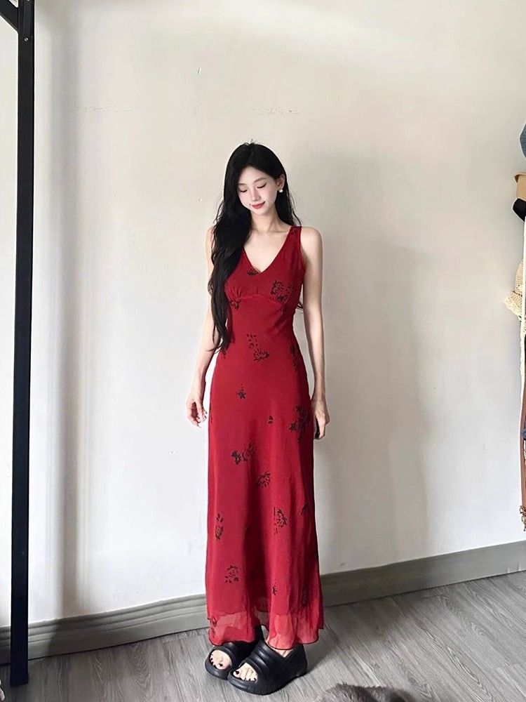 • French-style pure and alluring red floral print slip dress, feminine waist-cinching, elegant drape, vacation-style vest maxi dress, summer.