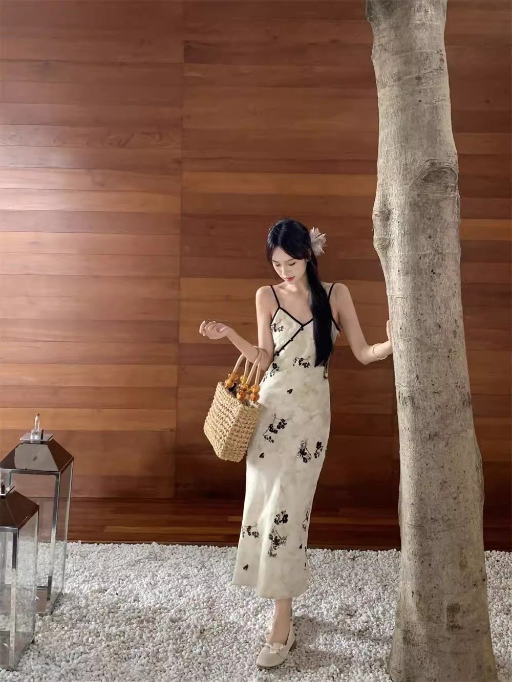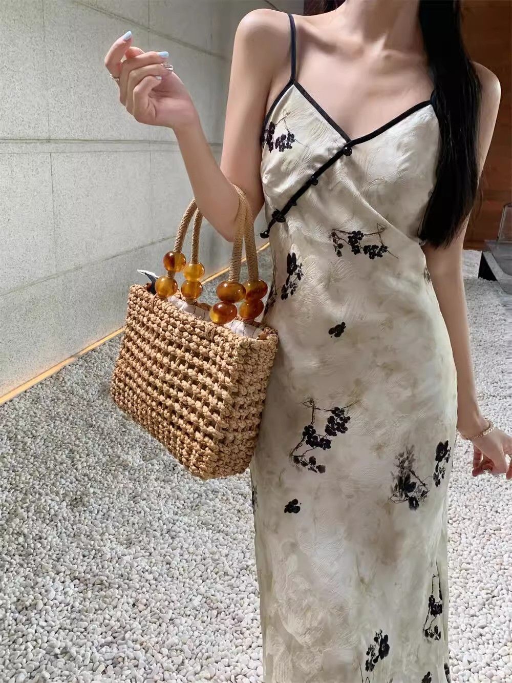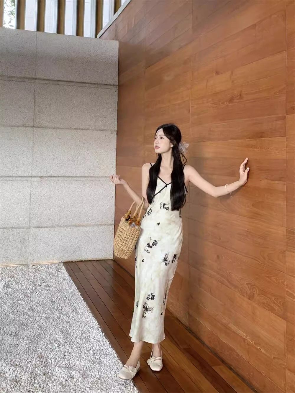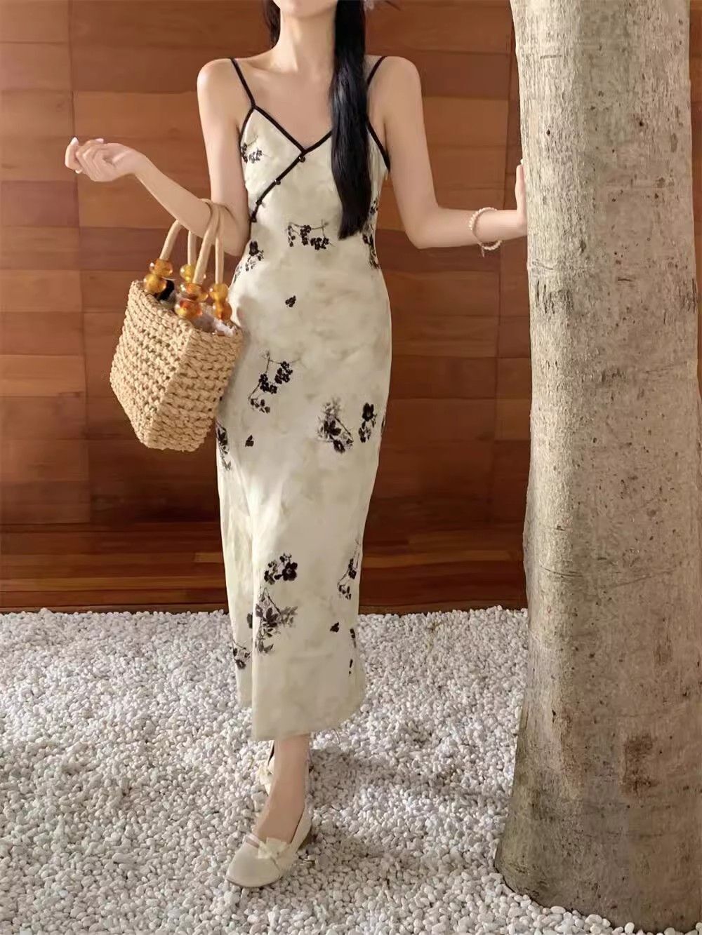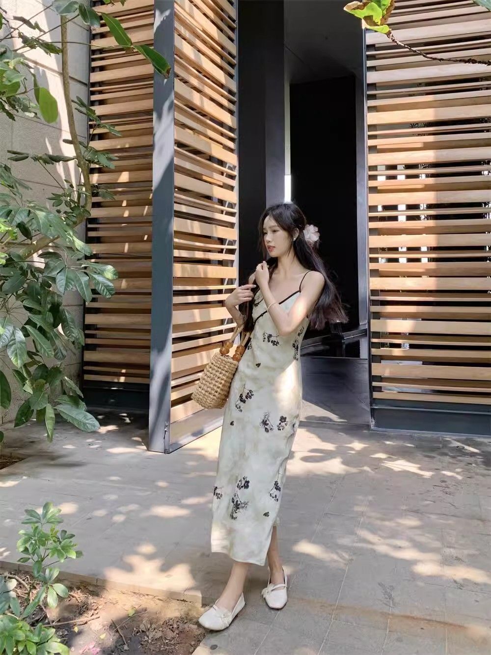 New Chinese style printed halter dress for women, summer new style, Chinese style button V-neck, waist-cinching, slimming, hip-hugging long dress.