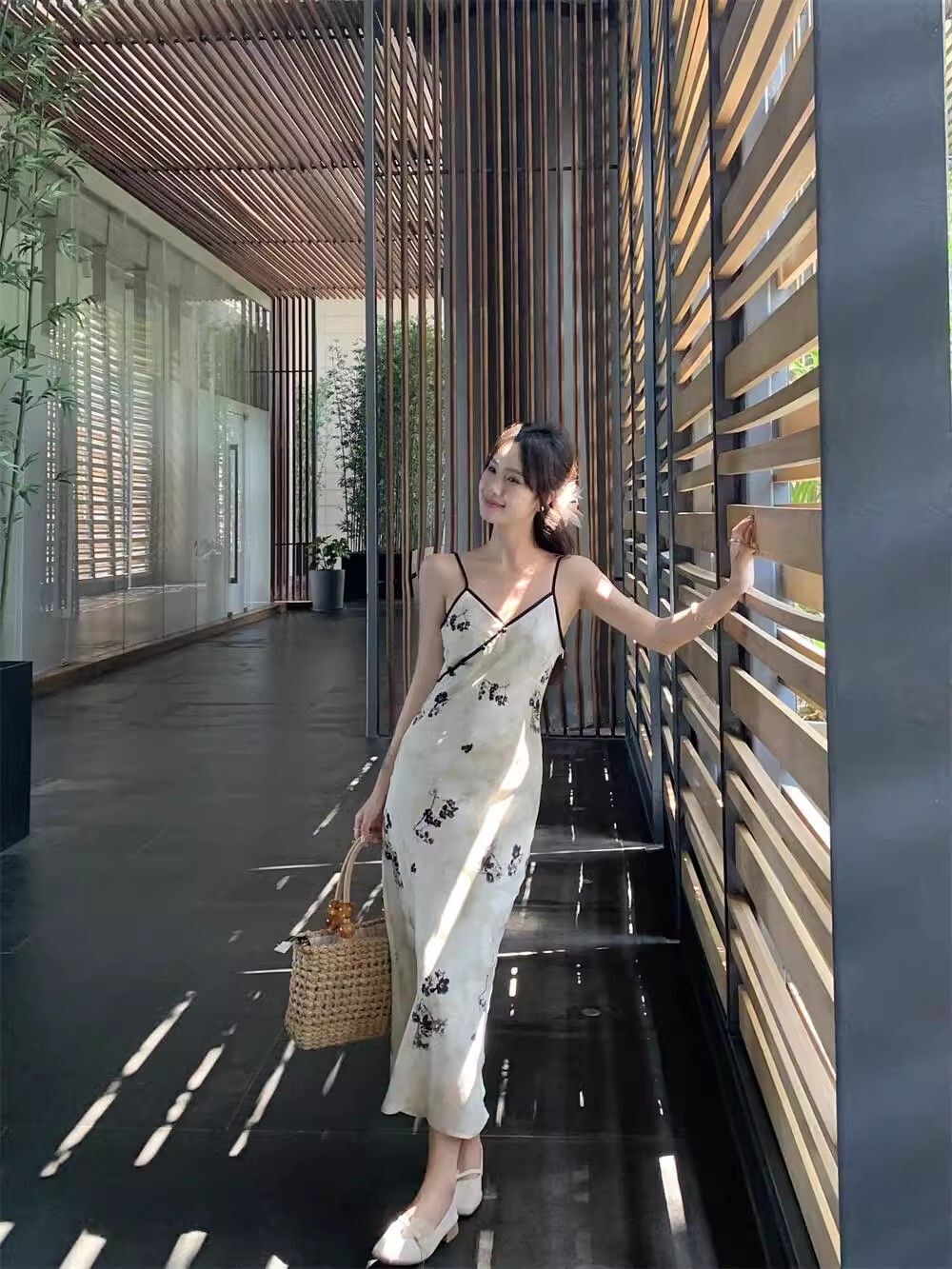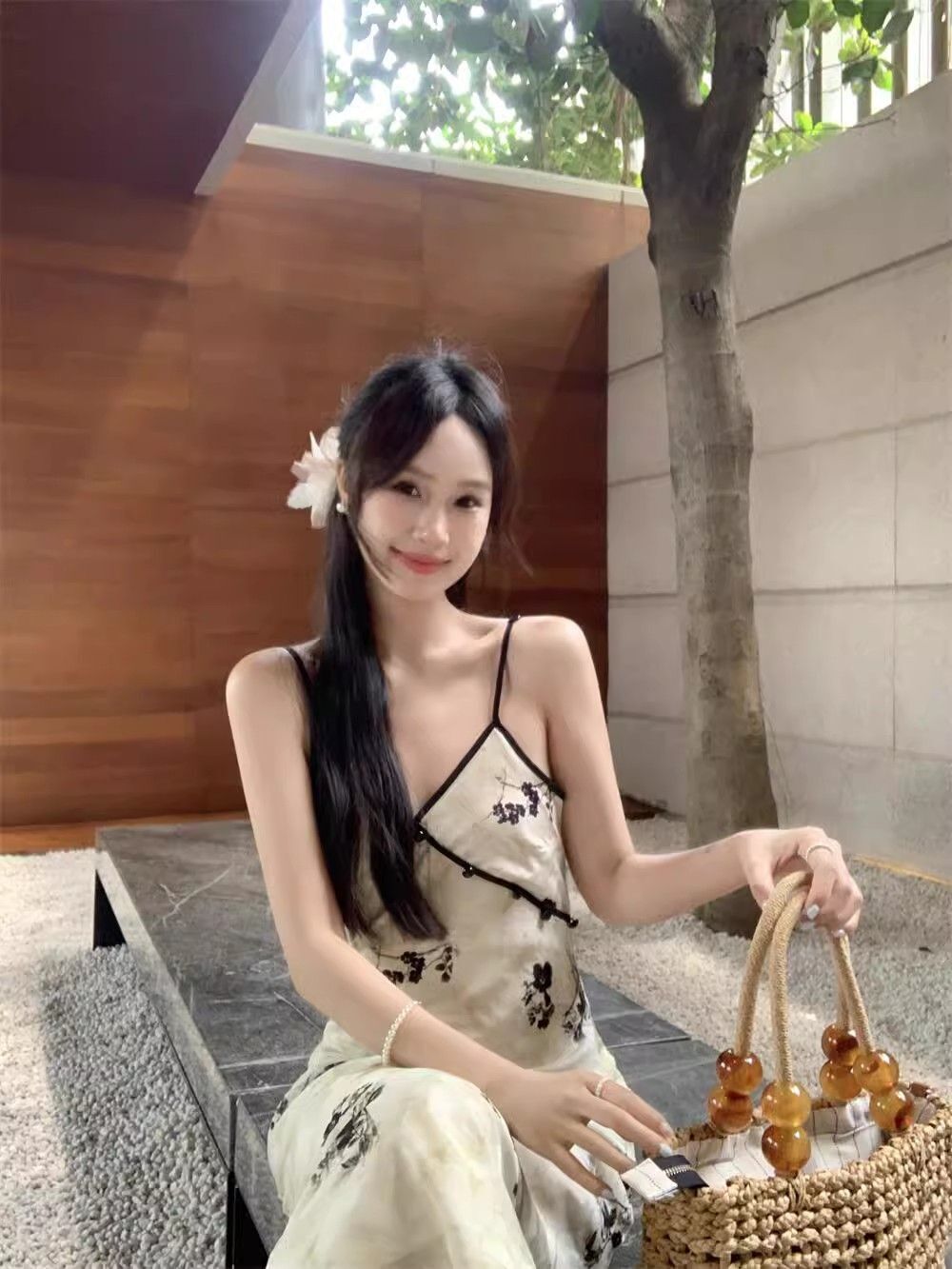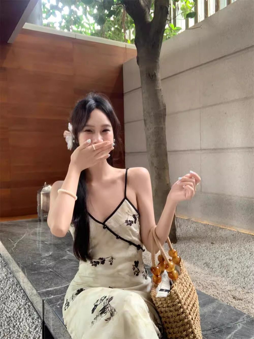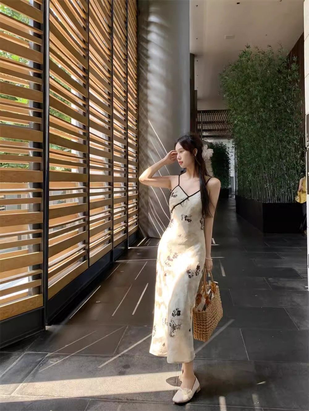 New Chinese style printed halter dress for women, summer new style, Chinese style button V-neck, waist-cinching, slimming, hip-hugging long dress.