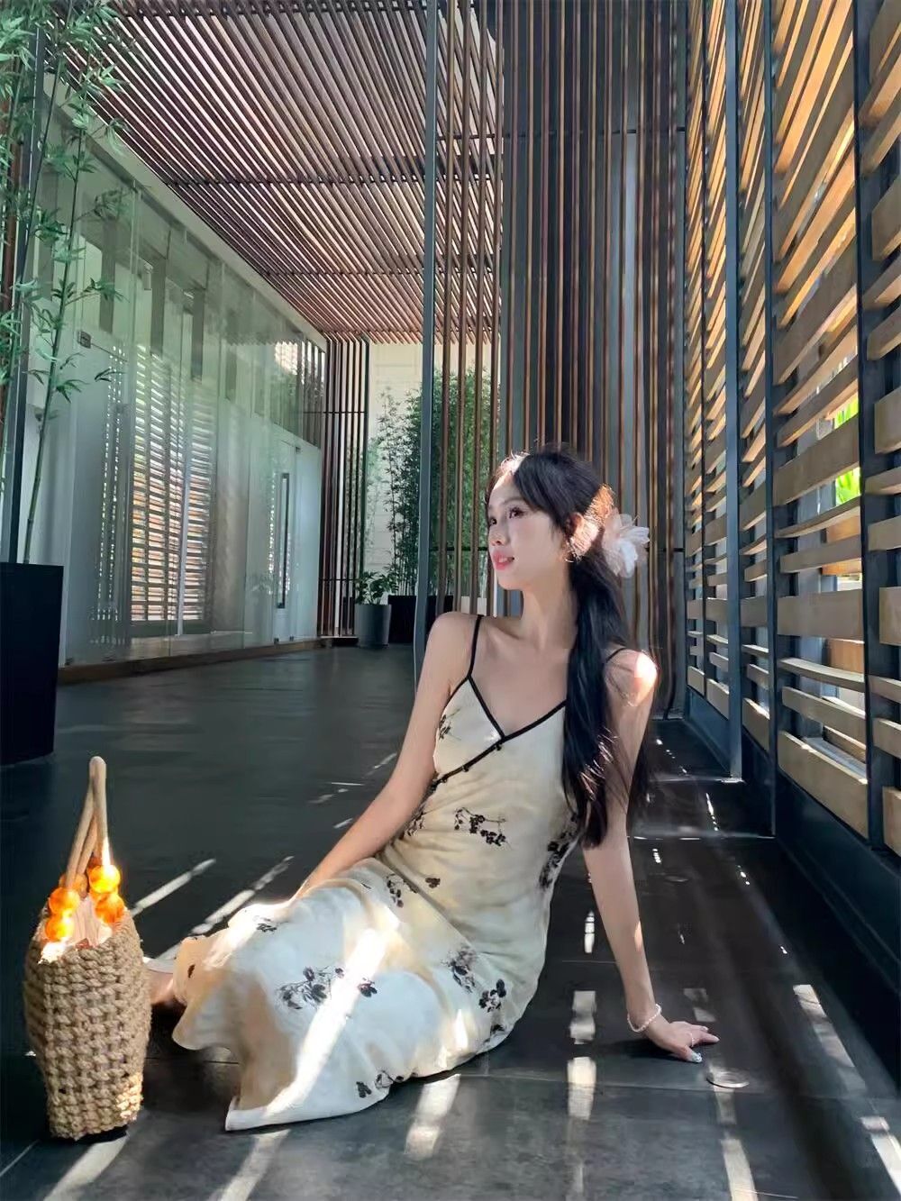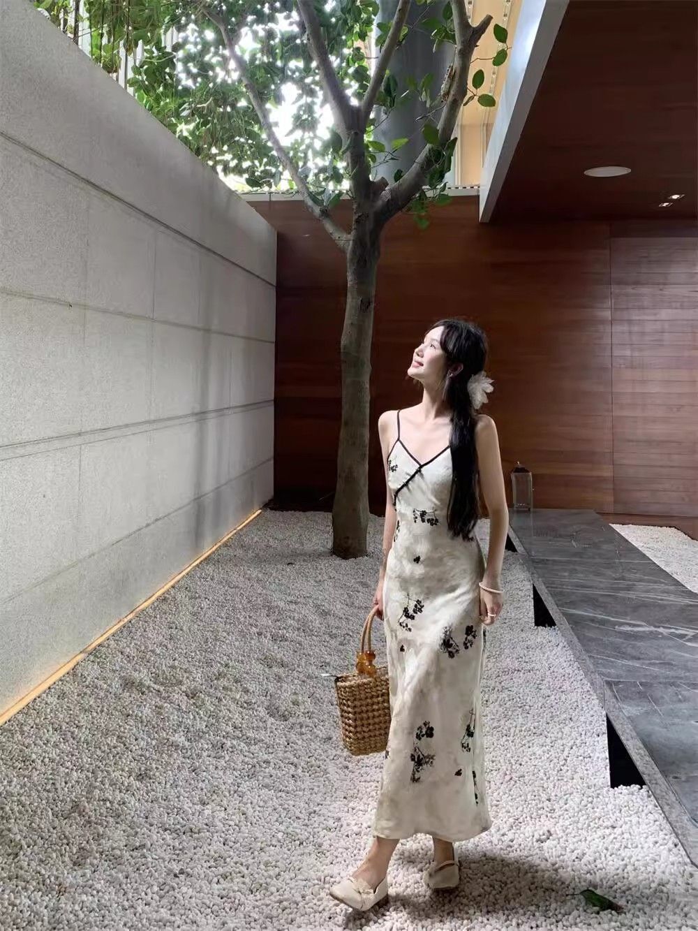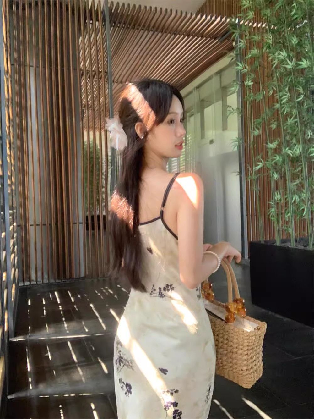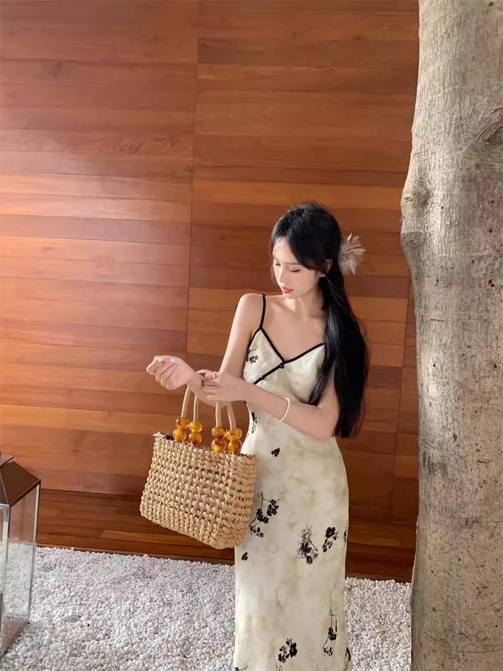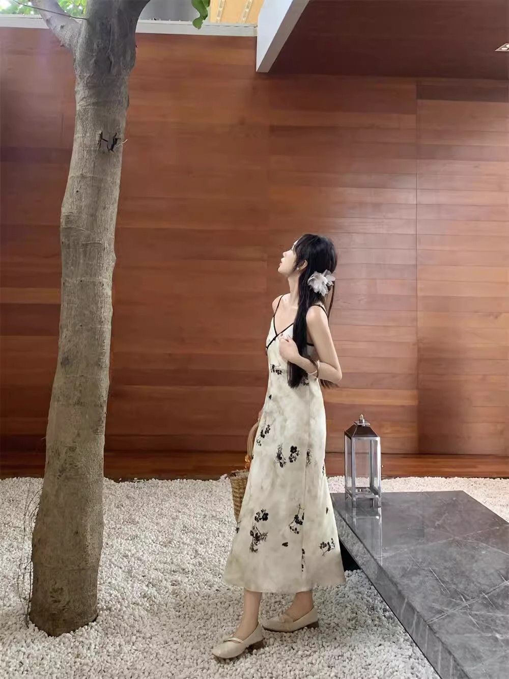 New Chinese style printed halter dress for women, summer new style, Chinese style button V-neck, waist-cinching, slimming, hip-hugging long dress.