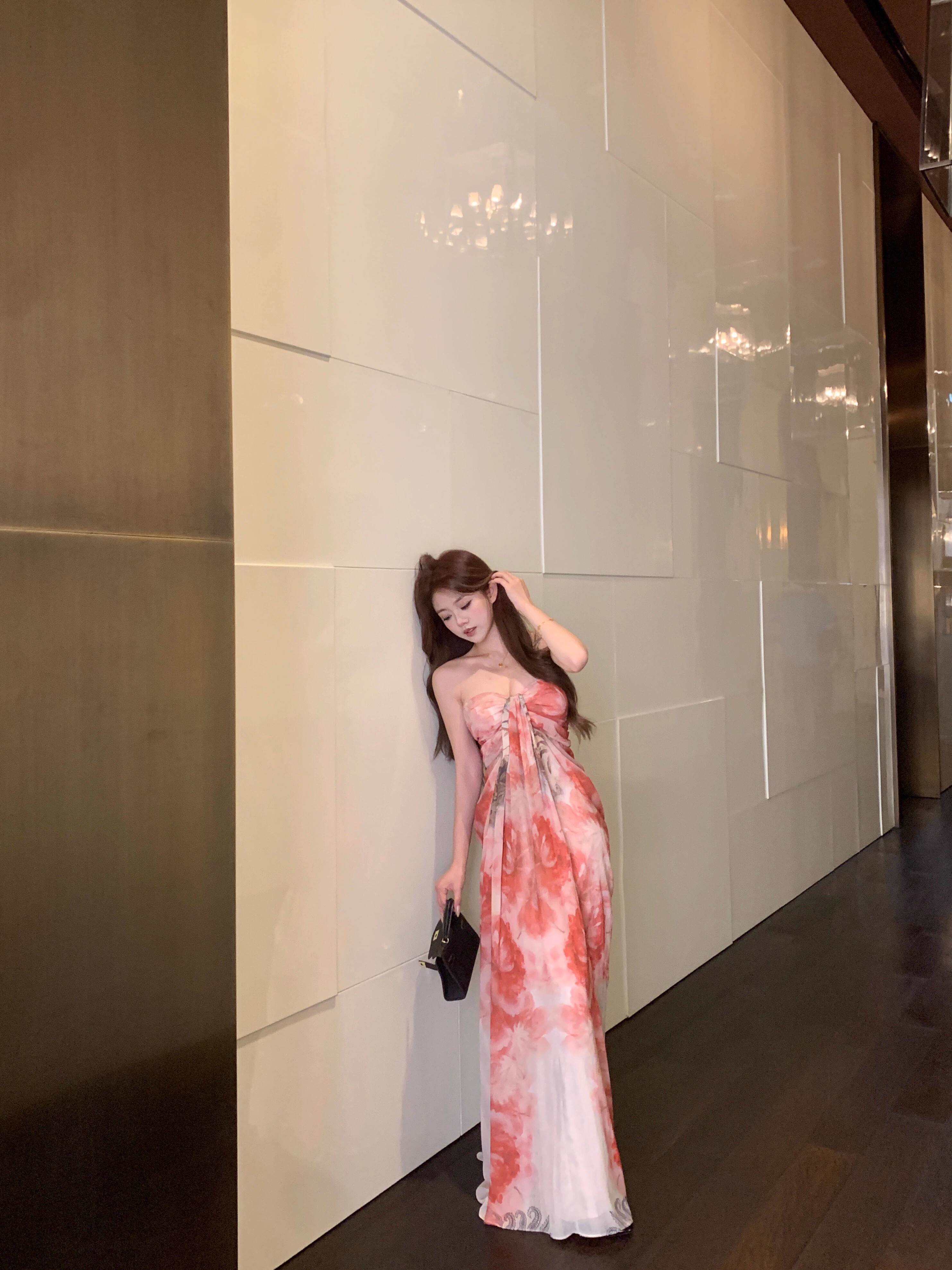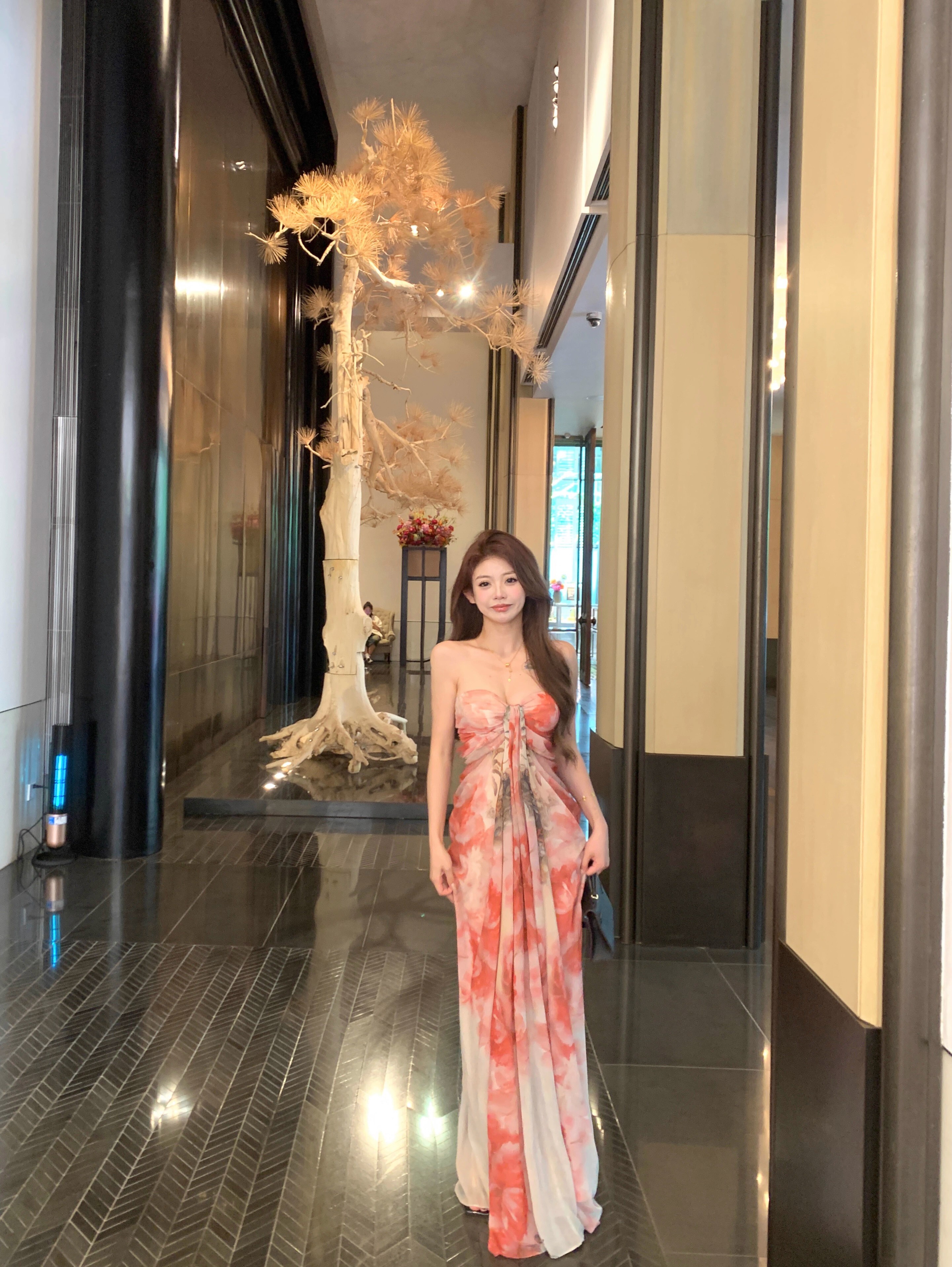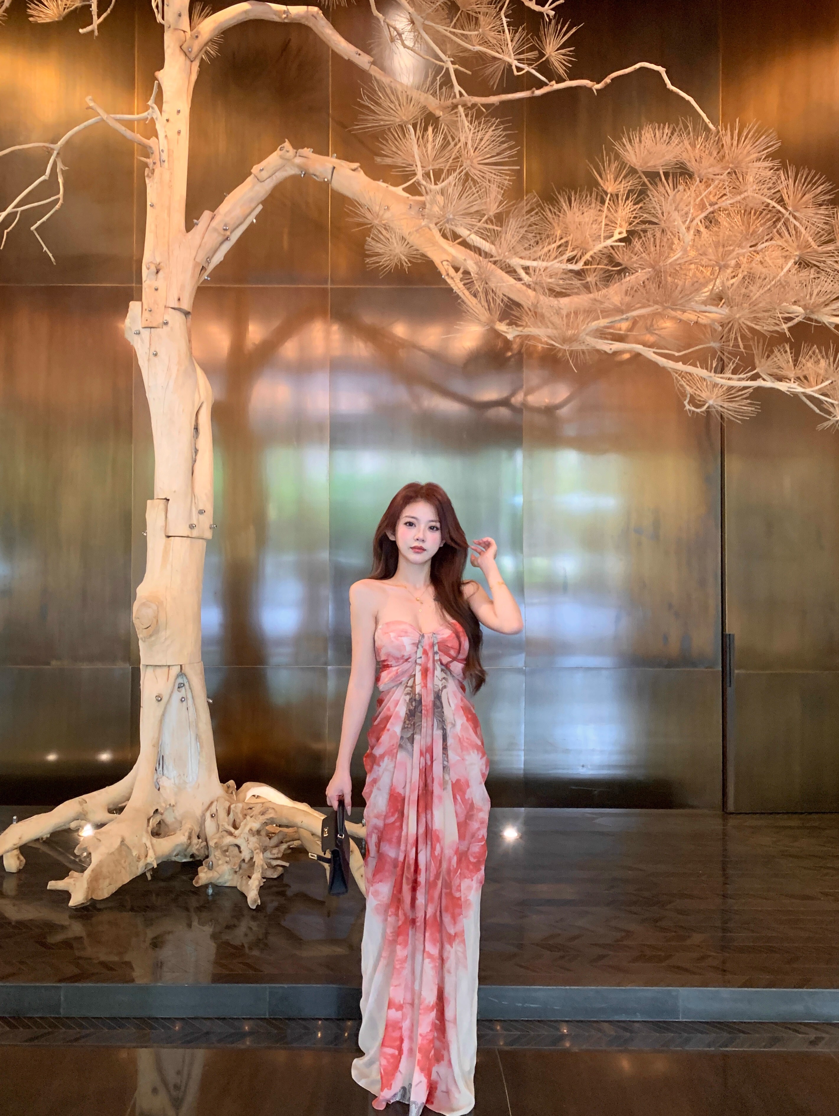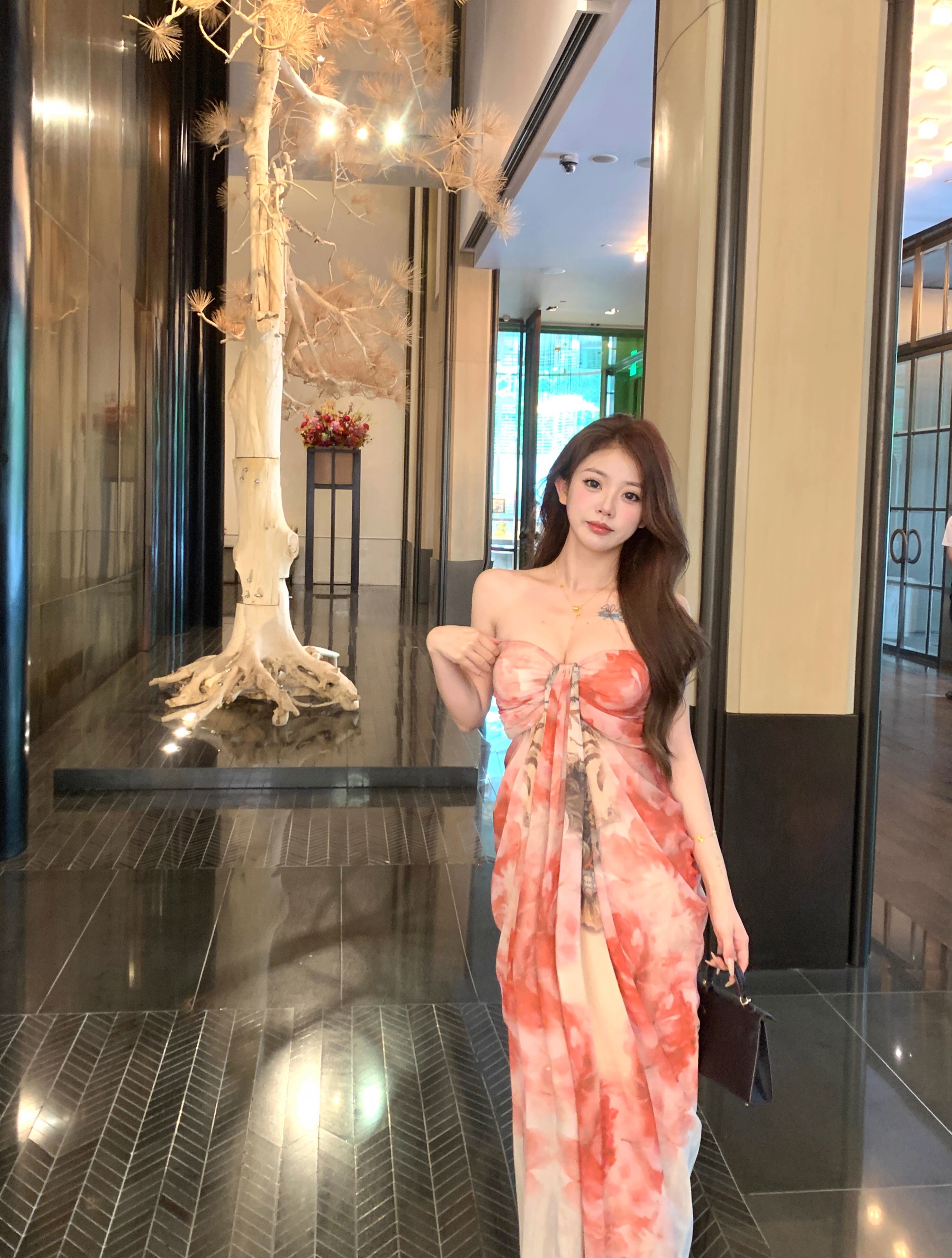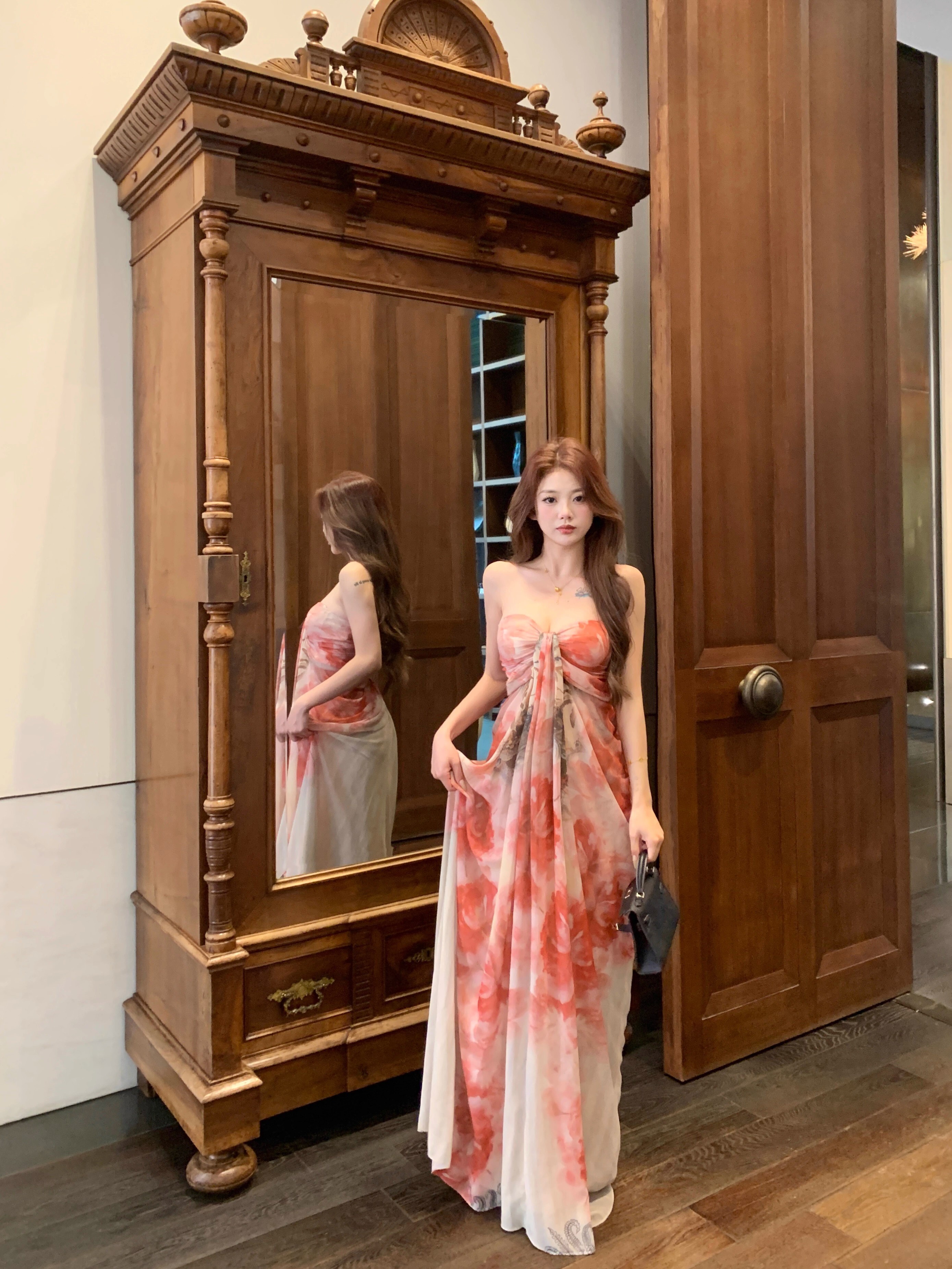 • Pure and elegant tie-dye strapless dress for women, summer style, off-the-shoulder chiffon dress, beach vacation maxi dress