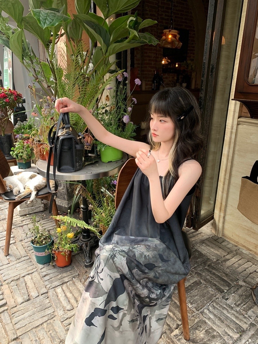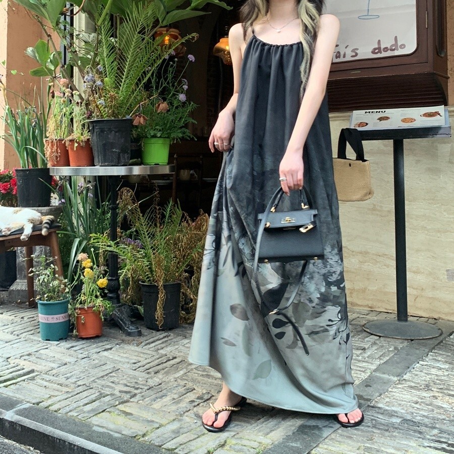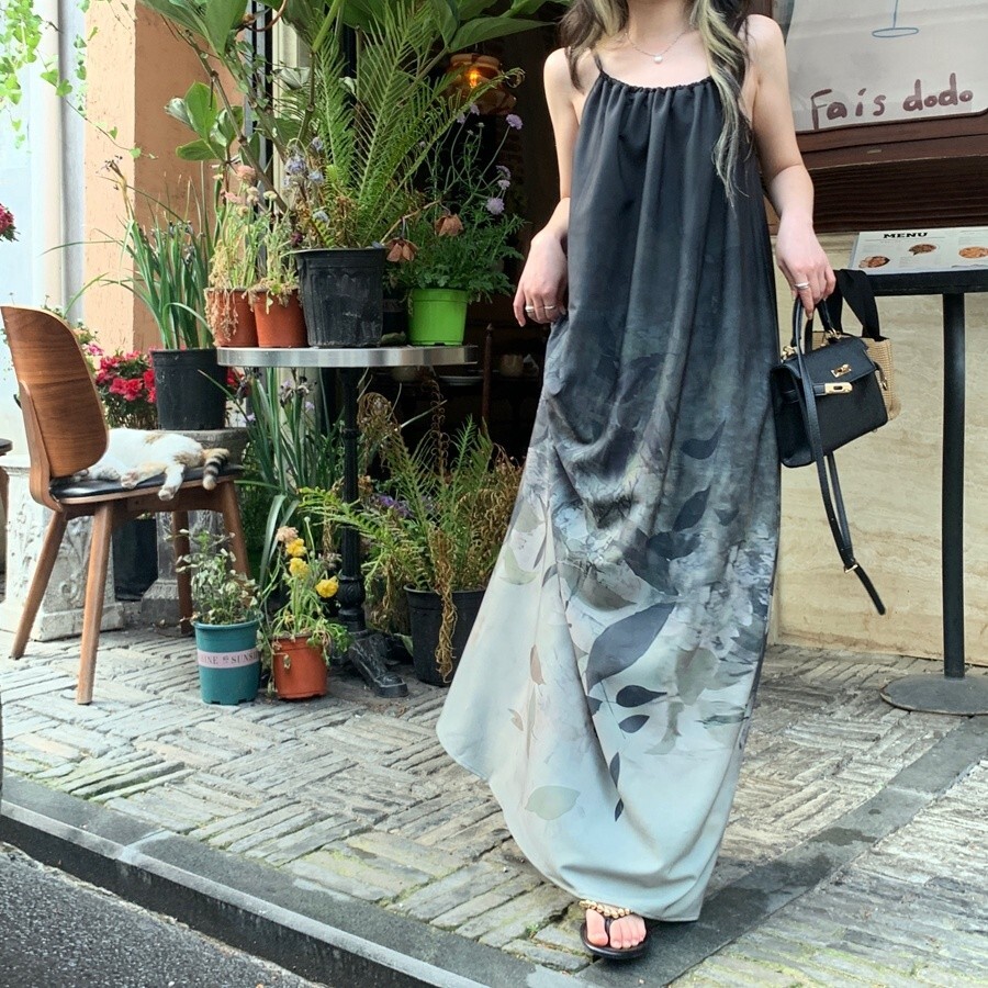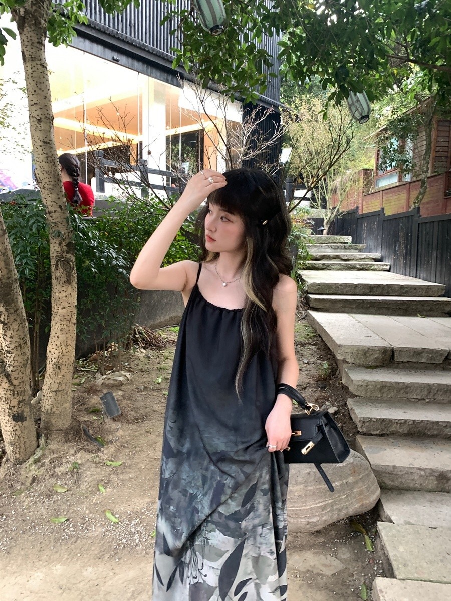• New Chinese style tie-dye floral print halter dress for women, summer design, loose long dress, elegant sleeveless A-line skirt.