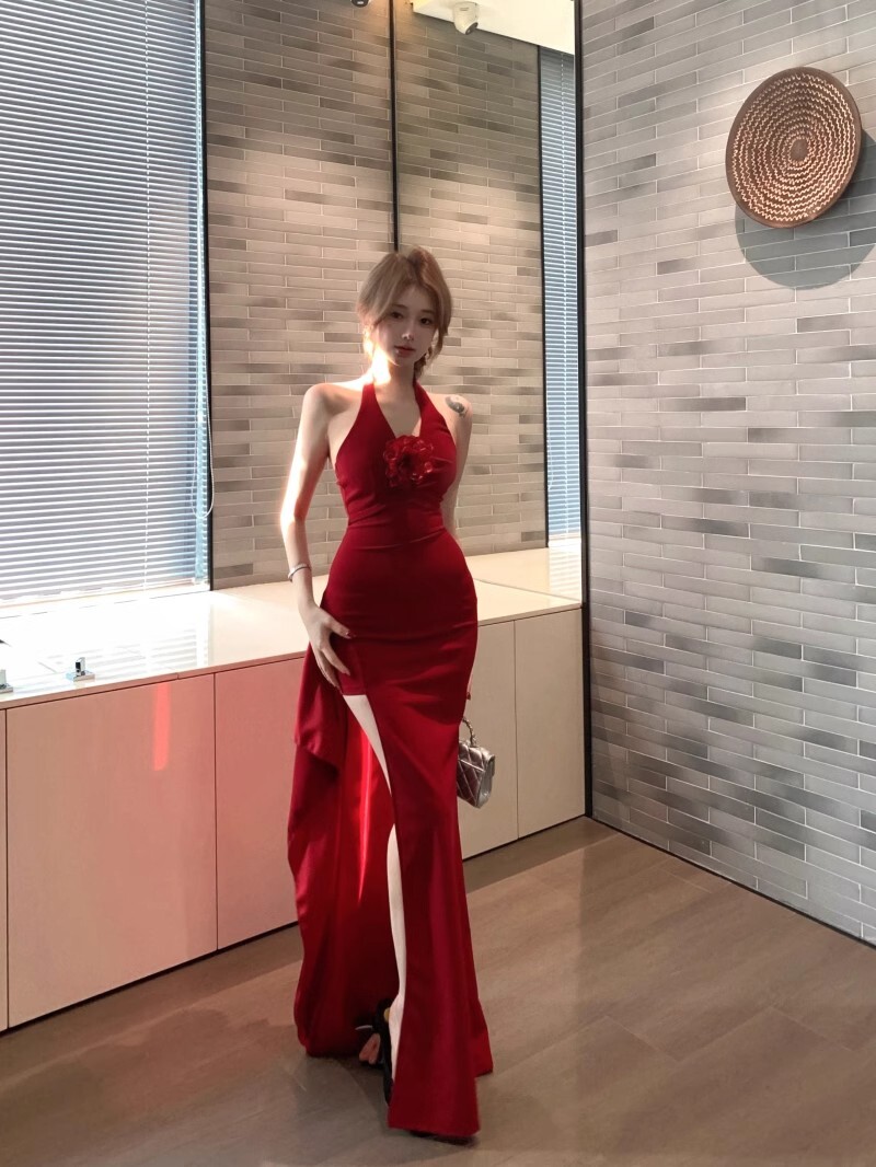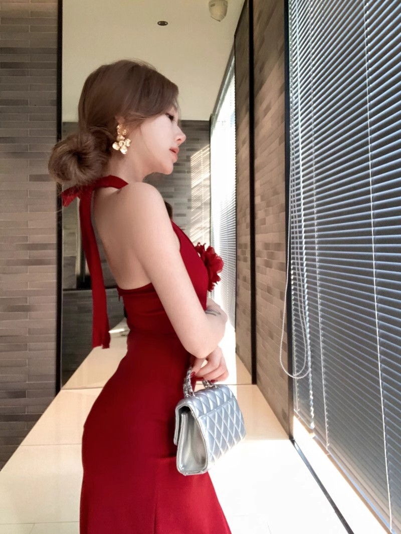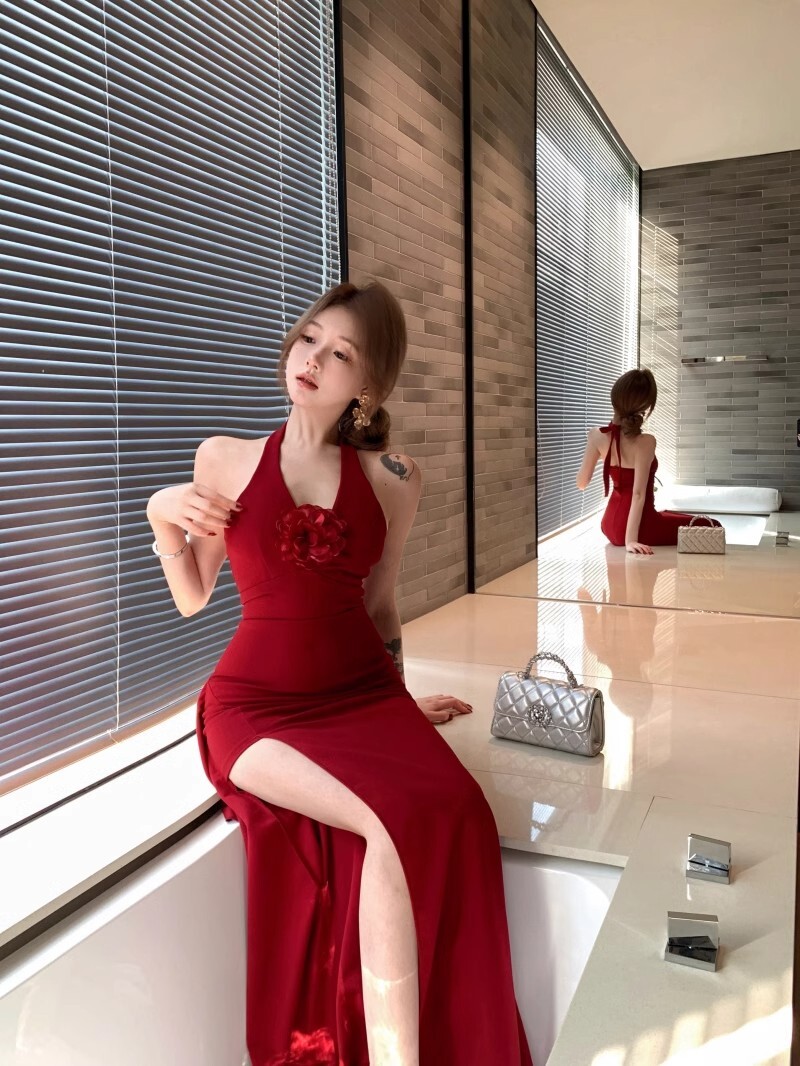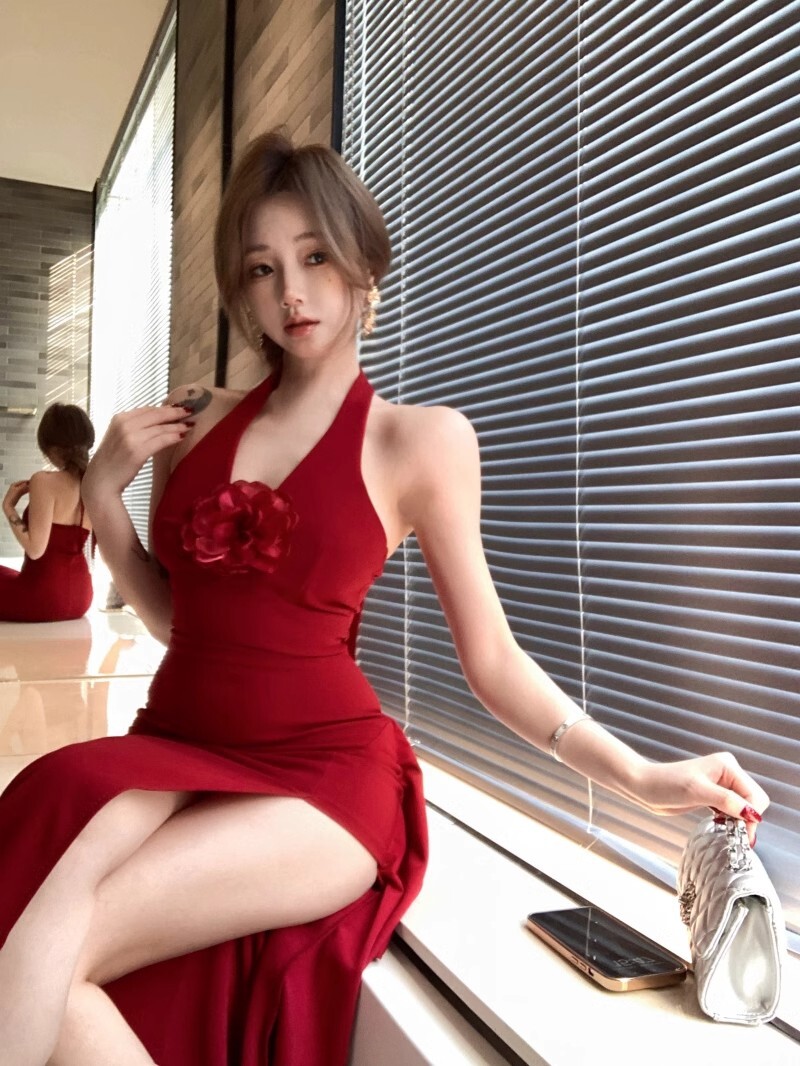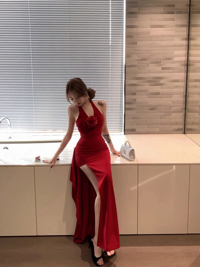 • French-style elegant halter neck dress, new summer style, sexy slit, high waist, slimming bodycon long skirt.