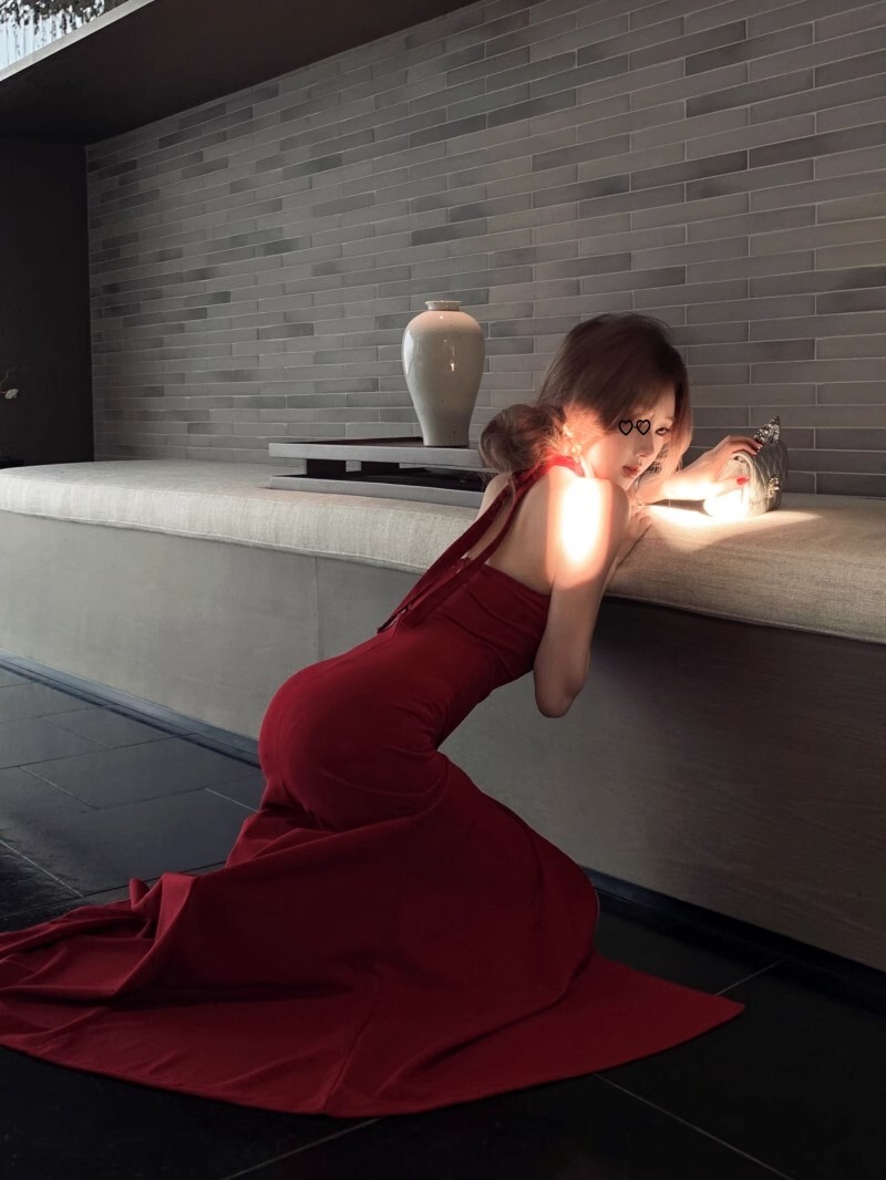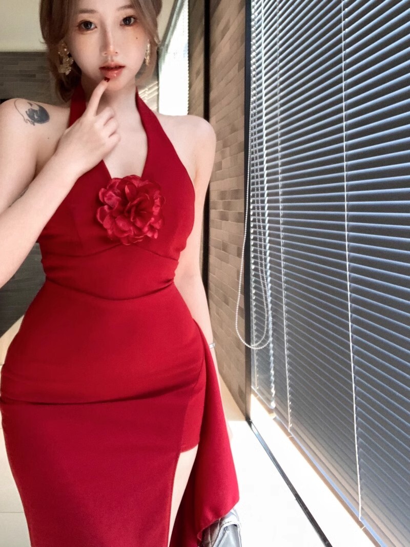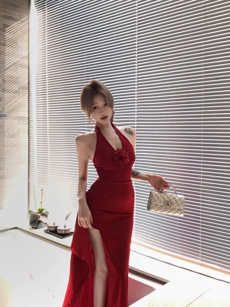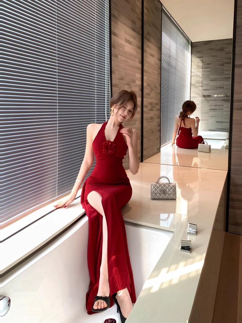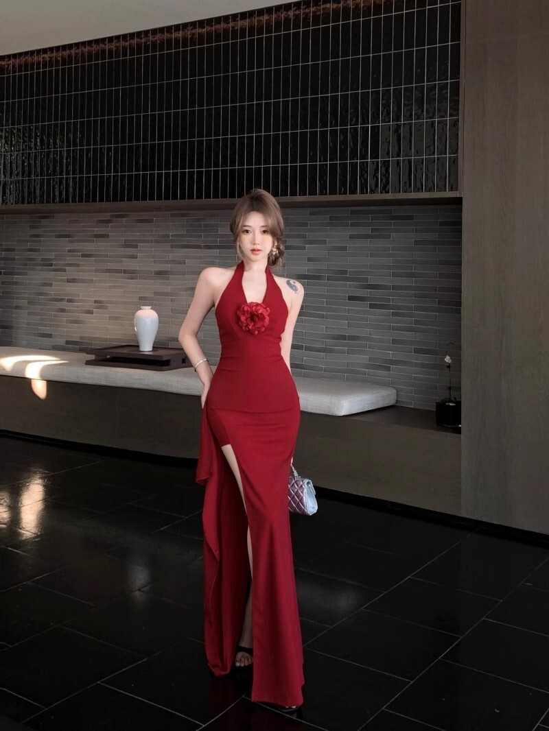 • French-style elegant halter neck dress, new summer style, sexy slit, high waist, slimming bodycon long skirt.