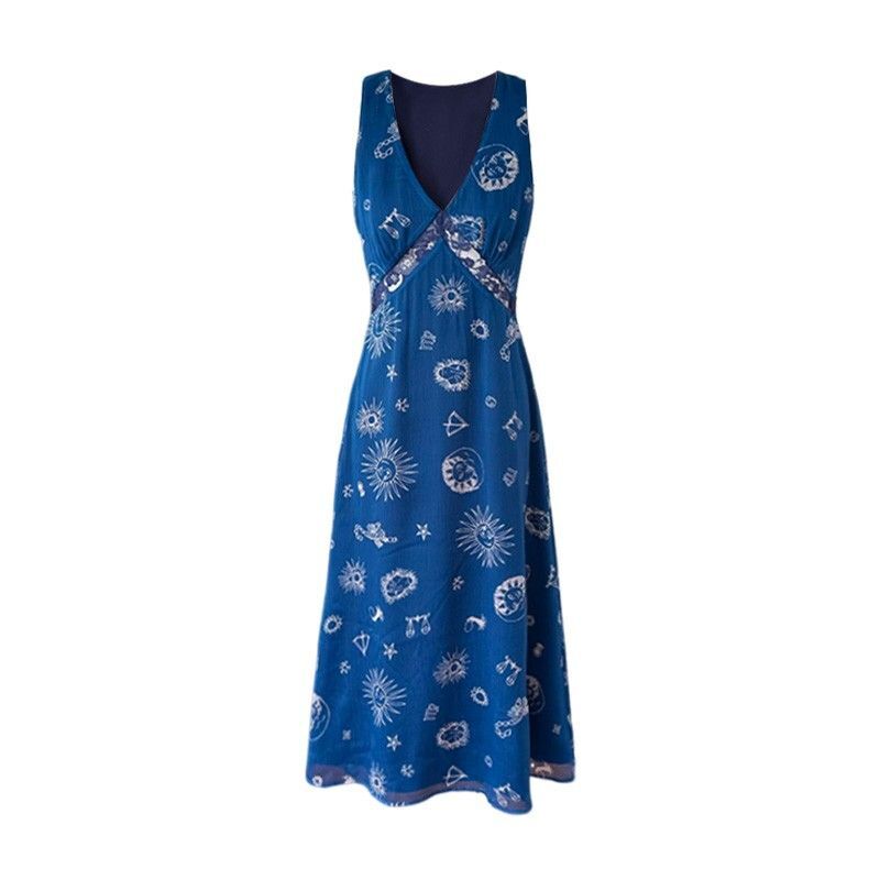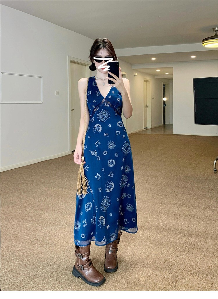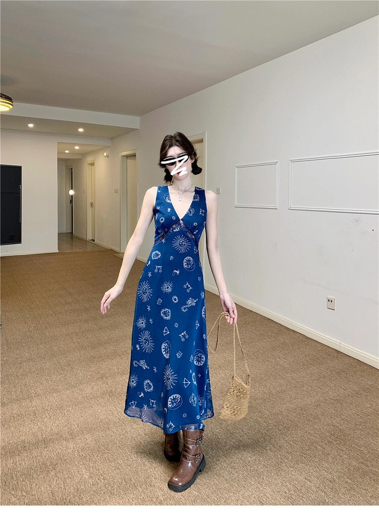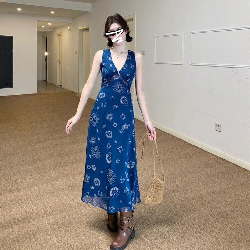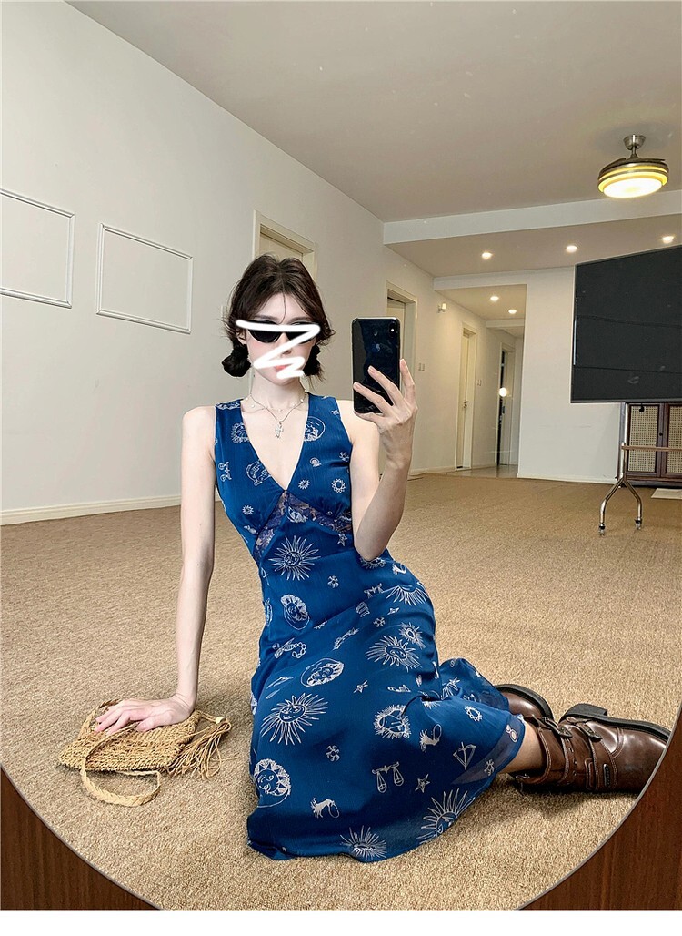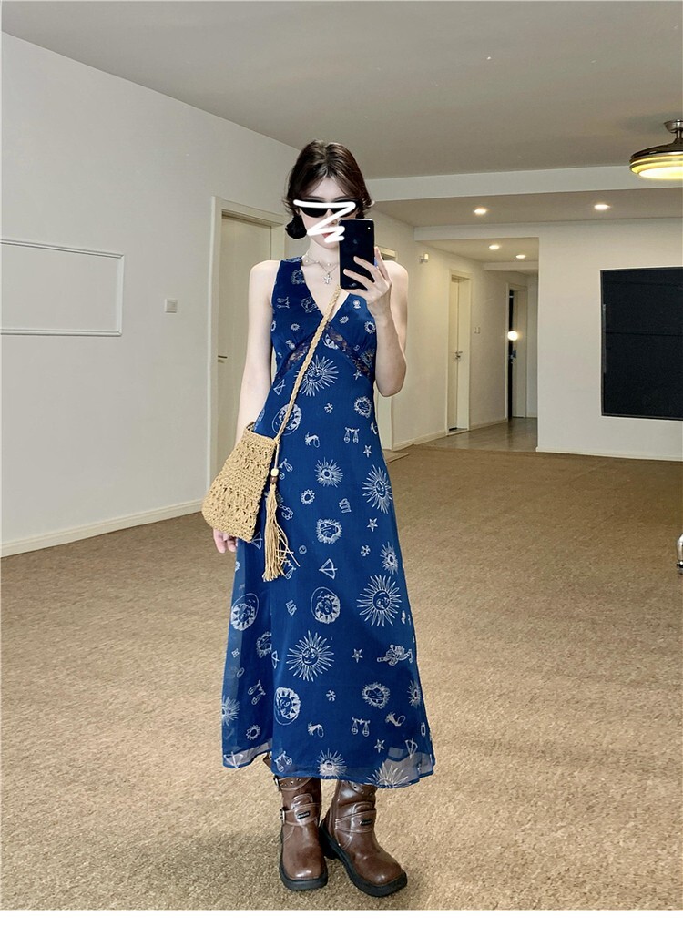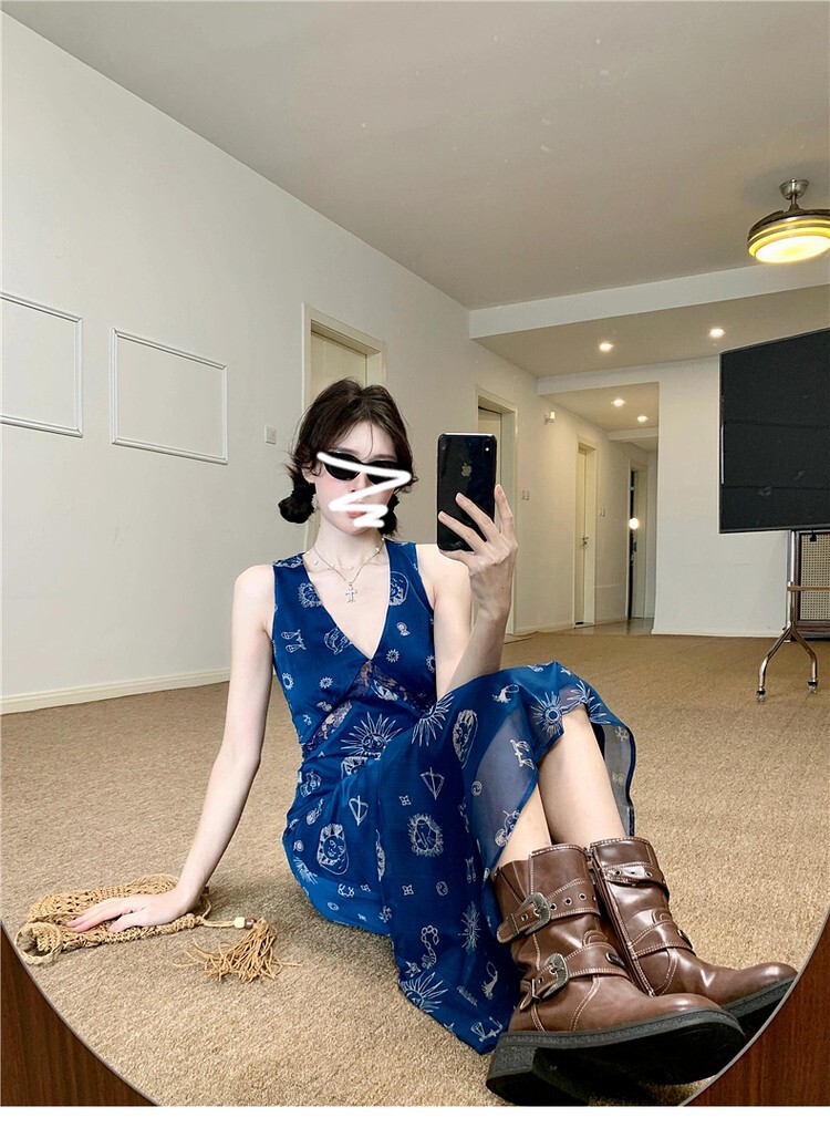 French-style blue floral print sundress for women, new summer 2025 style, perfect for beach vacation.
