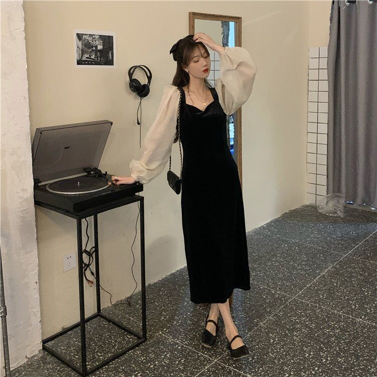 • Hepburn-style little black dress for women, autumn and winter, French retro style, lantern sleeves, mid-length, high-waisted, slimming, square neck velvet dress