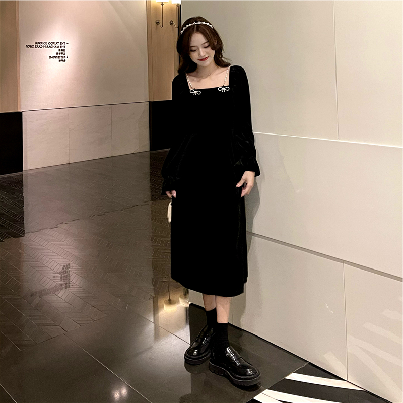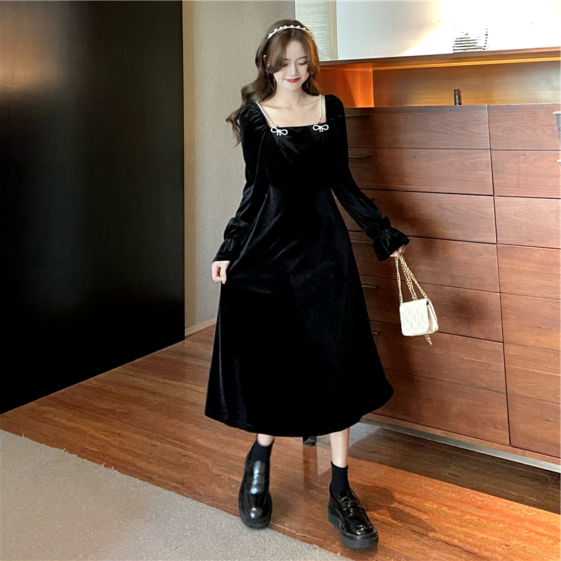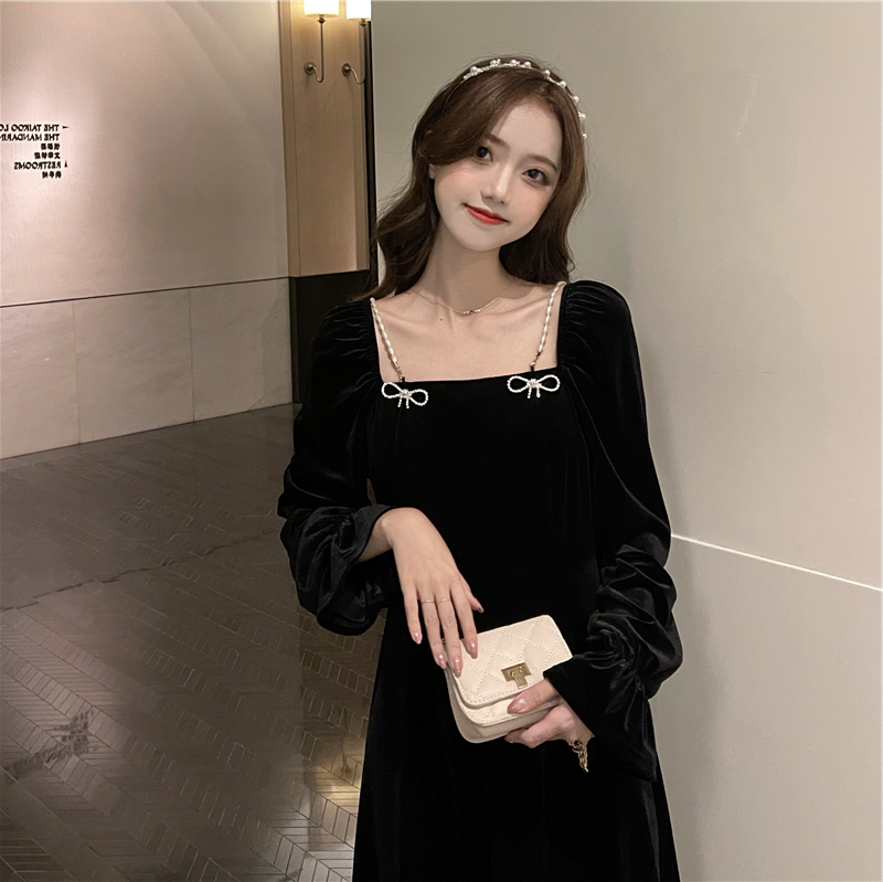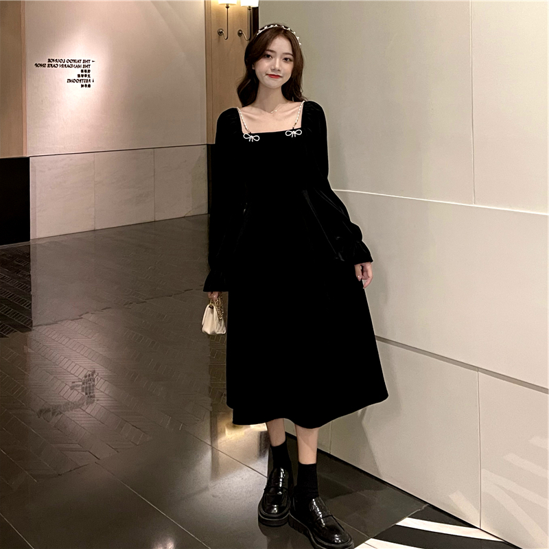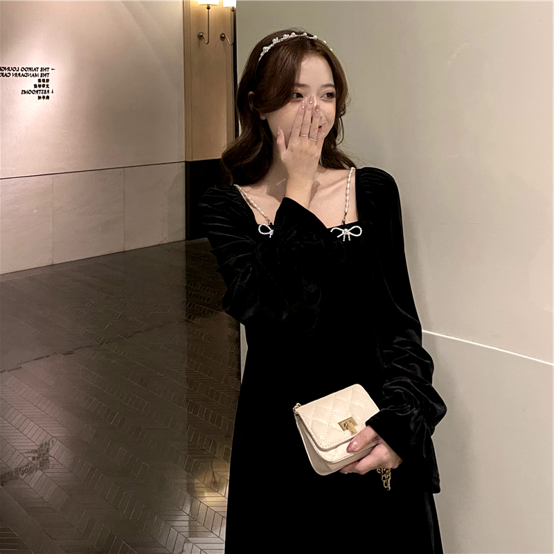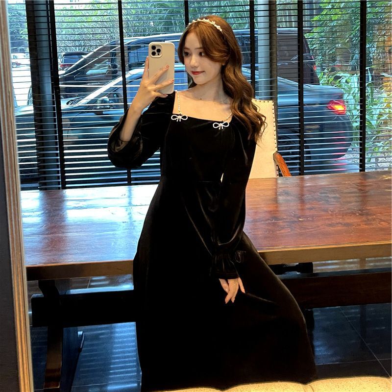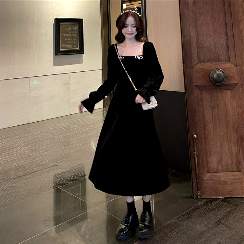 • French retro Hepburn style Chanel-inspired slim-fitting black velvet dress for women in autumn and winter