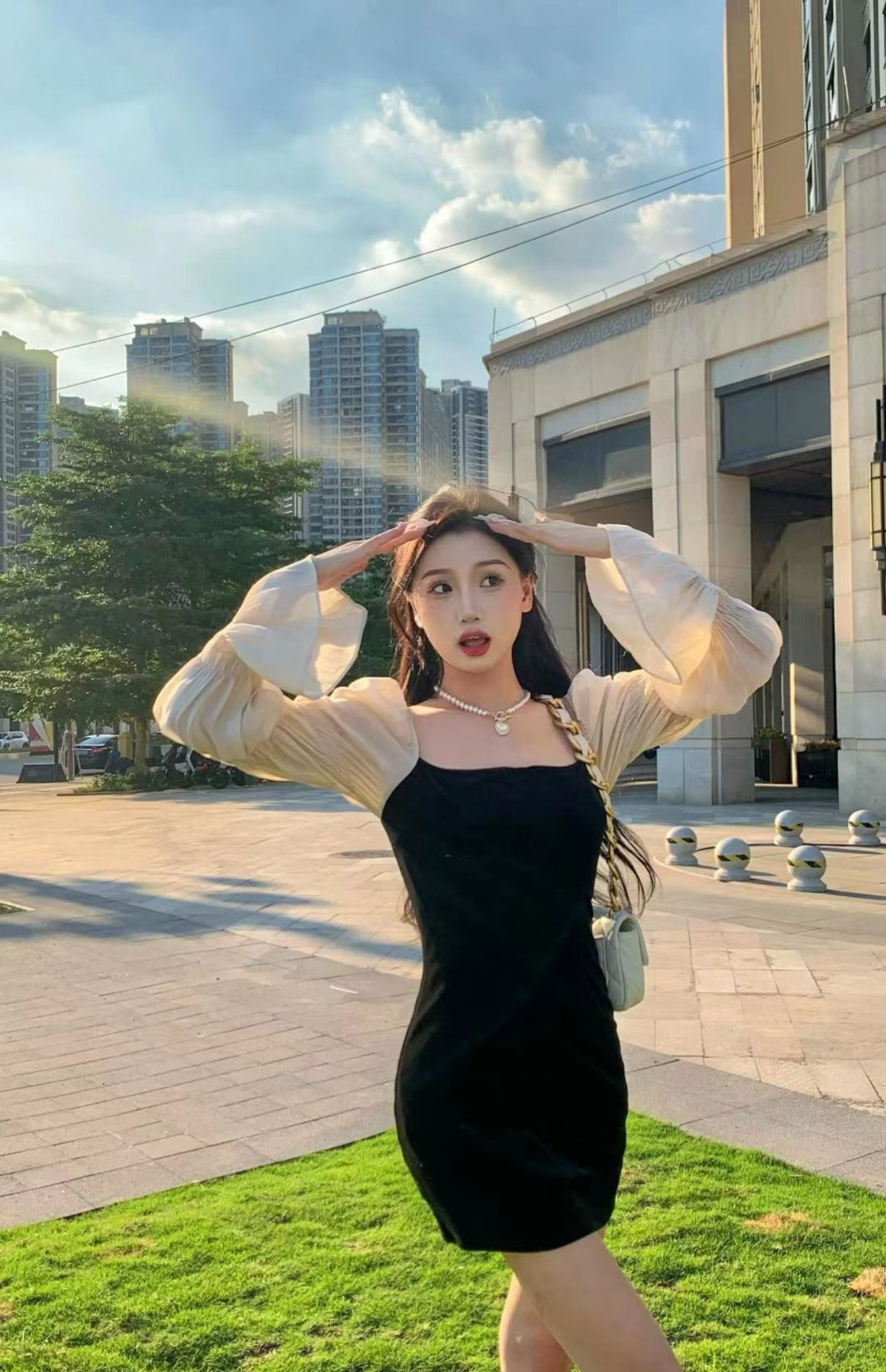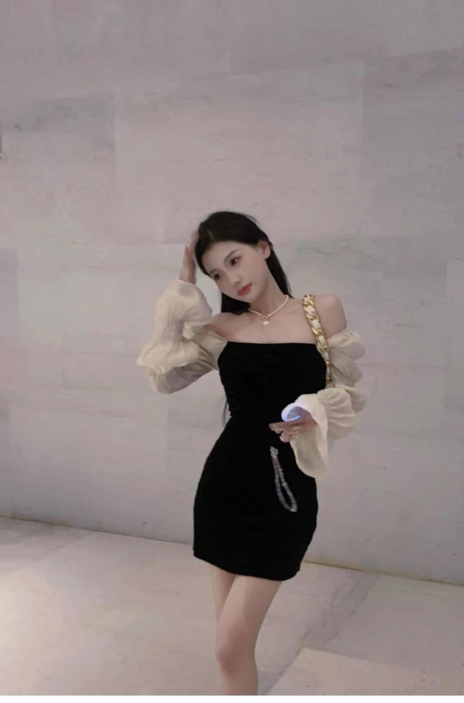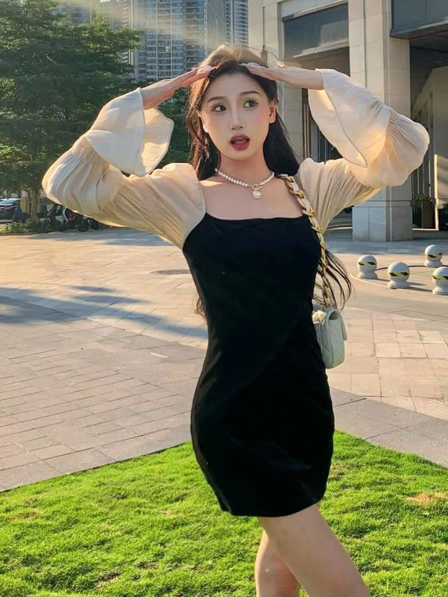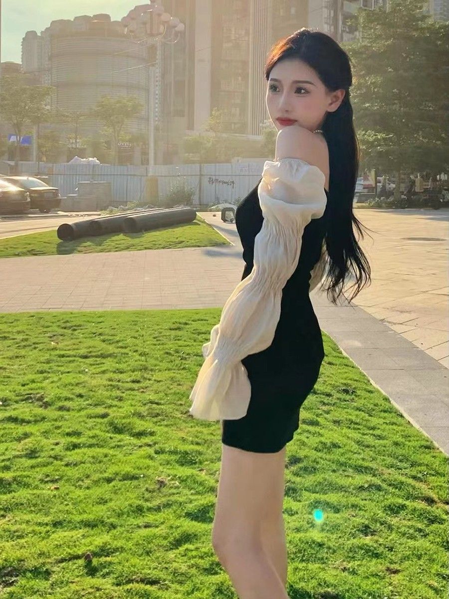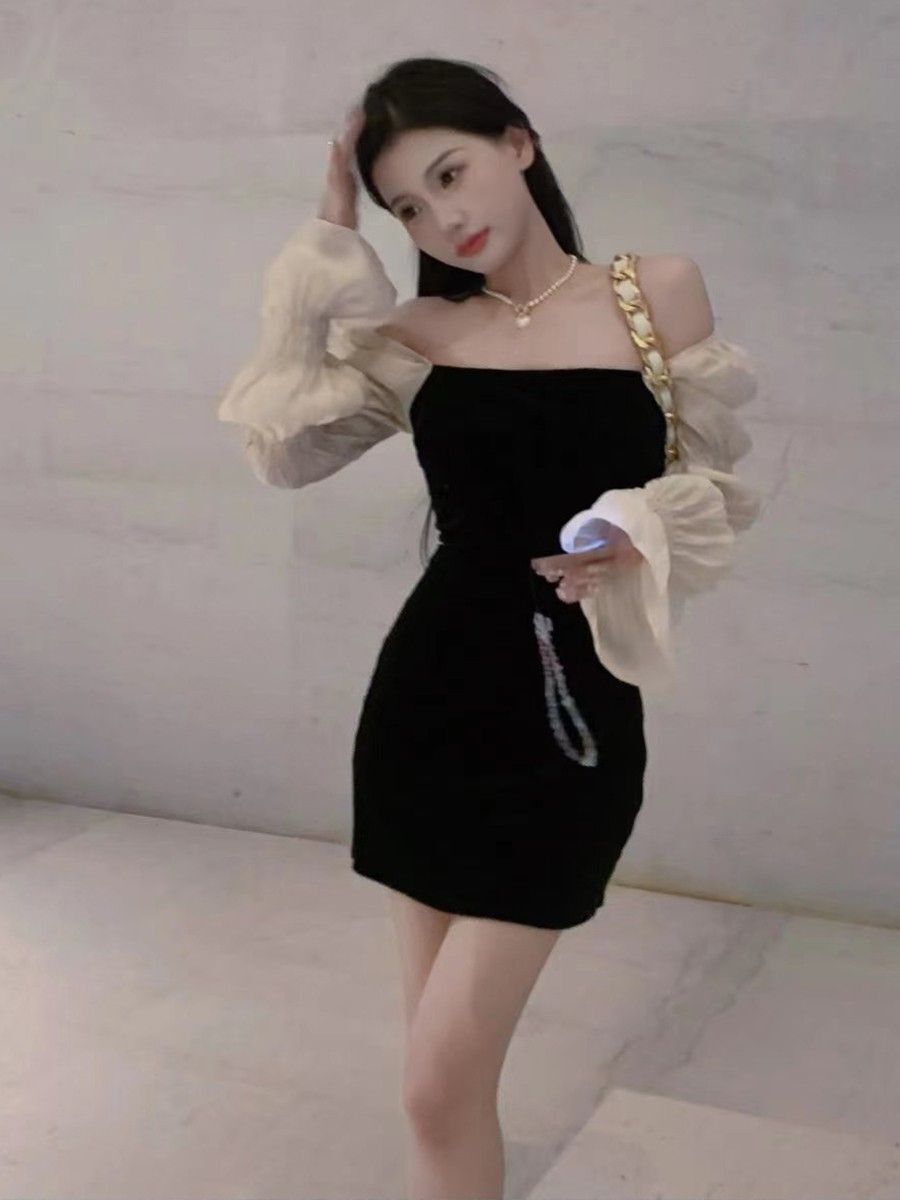 • French-style elegant strapless little black dress, luxurious puff sleeve dress, sweet and spicy sexy slimming dress