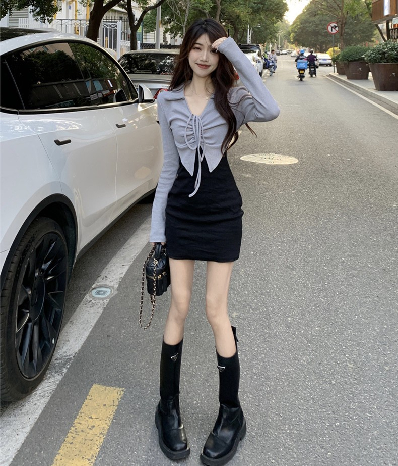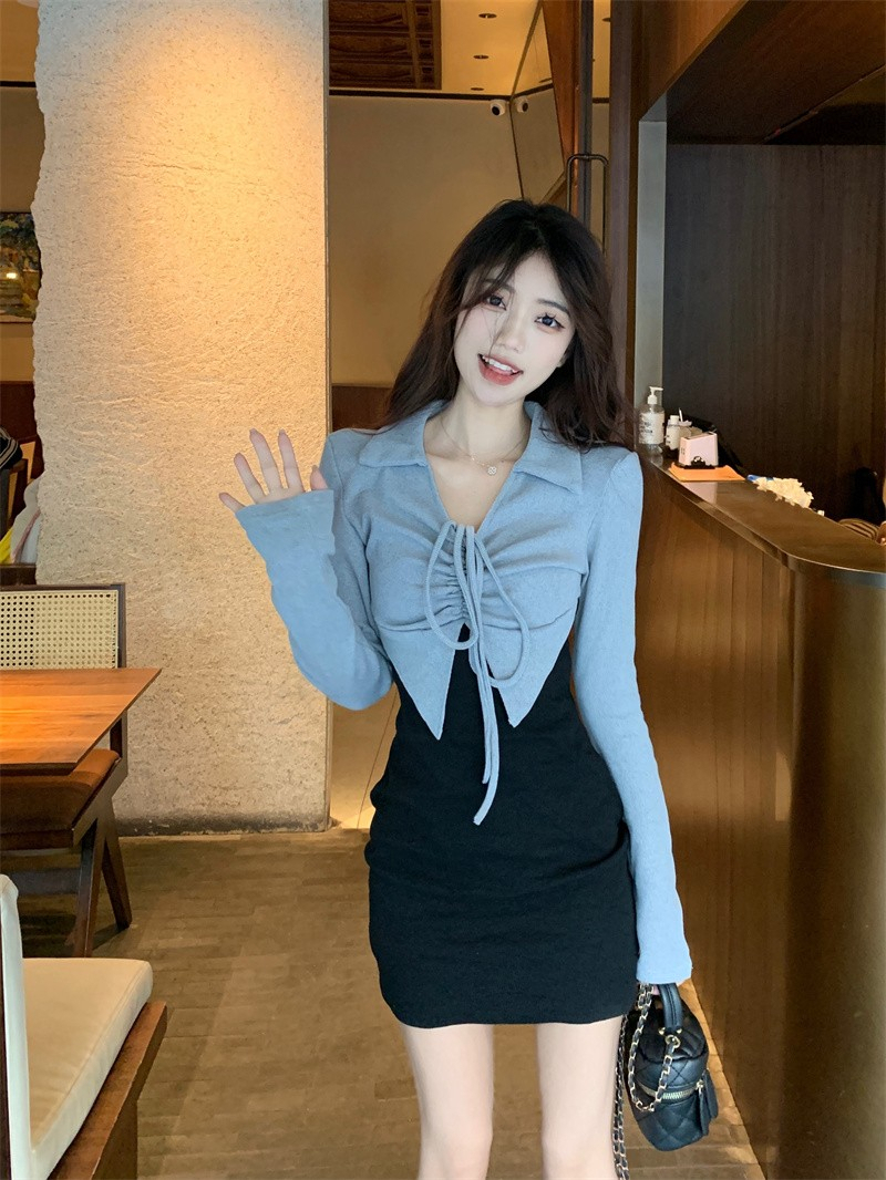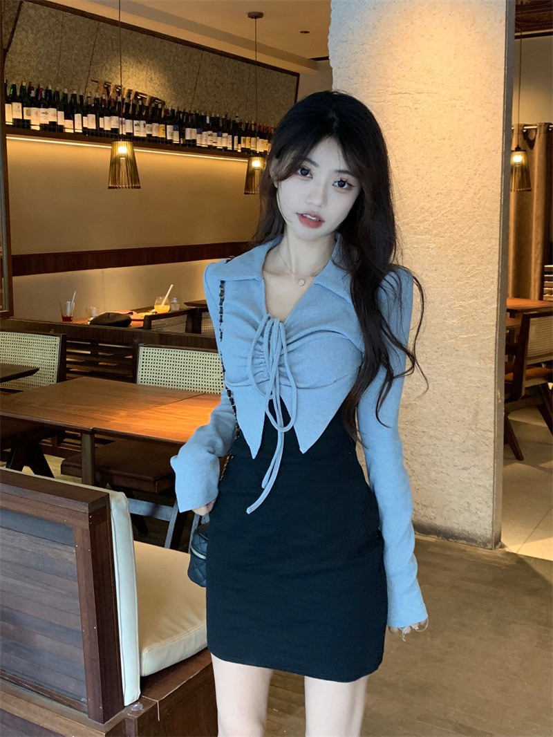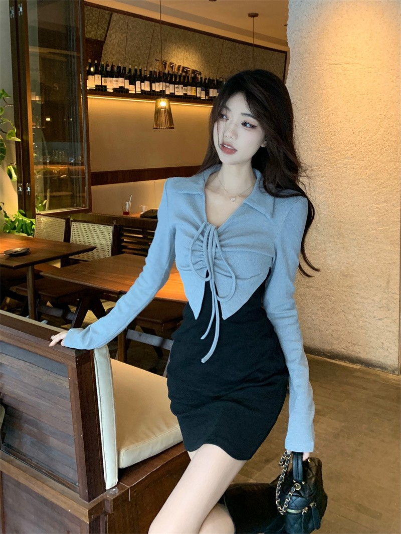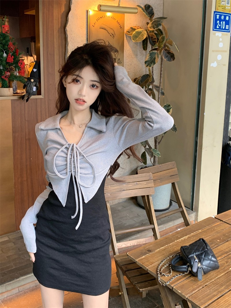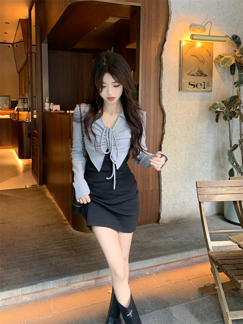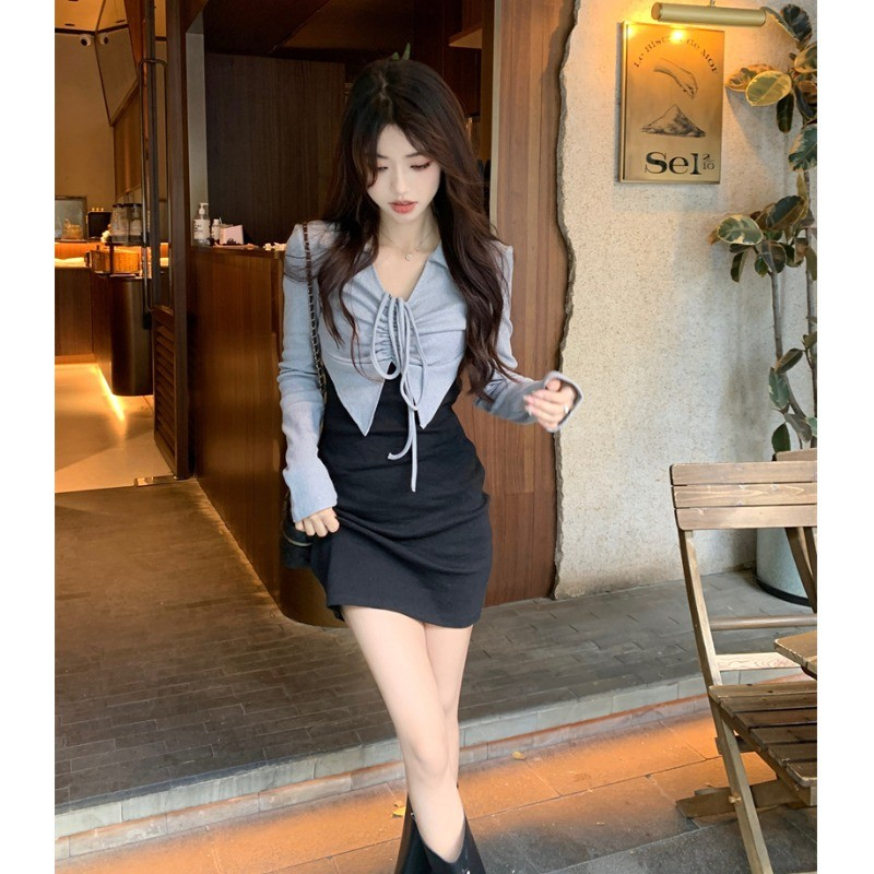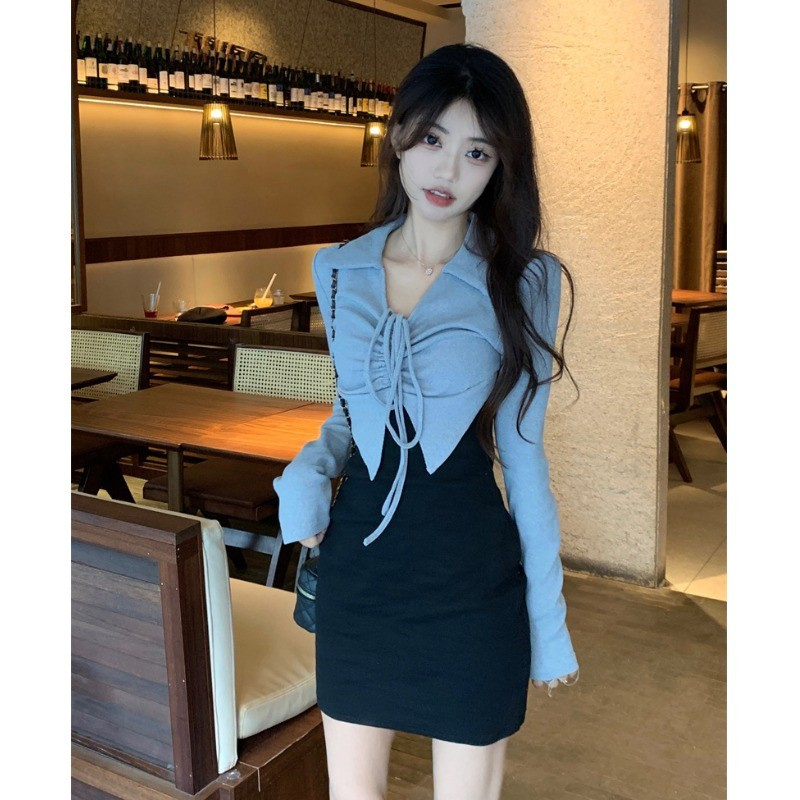 • French-style mature and elegant long-sleeved two-piece dress for women, perfect for autumn, exuding a sophisticated and sexy vibe, perfect for bodycon skirts and short skirts.