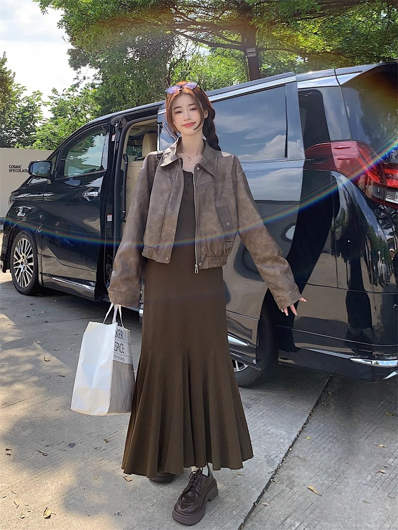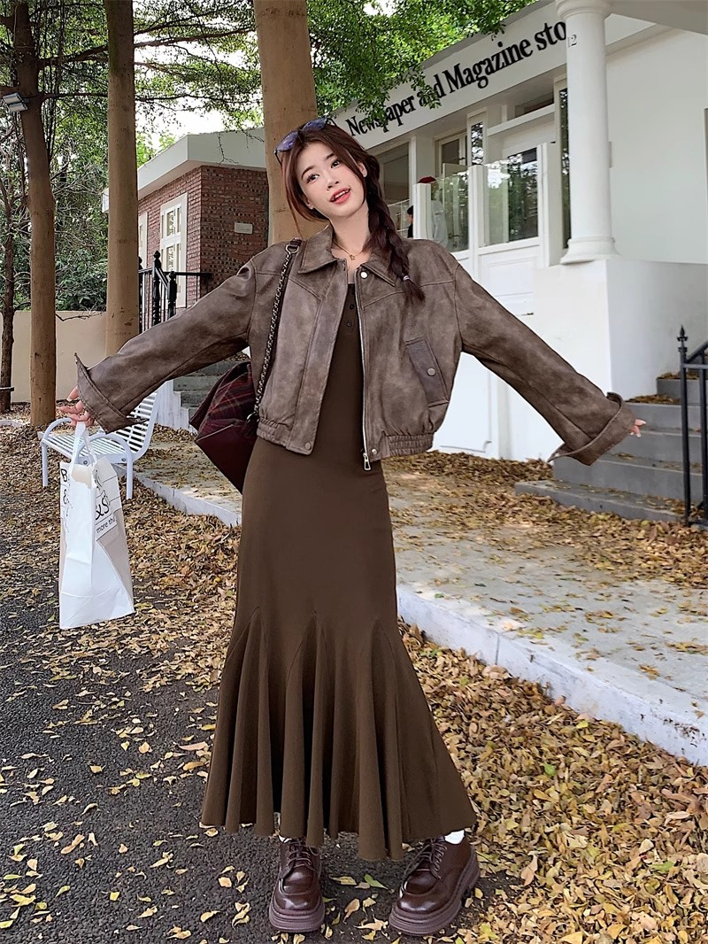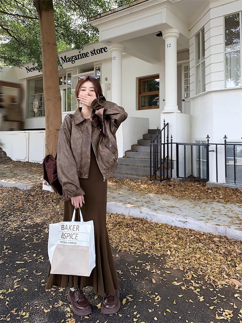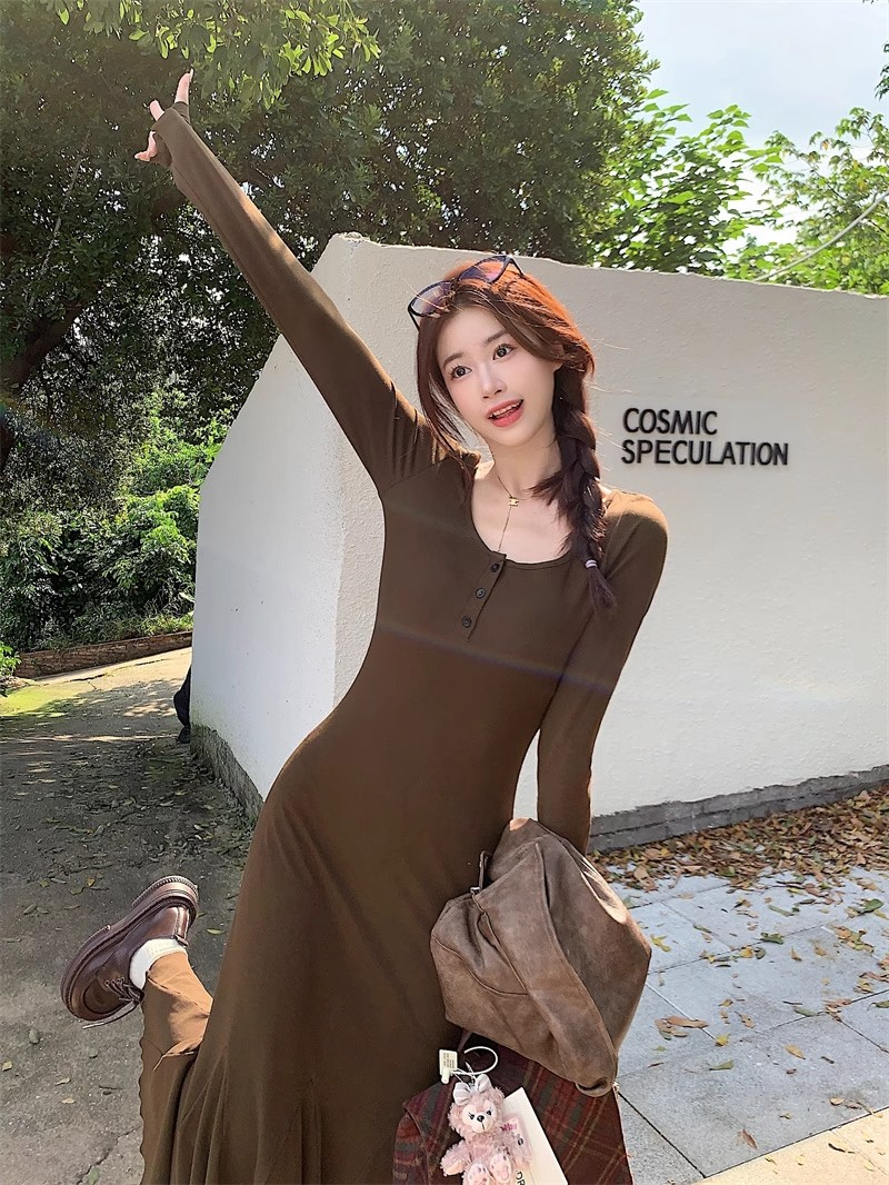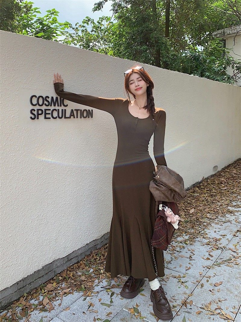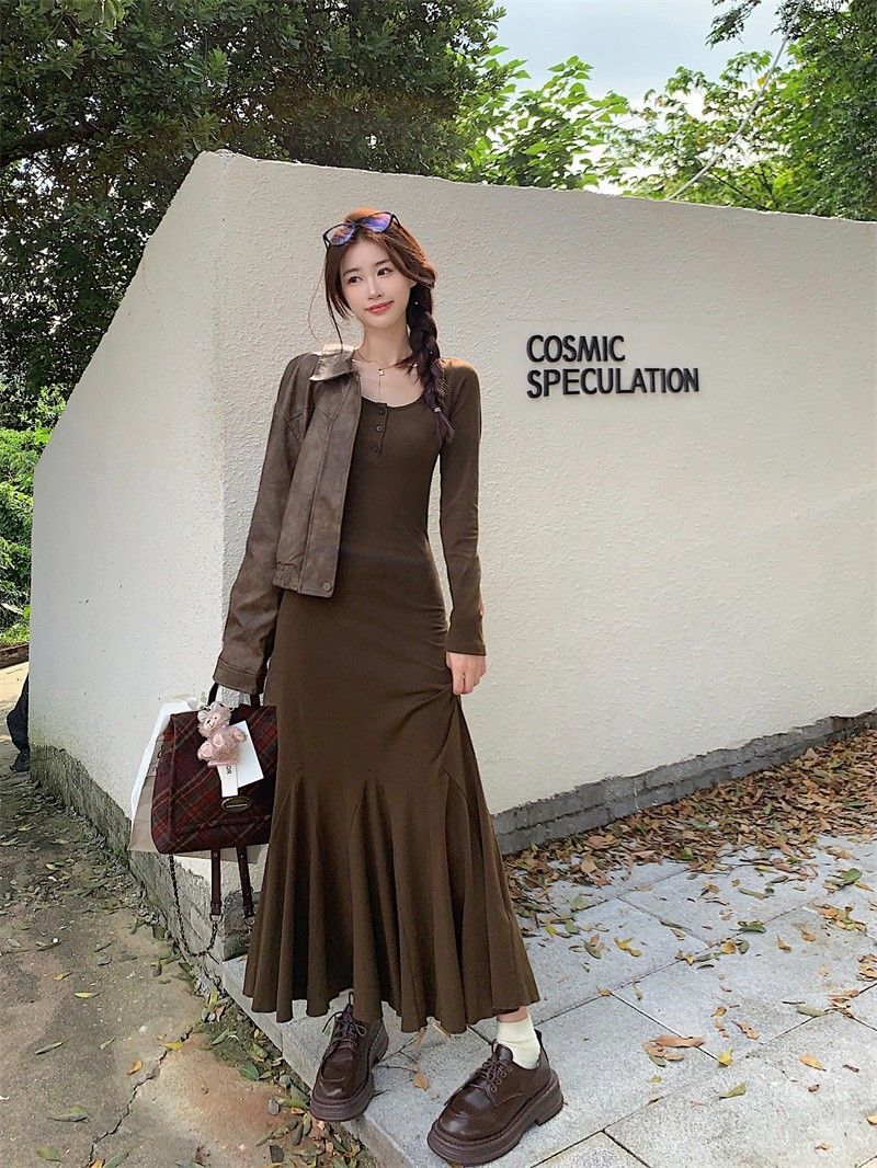 Women's Autumn Slim-fitting, Flattering Long-sleeved Brown Dress with Waist-cinching Bodycon Skirt and Fishtail Hem - Black Long Skirt