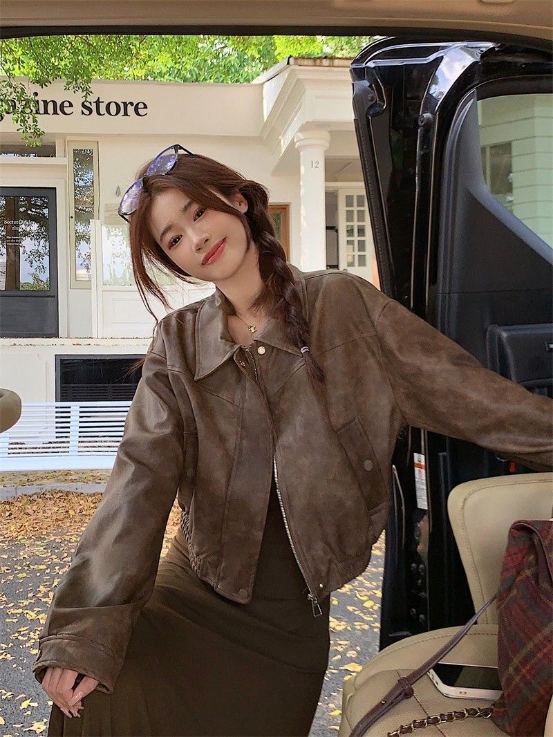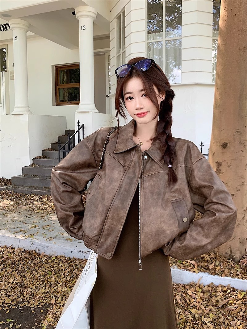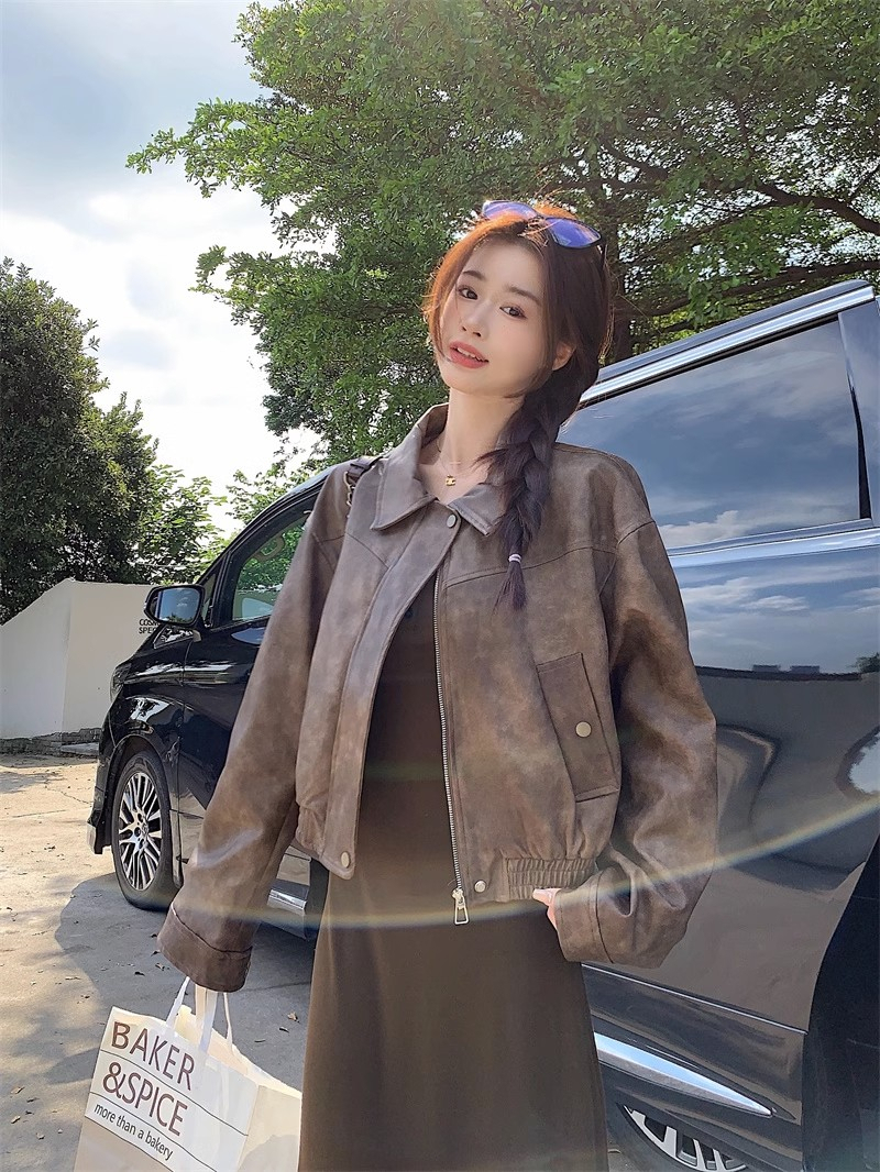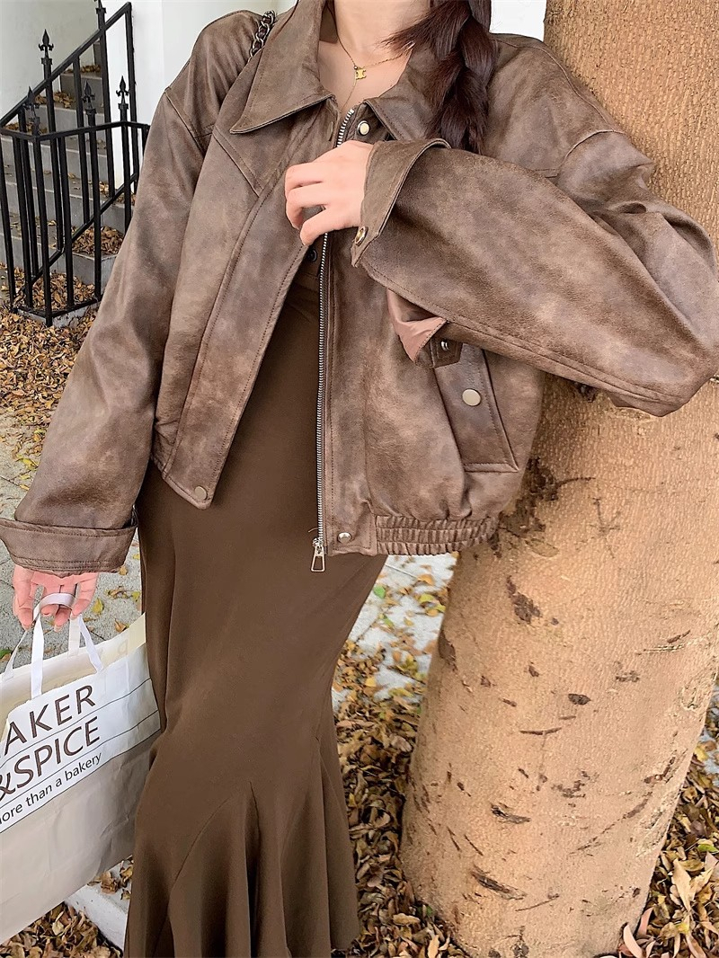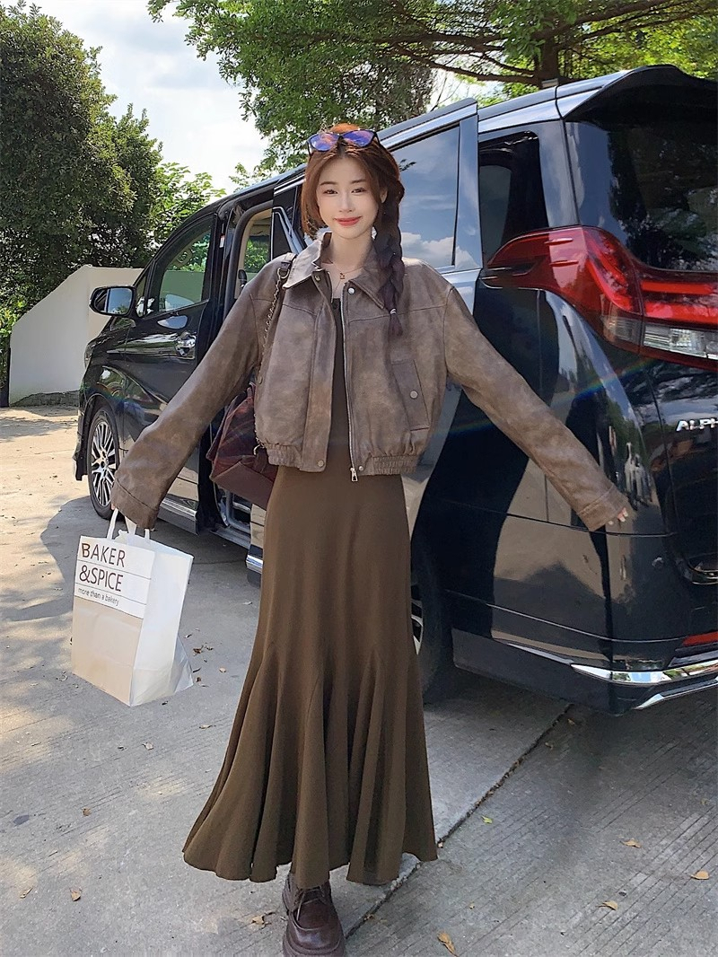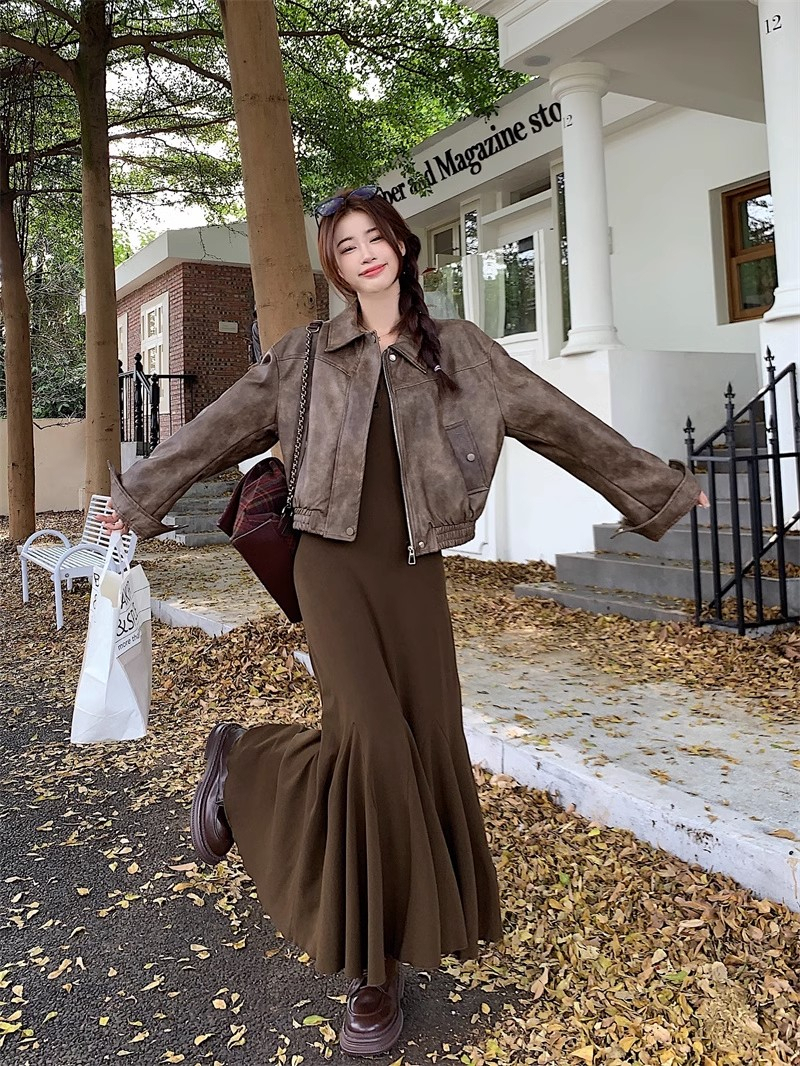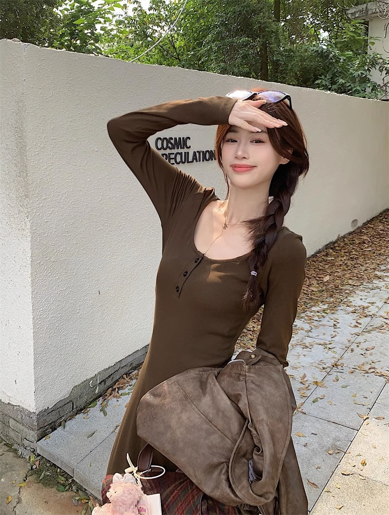 Women's Autumn Slim-fitting, Flattering Long-sleeved Brown Dress with Waist-cinching Bodycon Skirt and Fishtail Hem - Black Long Skirt