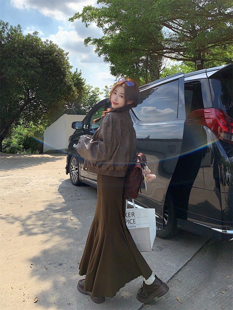 • Women's Autumn Slim-fitting, Flattering Long-sleeved Brown Dress with Waist-cinching Bodycon Skirt and Fishtail Hem - Black Long Skirt