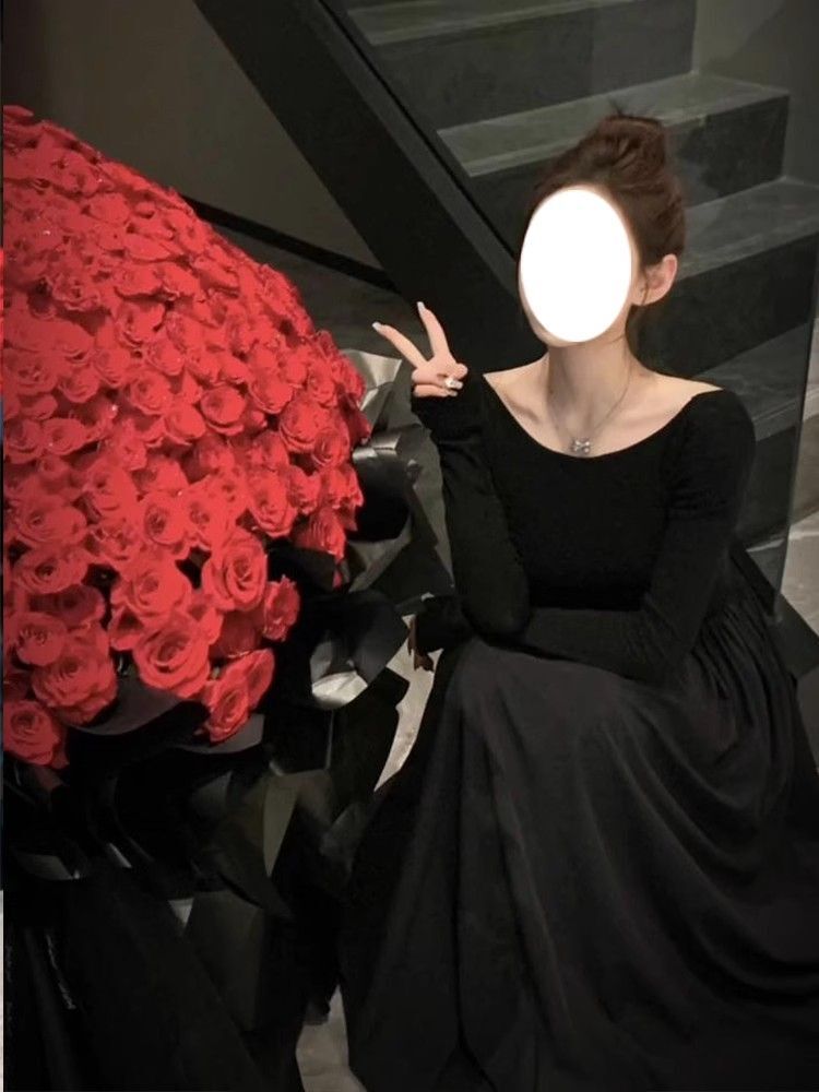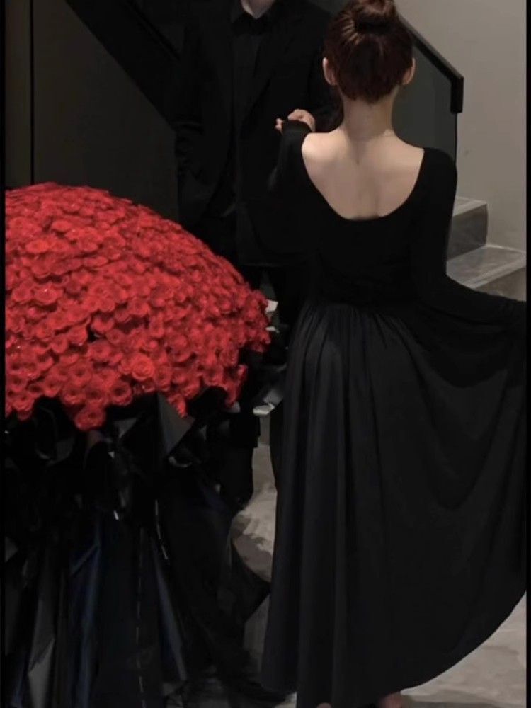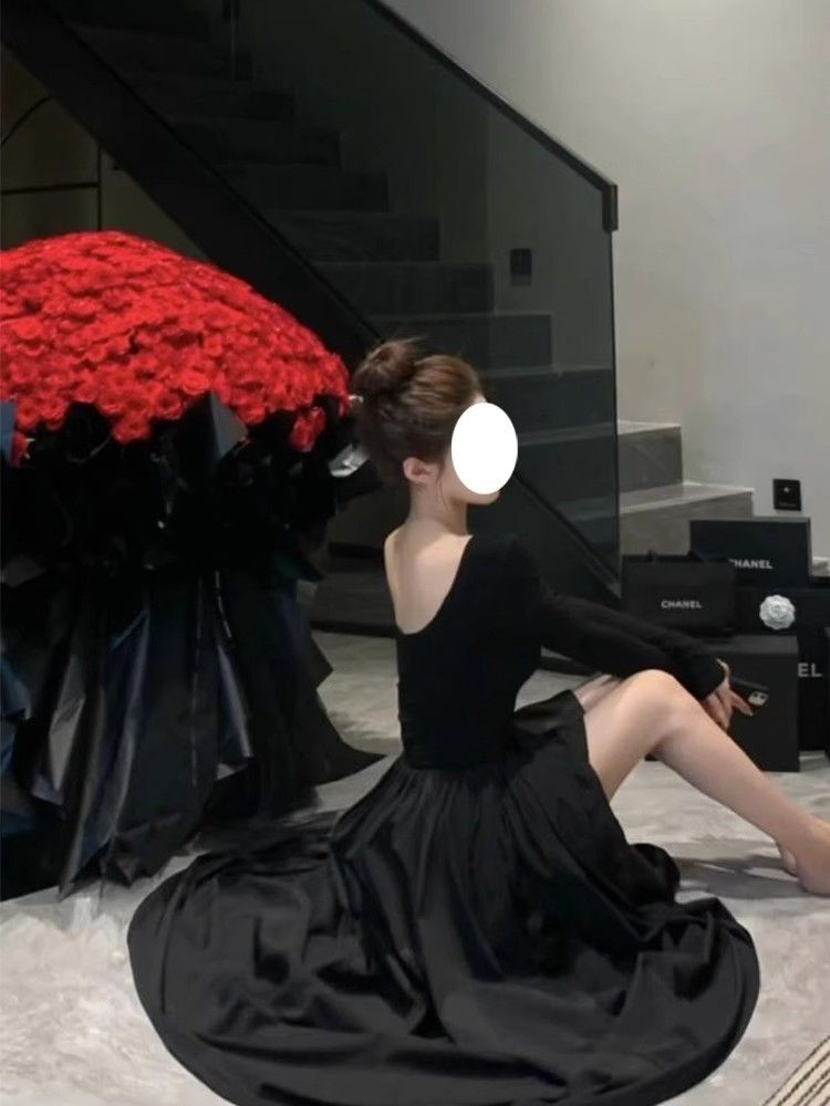 French-style elegant black dress for women, early autumn 2023, Hepburn style, sophisticated and slimming.
