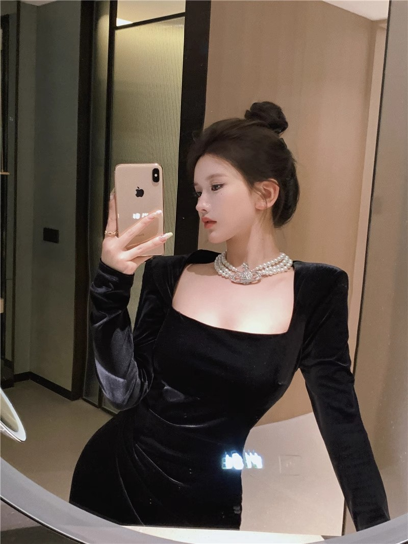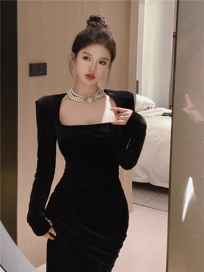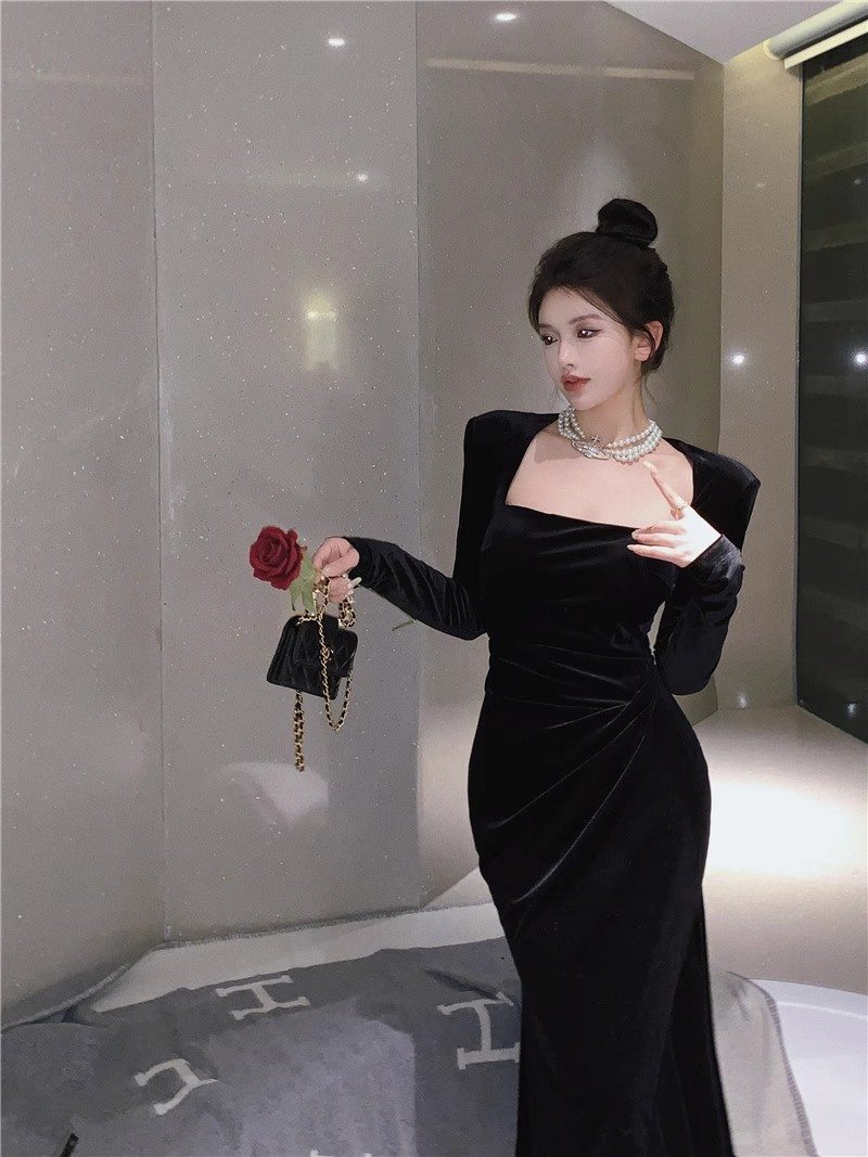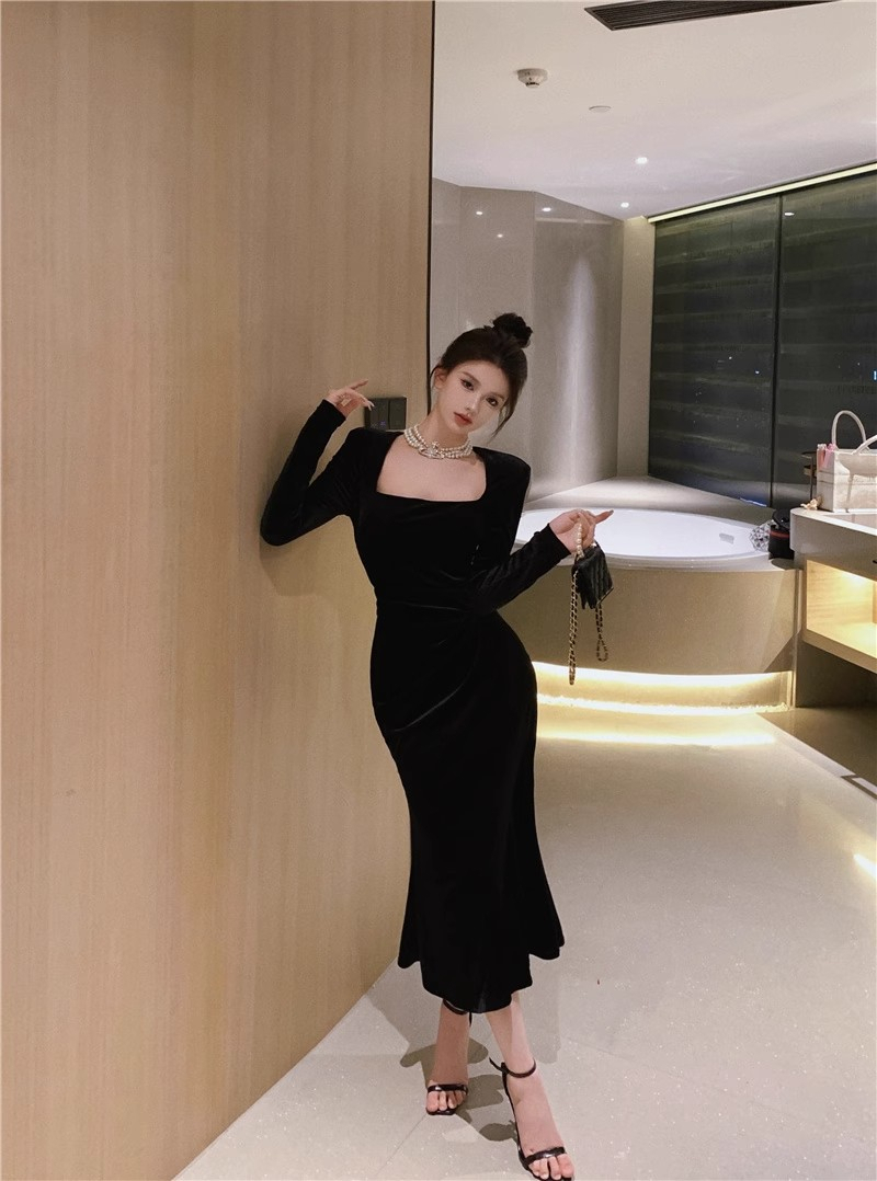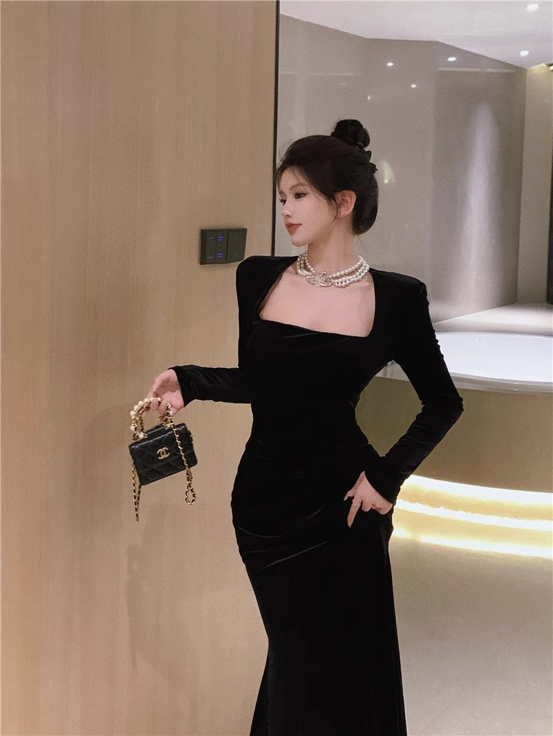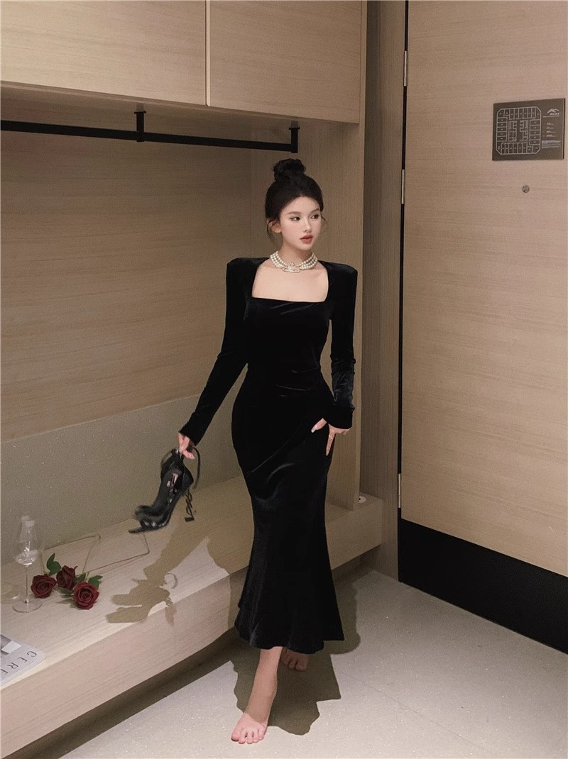 Sophisticated autumn/winter square neck velvet black dress for women, Hepburn style, French slimming fishtail bodycon long skirt