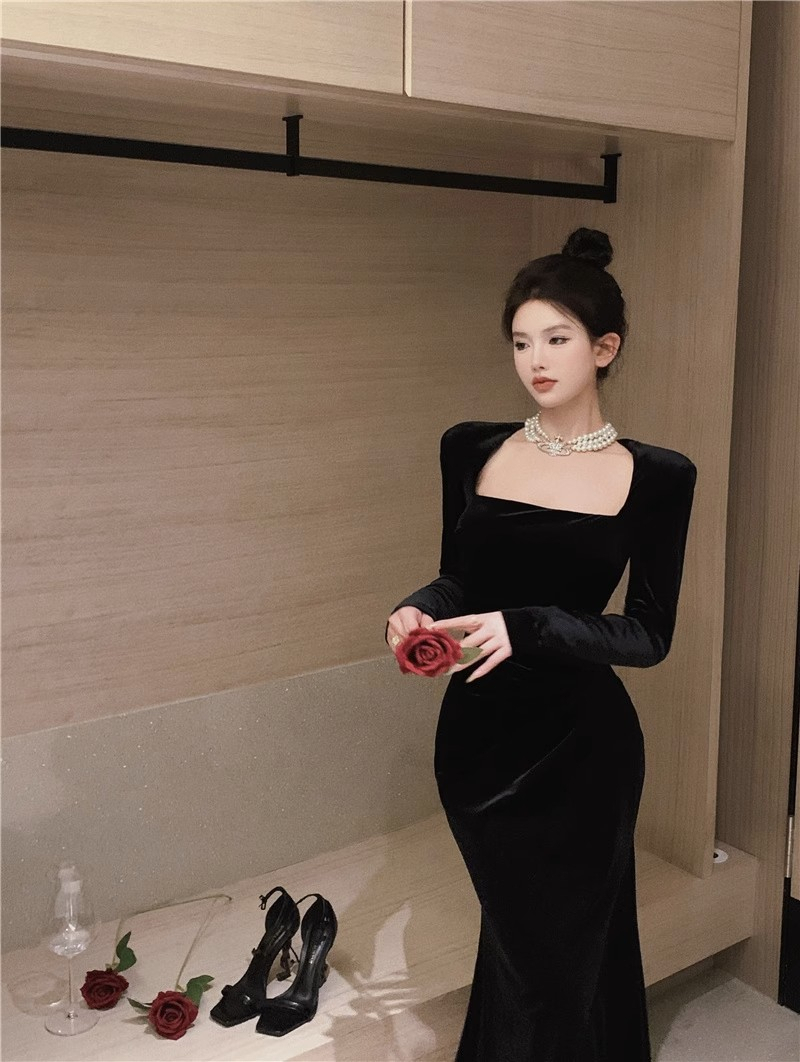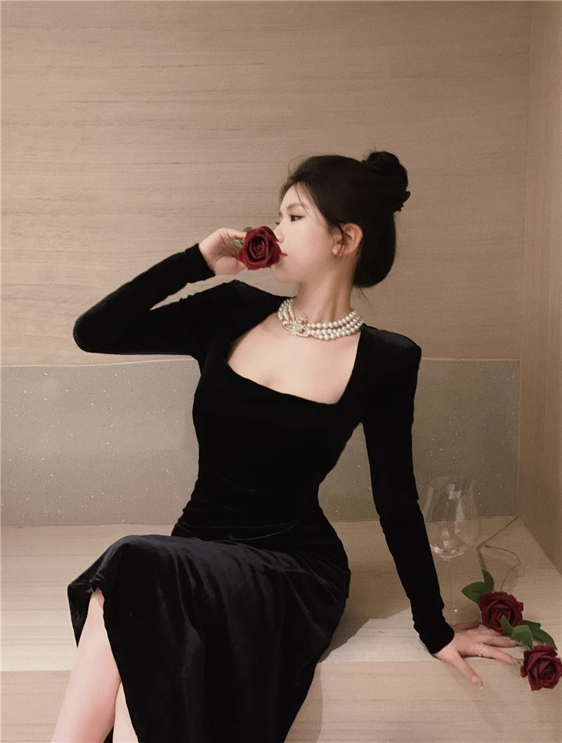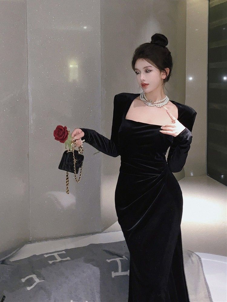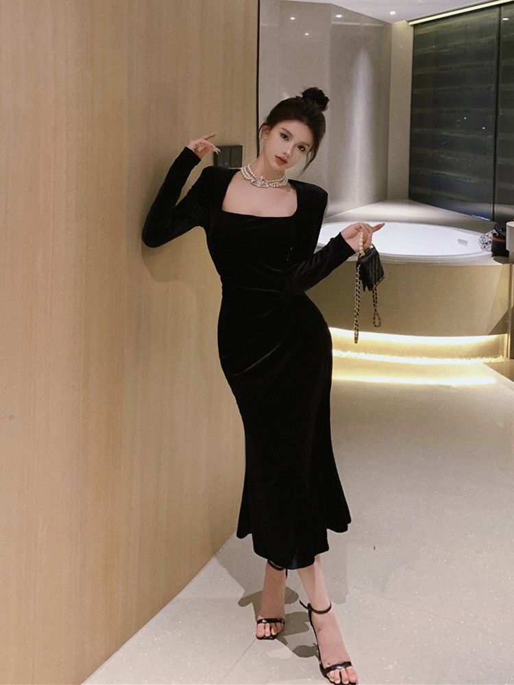 • Sophisticated autumn/winter square neck velvet black dress for women, Hepburn style, French slimming fishtail bodycon long skirt