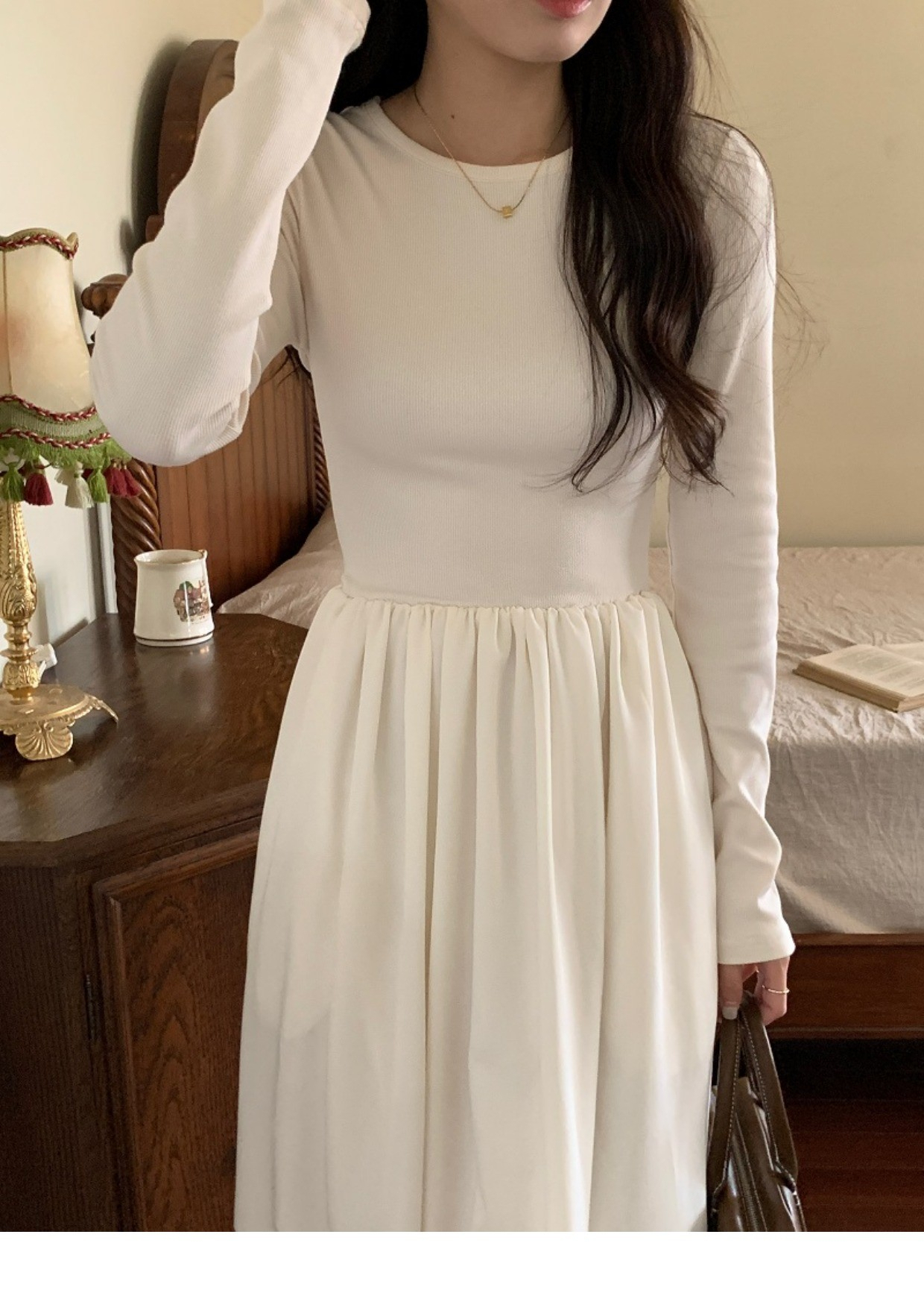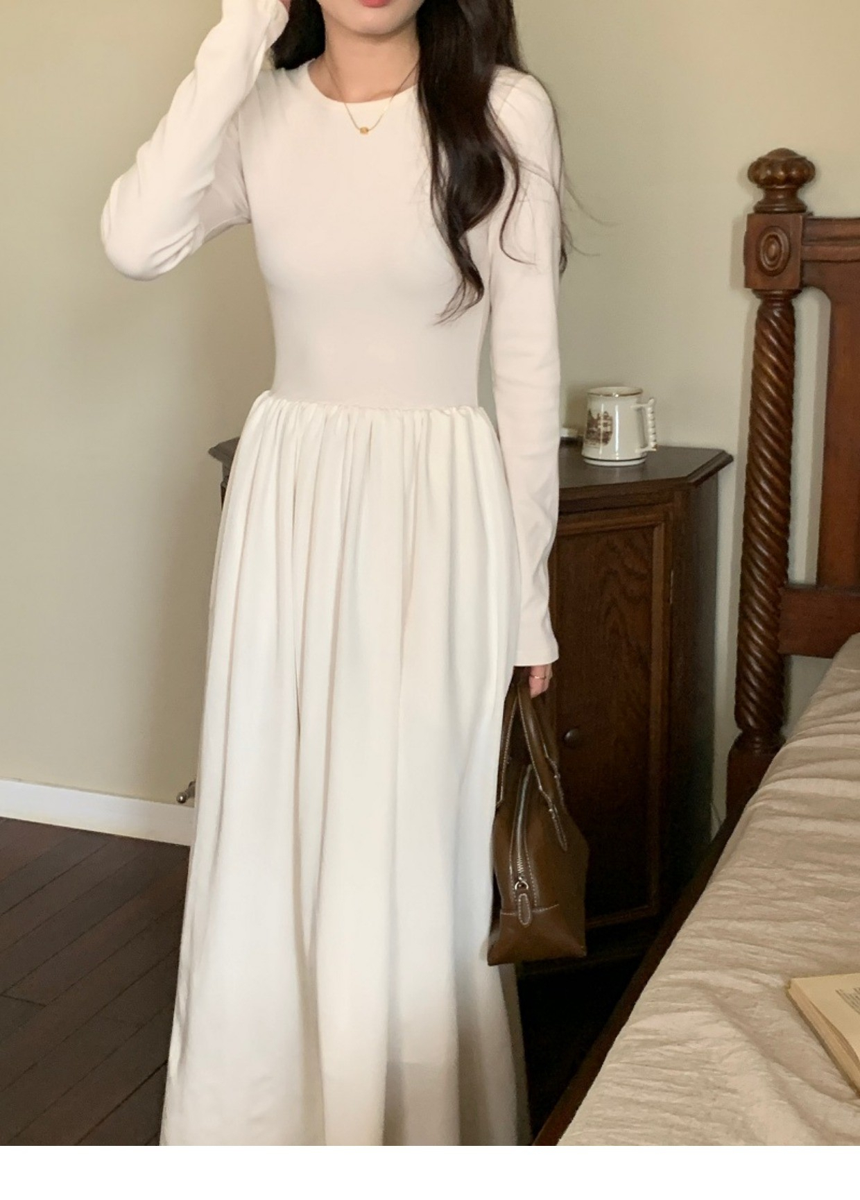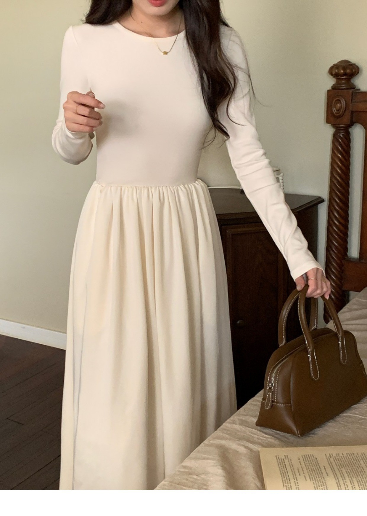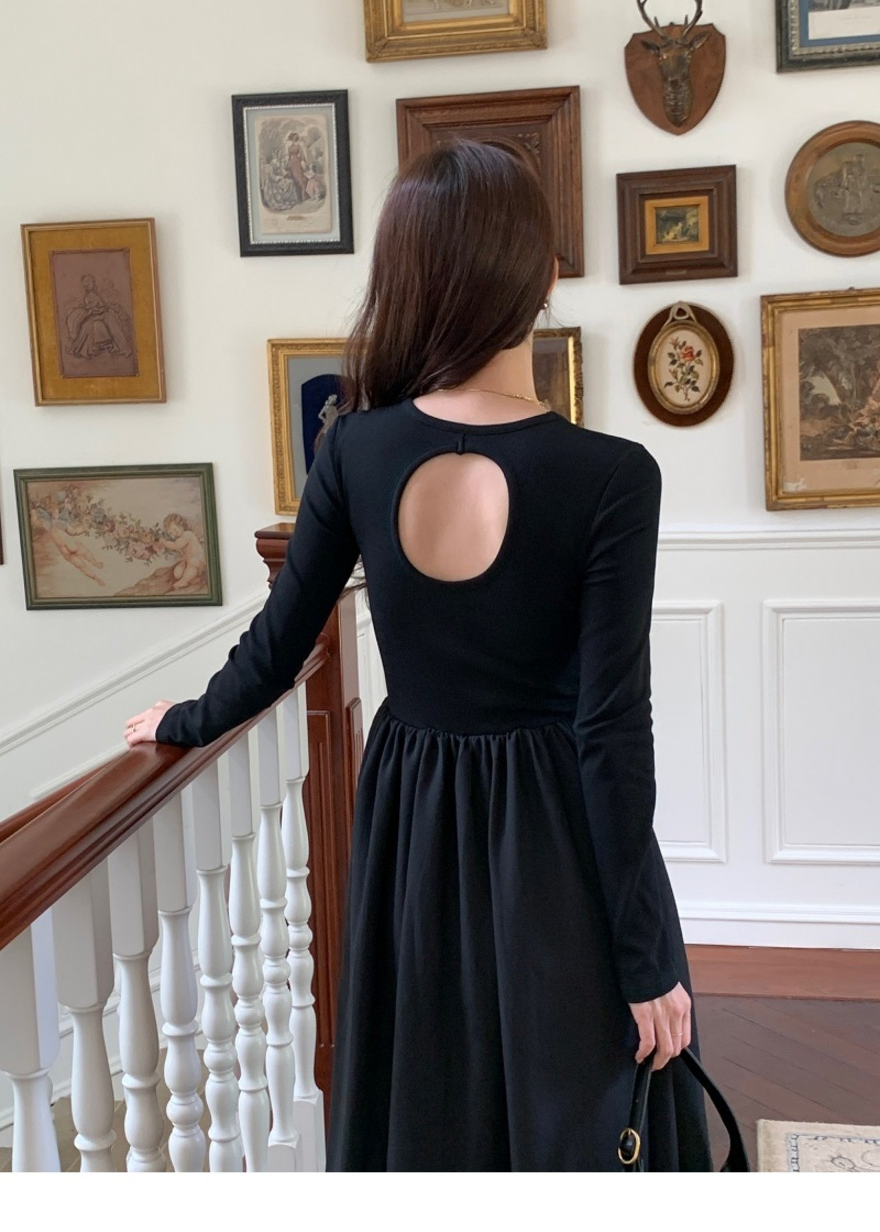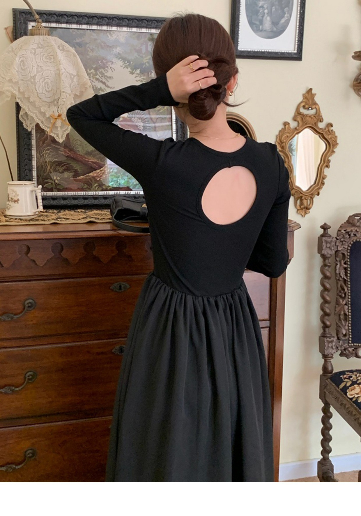 • A stylish backless long-sleeved fitted dress for early autumn, exuding French elegance with a round neck and a pullover design.