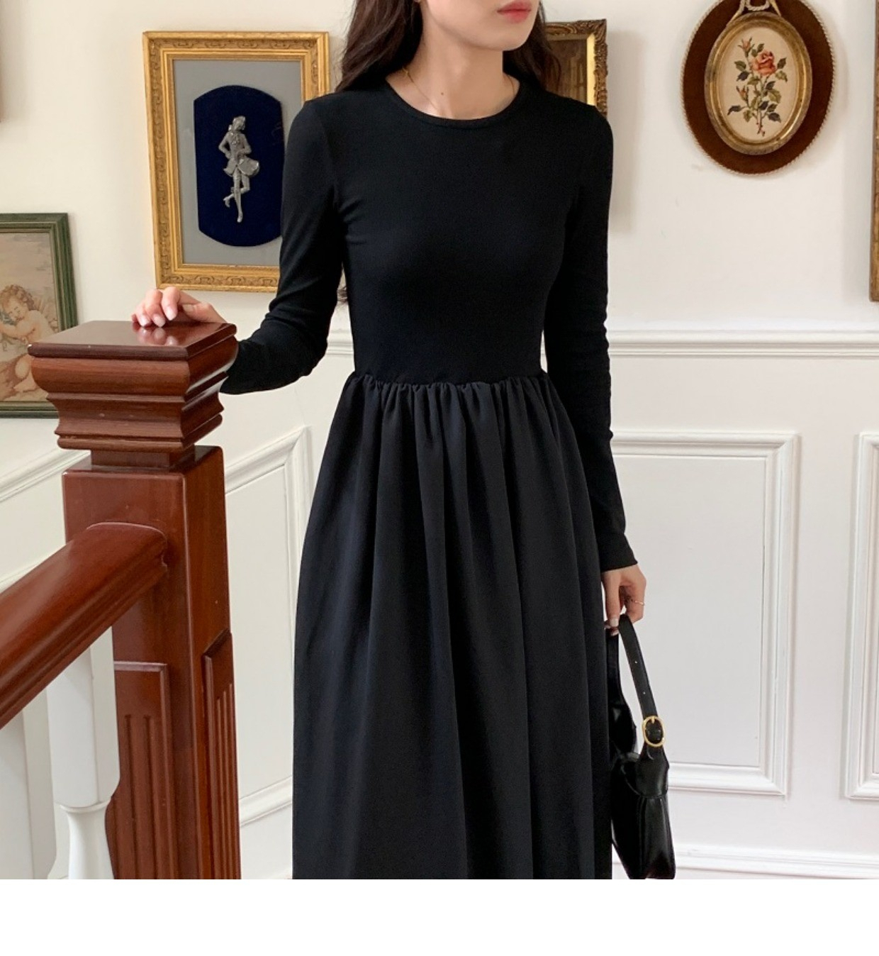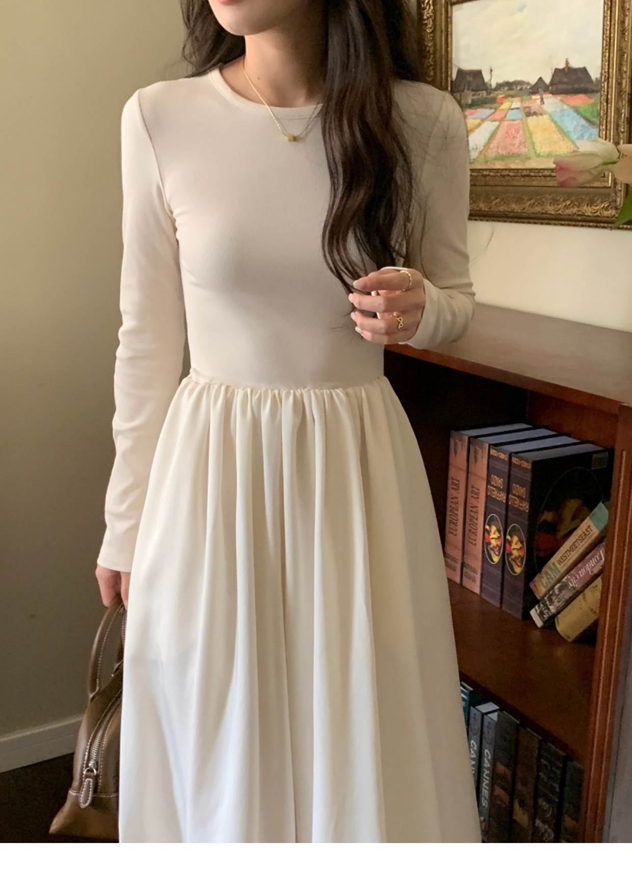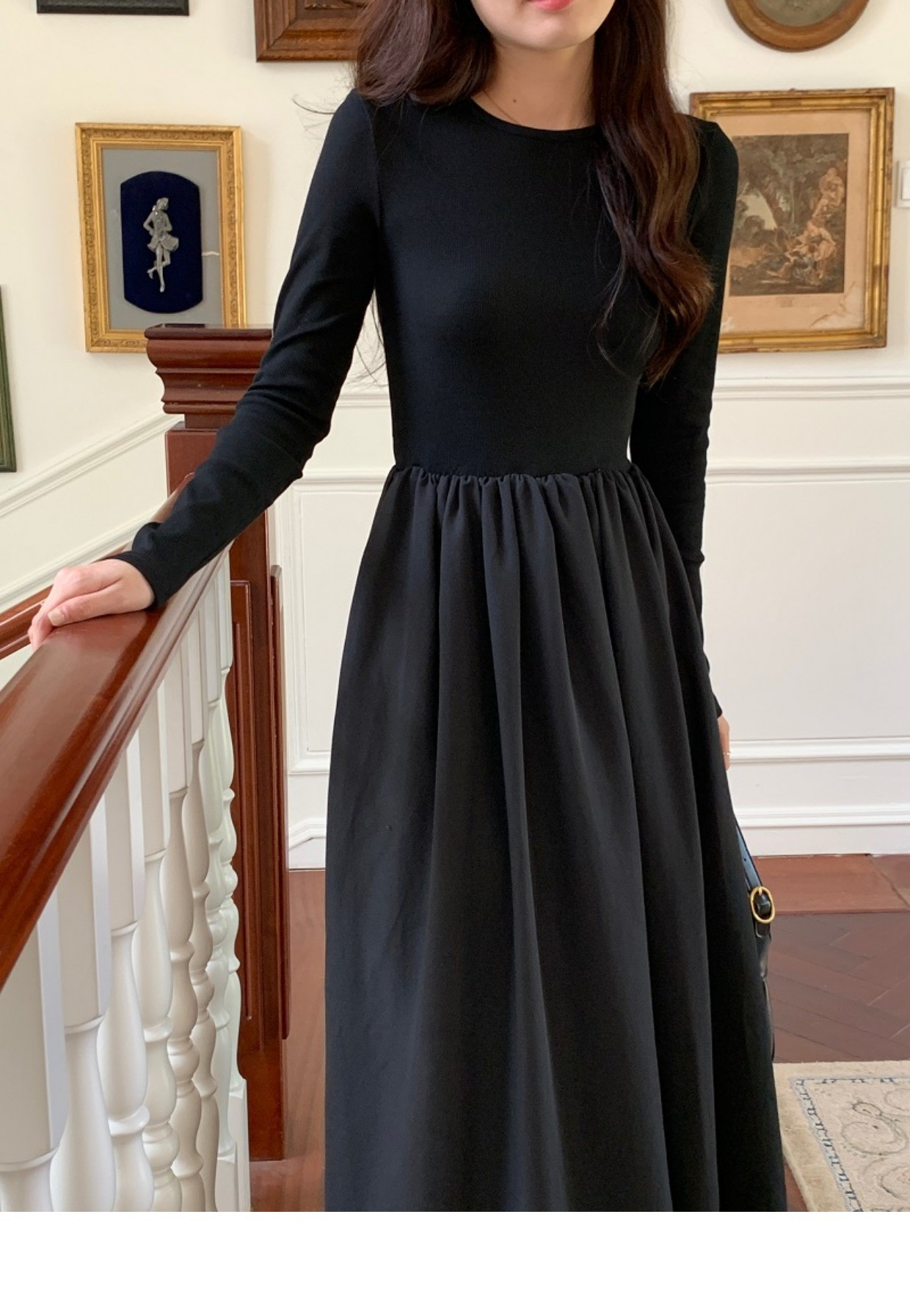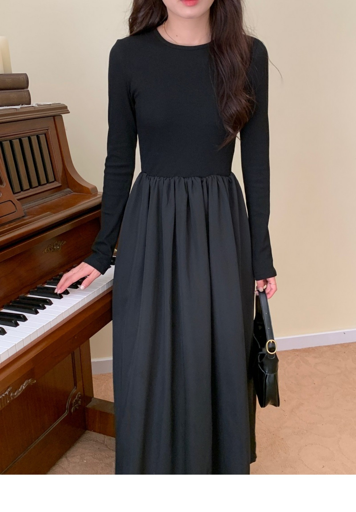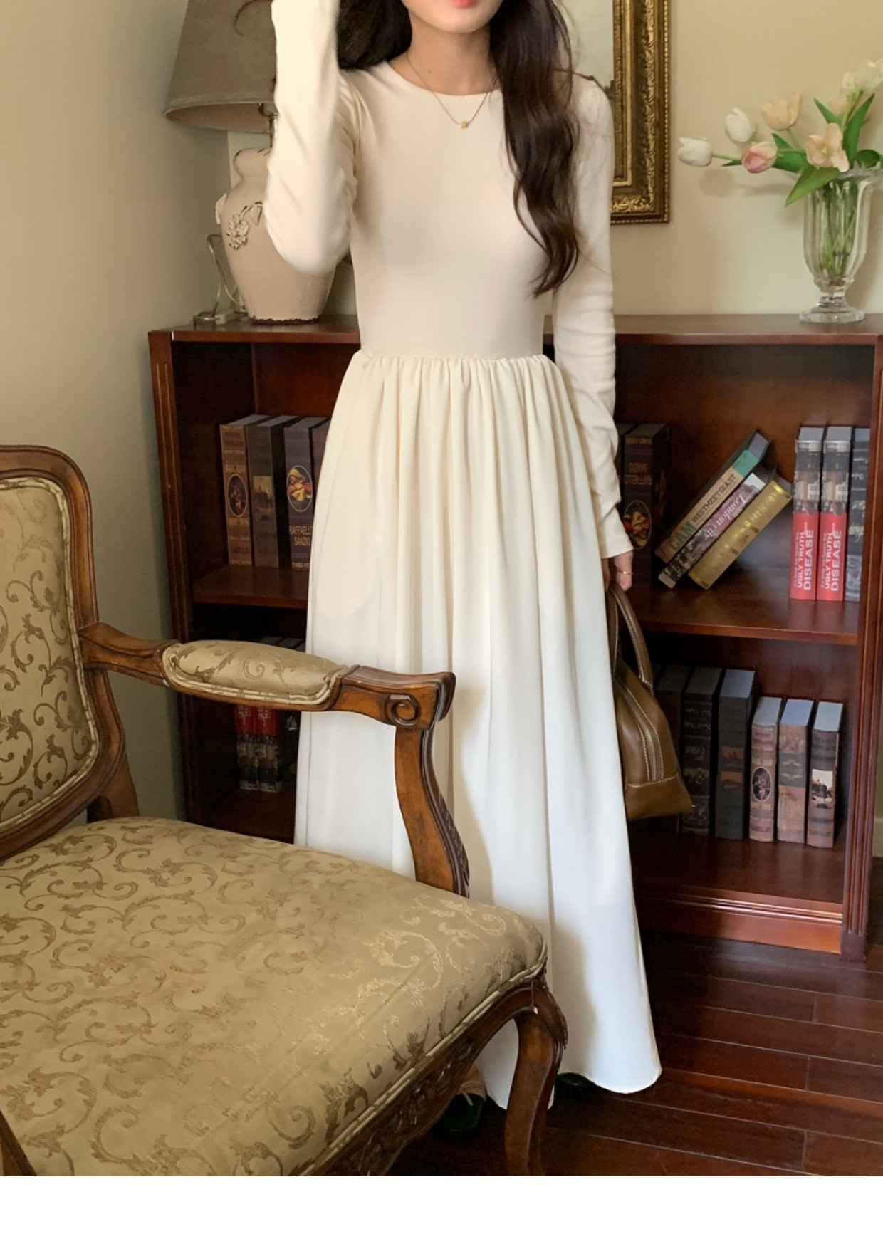 • A stylish backless long-sleeved fitted dress for early autumn, exuding French elegance with a round neck and a pullover design.