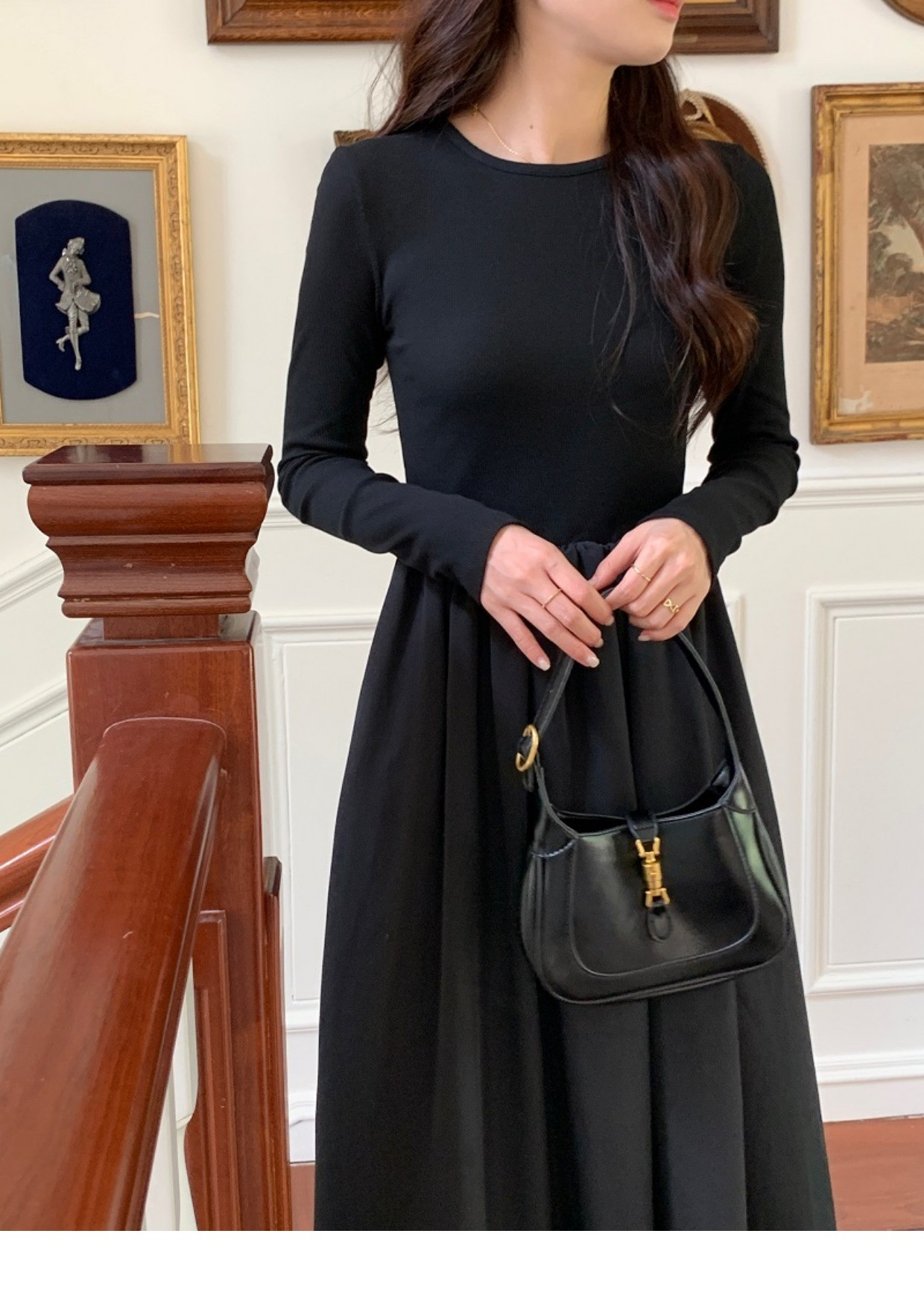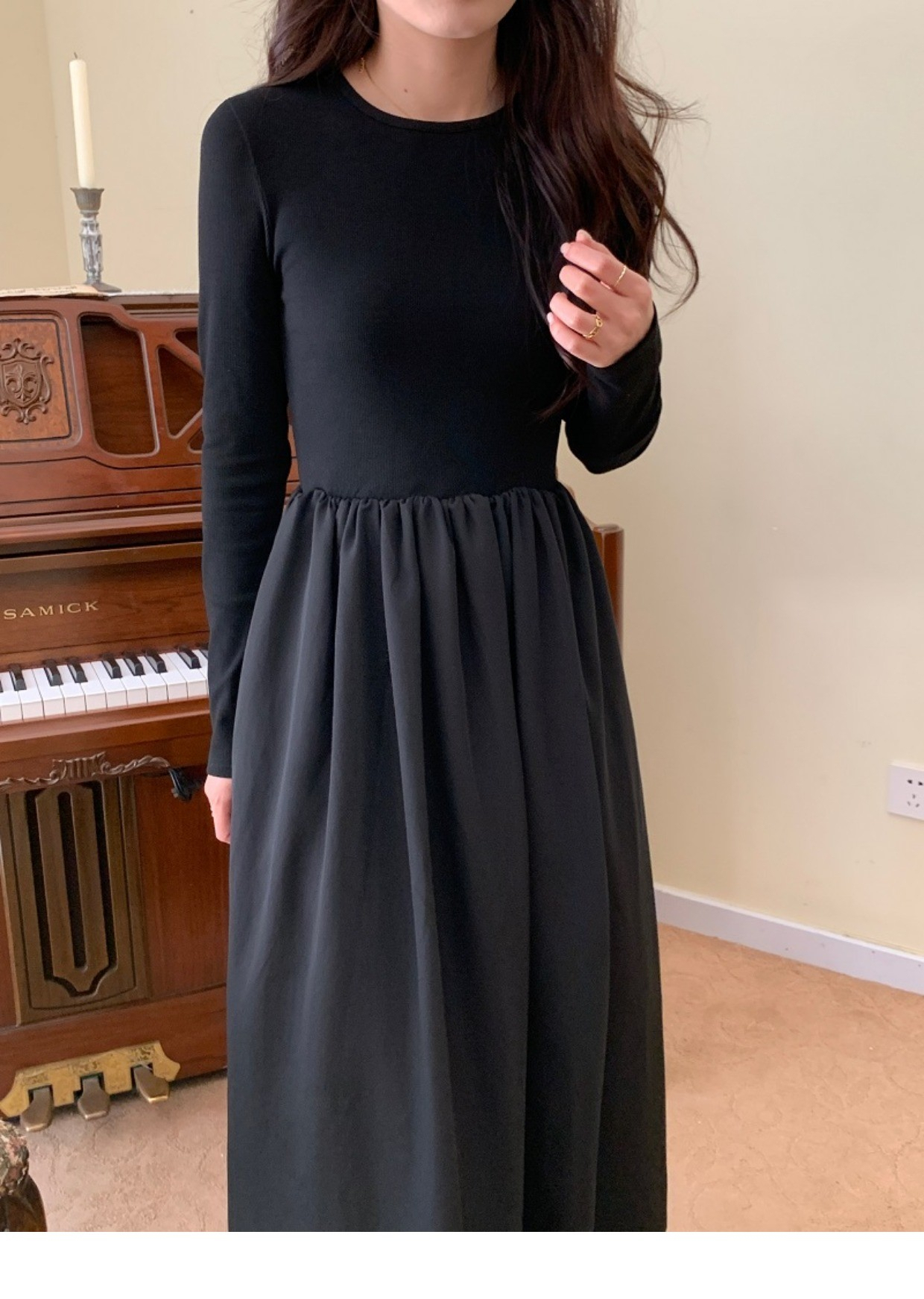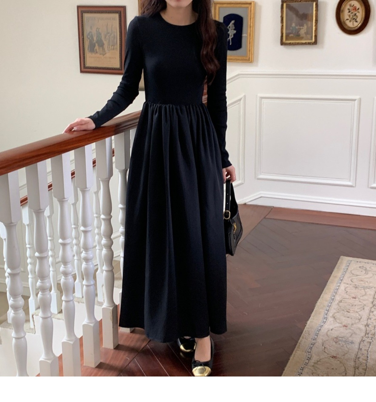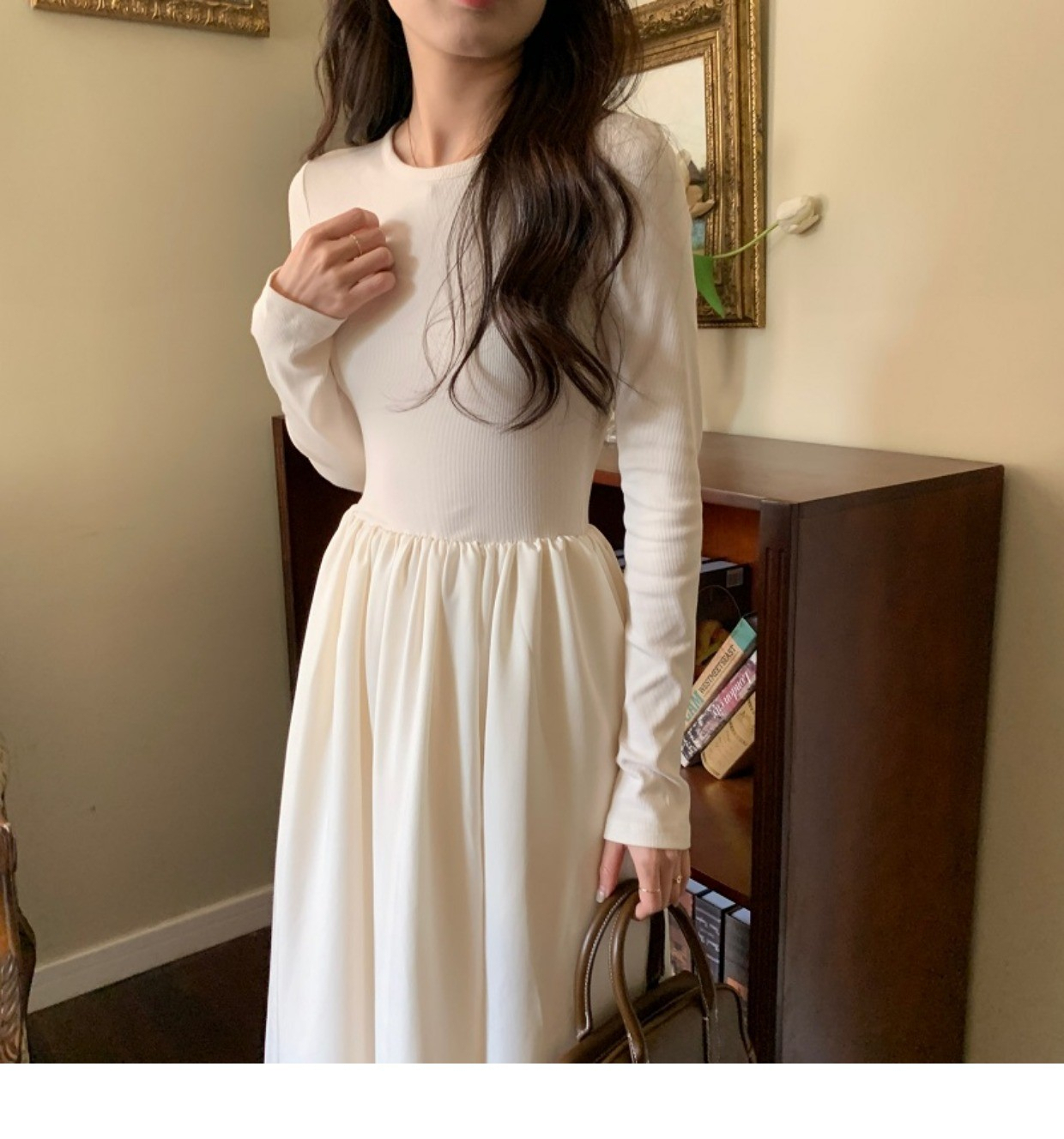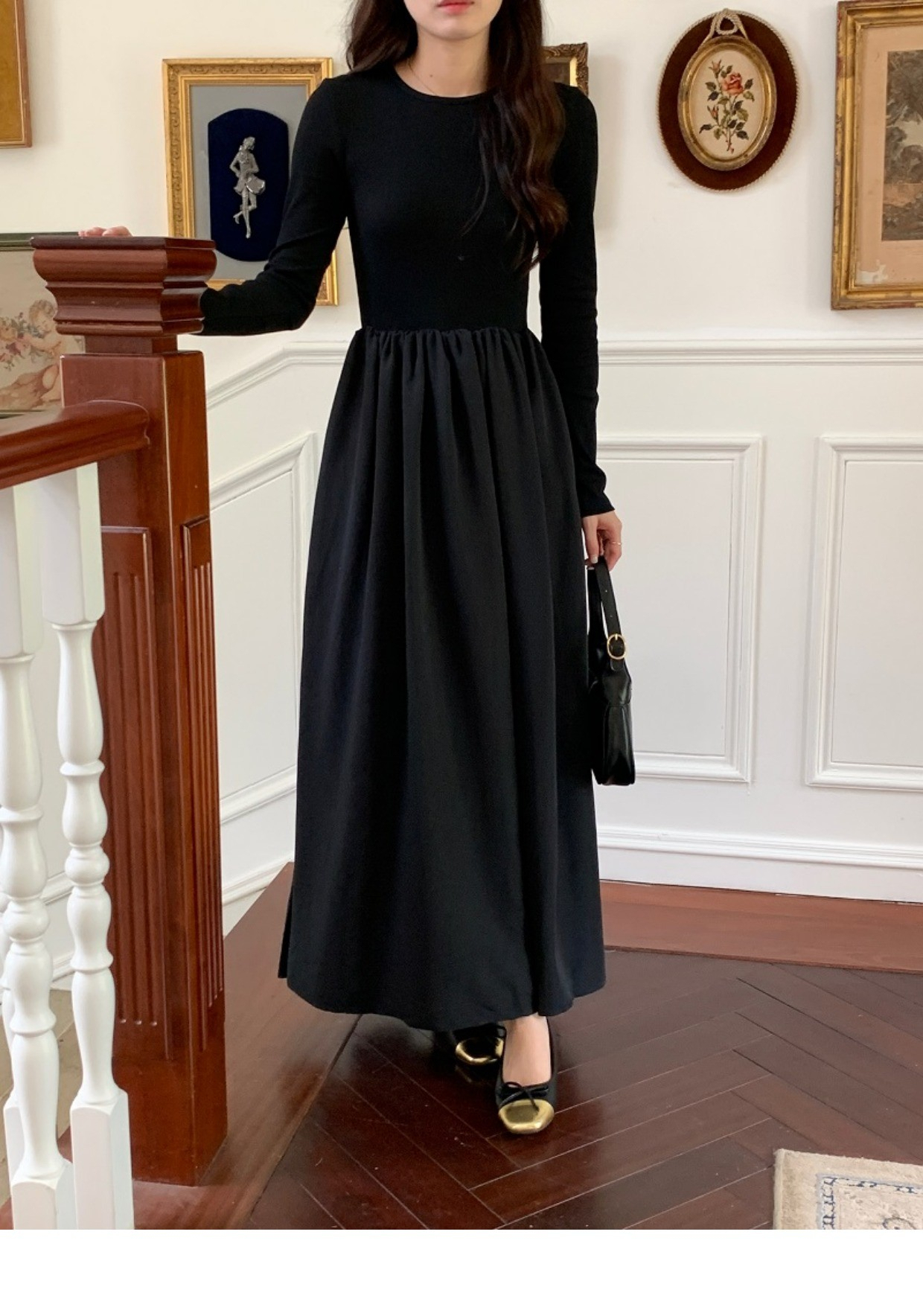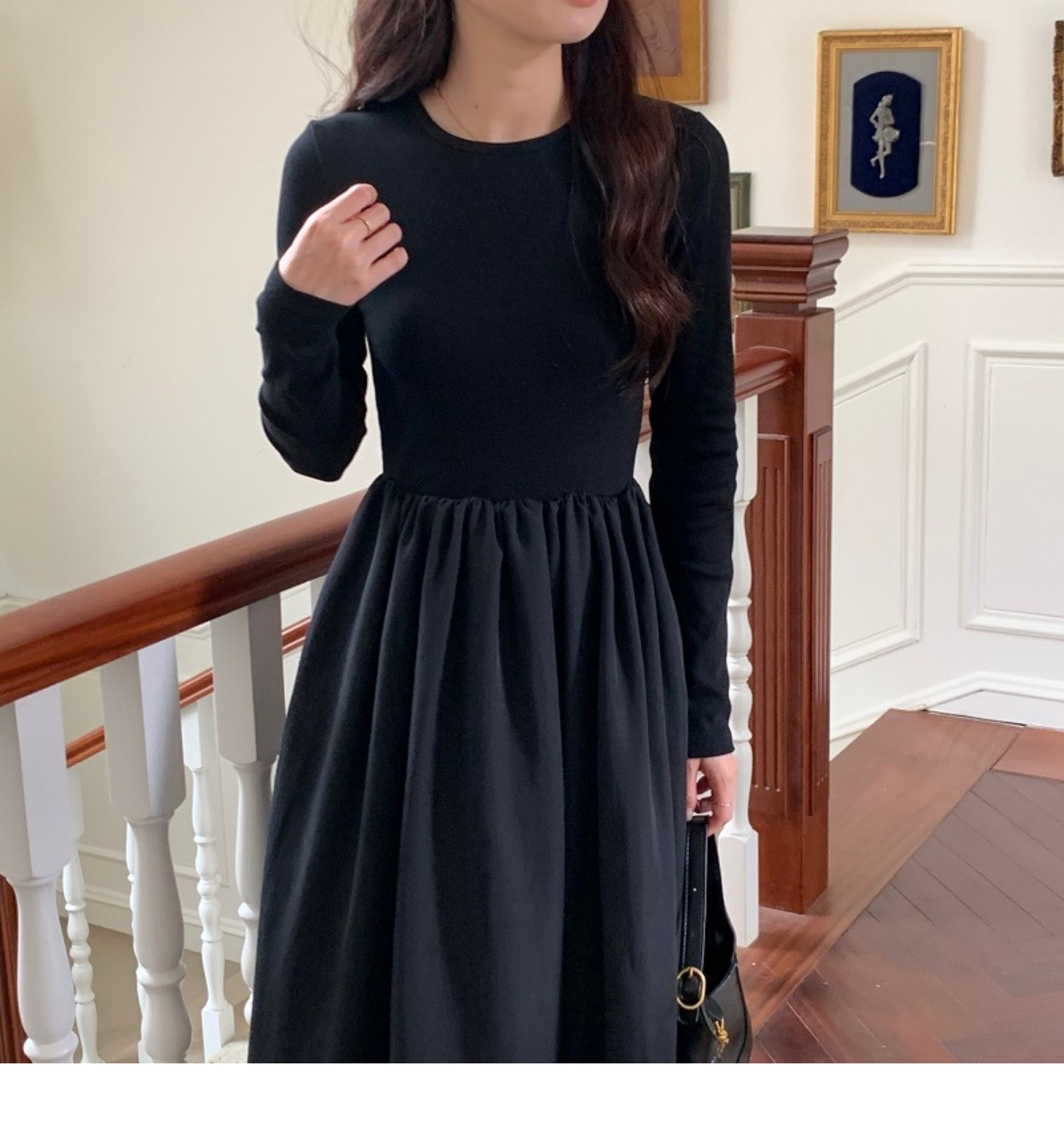 • A stylish backless long-sleeved fitted dress for early autumn, exuding French elegance with a round neck and a pullover design.