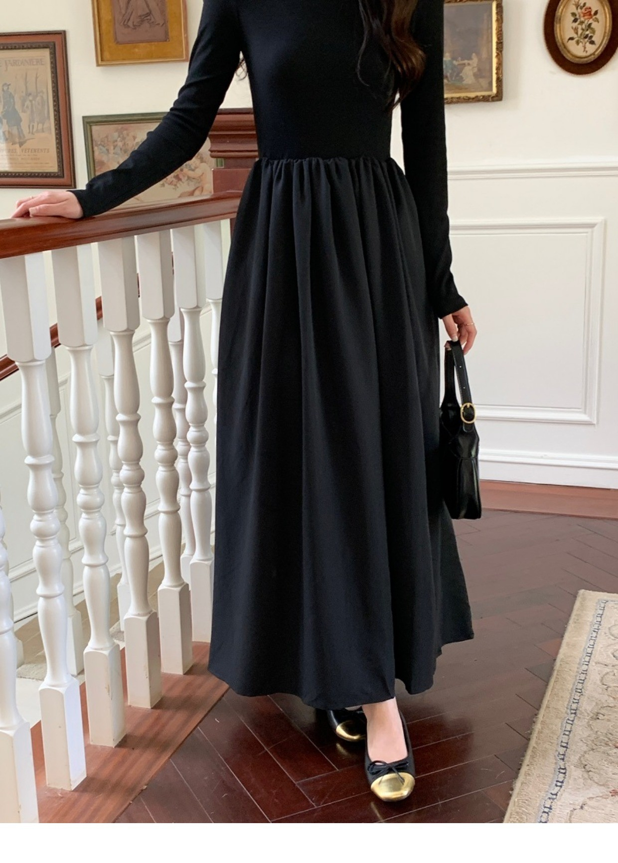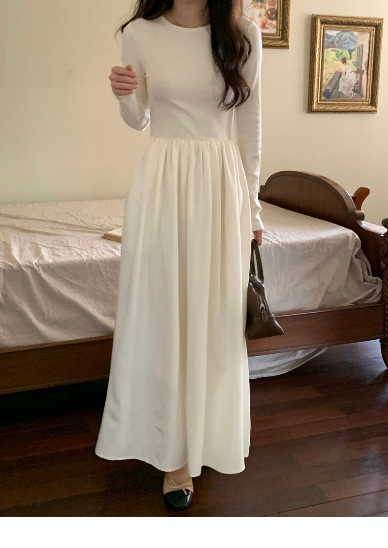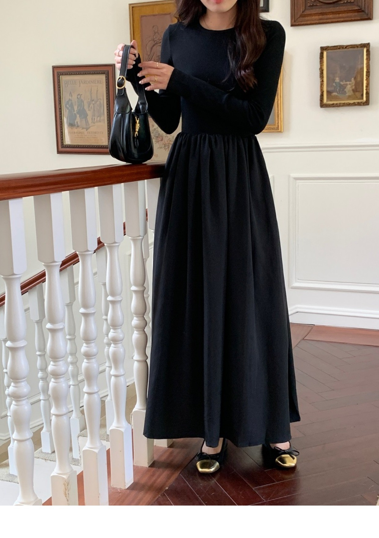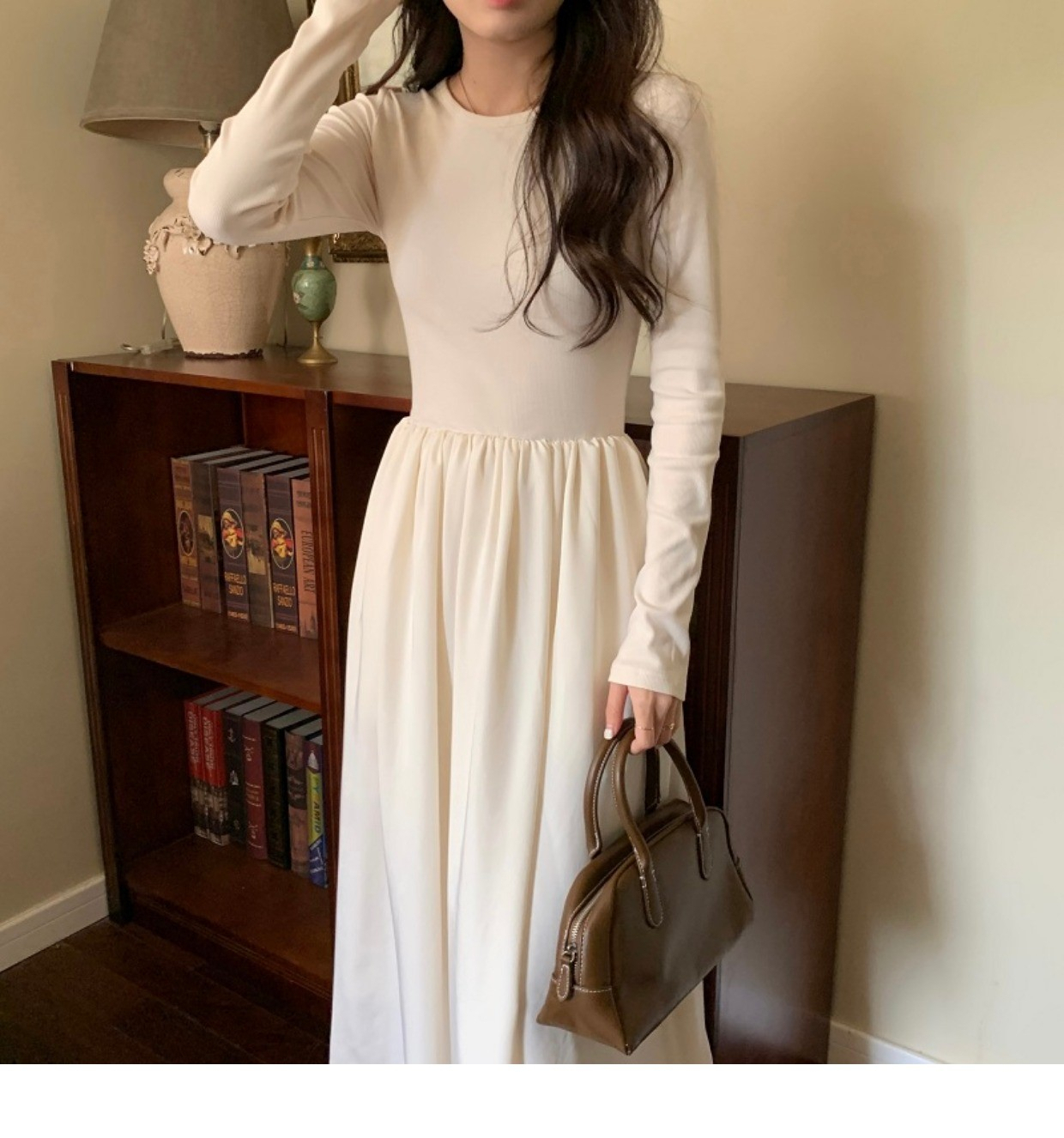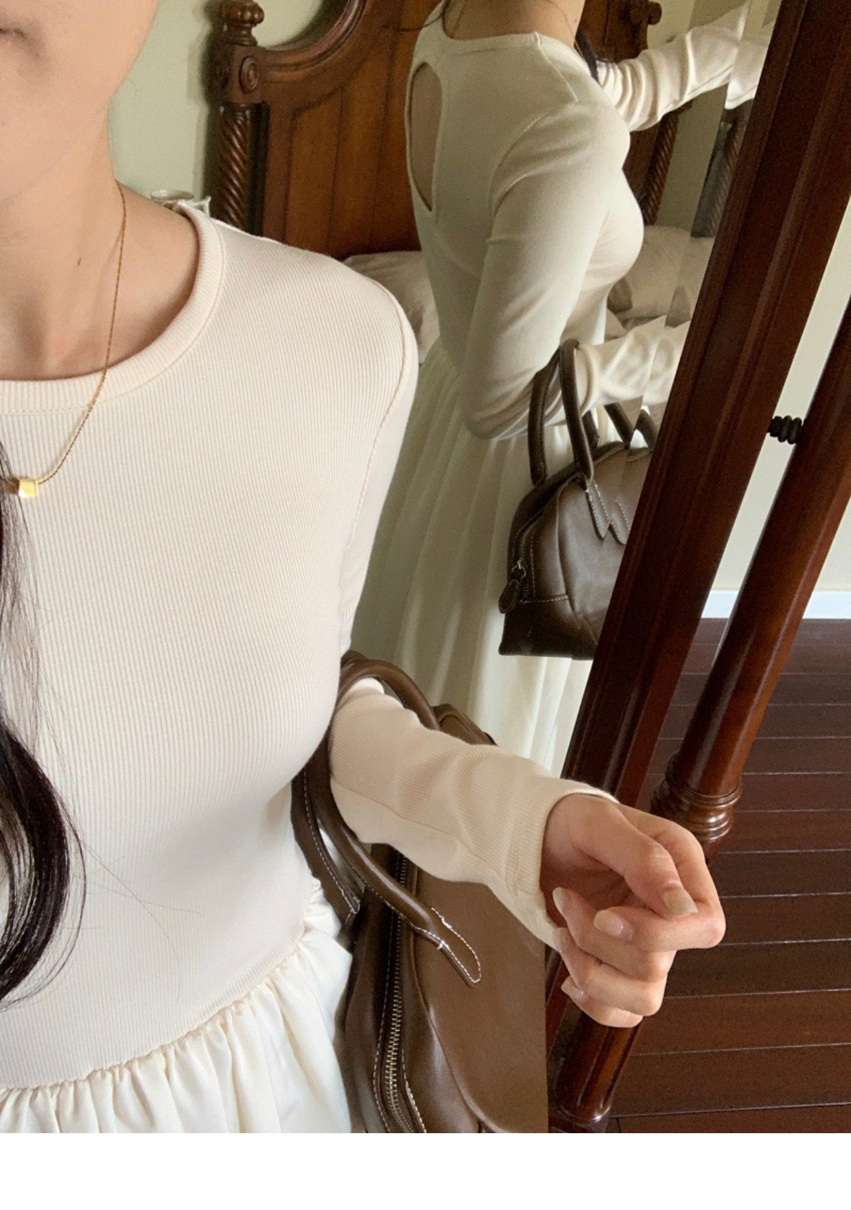 • A stylish backless long-sleeved fitted dress for early autumn, exuding French elegance with a round neck and a pullover design.